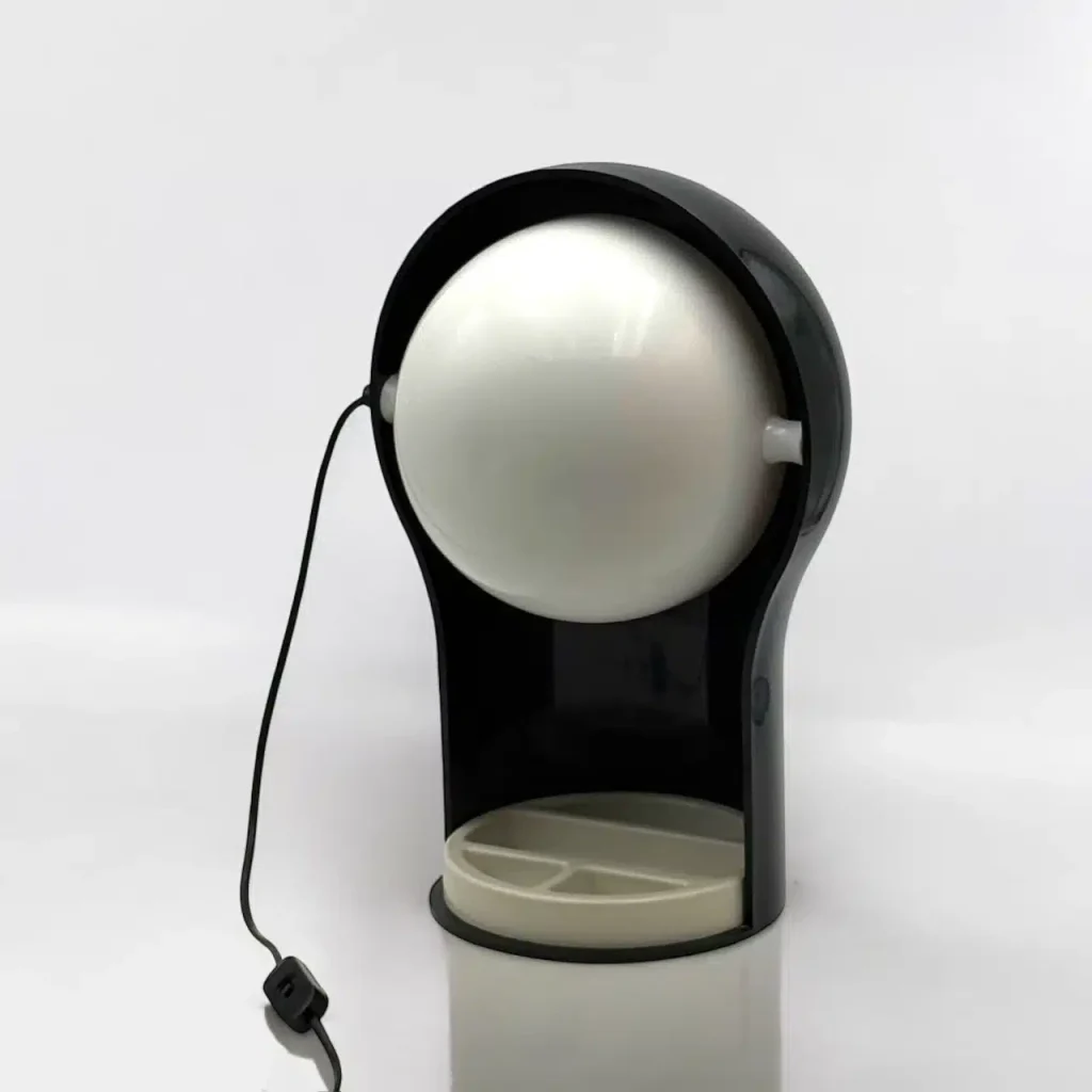 Like other space age creations, the innovation of this amazing 70s desk lamp was twofold. On one side, the use of innovative materials like melamine and PMMA. On the other side, the ingenious combination of funcional and intriguing shapes. The sculptural Telegono features a movable shell hinged to the plastic body, for direct and indirect lighting. As simple as ingenious! Moreover, the base has a movable compartment that can function as a catchall, adding convenience to this outstanding piece of design.