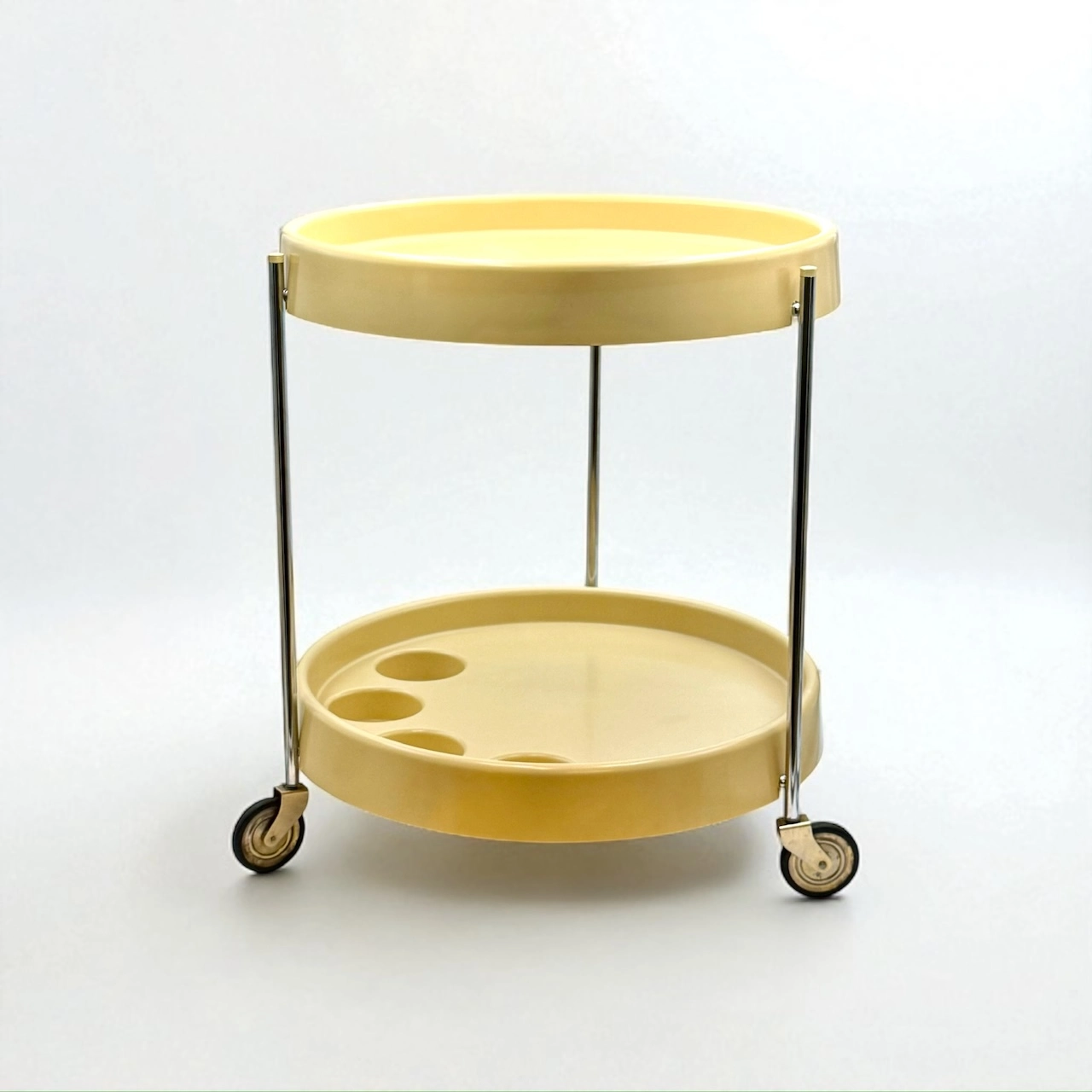 Entertaining, redefined. Our vintage bar carts and trolleys roll utility and style into one graceful object—chrome frames, lacquered plastics and smoked Plexiglas shelves with crisp edges and satisfying handles. Designed through the 60s and 70s in Italy and across Europe, many pieces feature modular trays, bottle holders or hidden compartments that suit small apartments and generous salons alike. We confirm wheel action, shelf stability and surface condition; gentle patina is preserved where it complements the design. This category also hosts the occasional side table or compact desk when form and function align. Whether used for drinks, coffee service or a nimble hi-fi station, vintage bar carts bring movement, shine and order to a room.