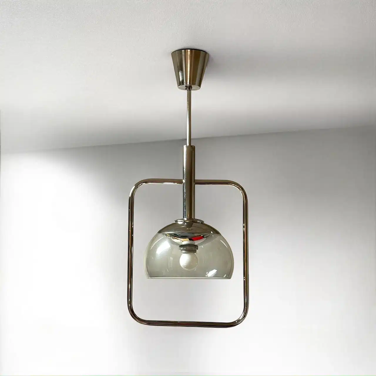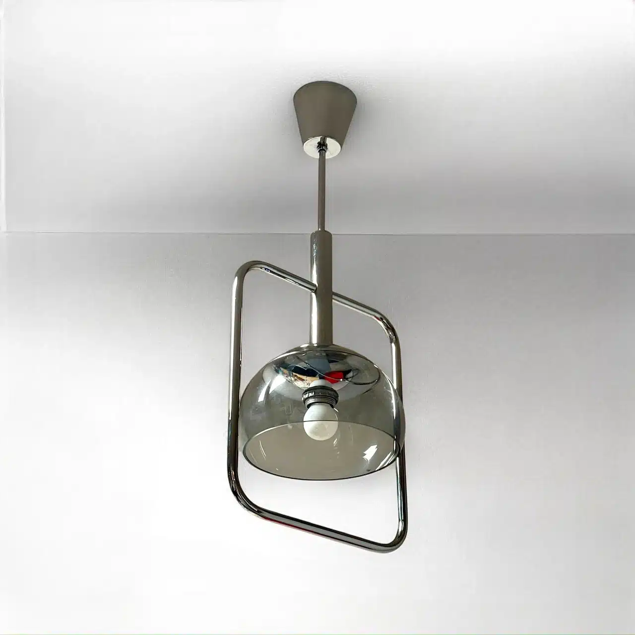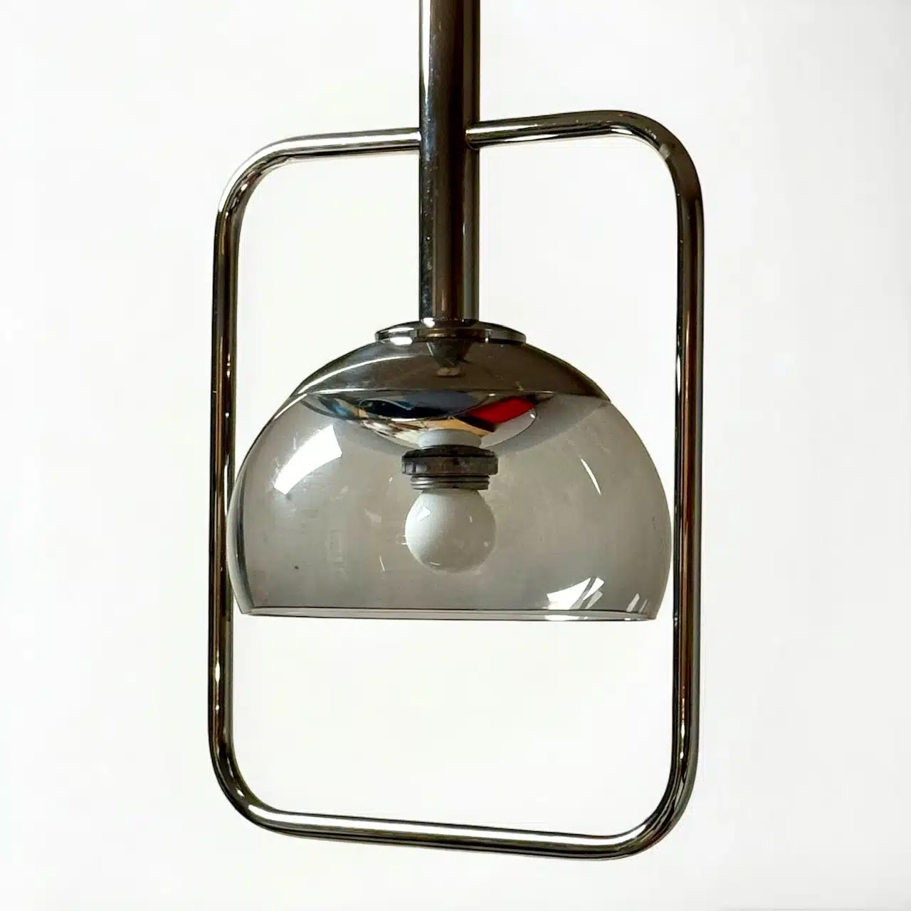 Elevate your space with this 1970s pendant lamp, a striking example of Italian design from the golden era of modern lighting. Featuring a smoked plexiglass diffuser, this lamp creates a warm, atmospheric glow while maintaining a sleek and futuristic aesthetic. The chrome-plated metal structure, including the integrated stem and canopy, adds a polished, sophisticated touch.