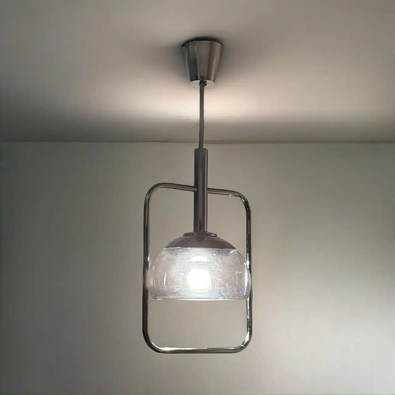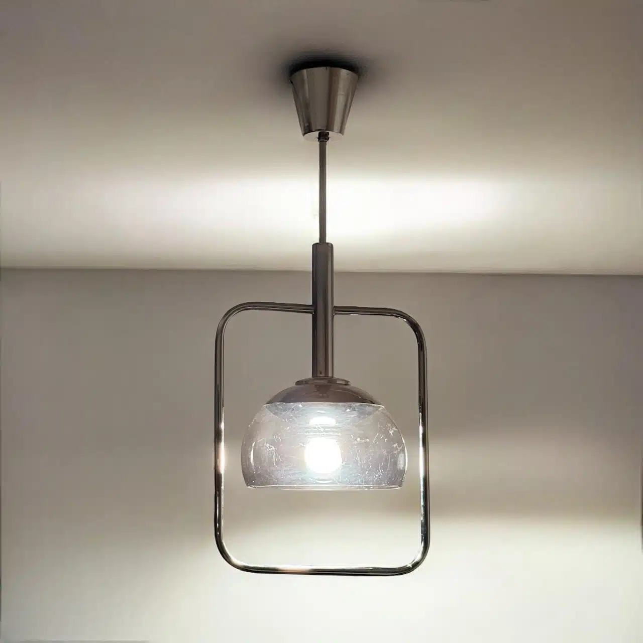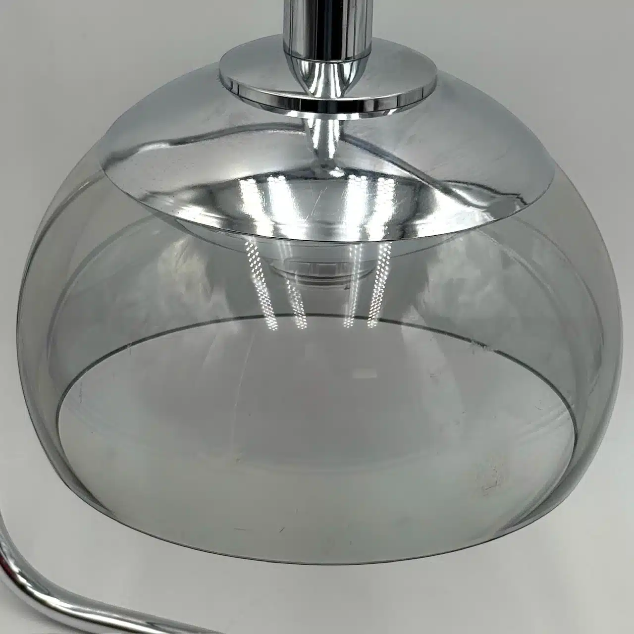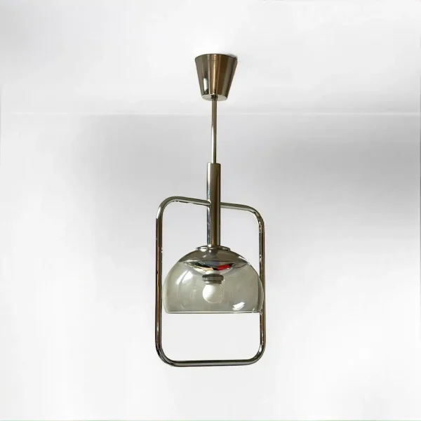 Elevate your space with this 1970s pendant lamp, a striking example of Italian design from the golden era of modern lighting. Featuring a smoked plexiglass diffuser, this lamp creates a warm, atmospheric glow while maintaining a sleek and futuristic aesthetic. The chrome-plated metal structure, including the integrated stem and canopy, adds a polished, sophisticated touch.