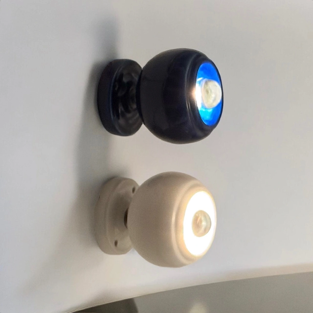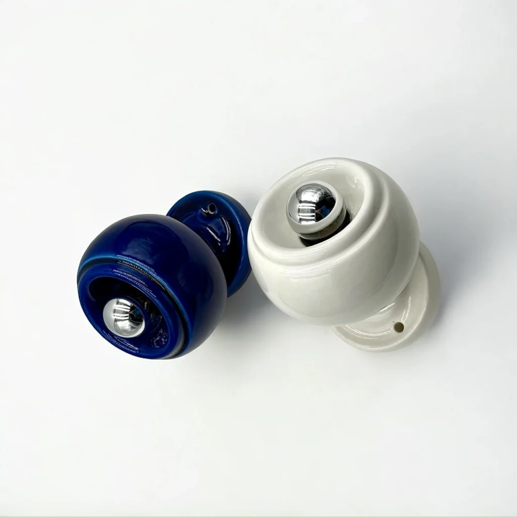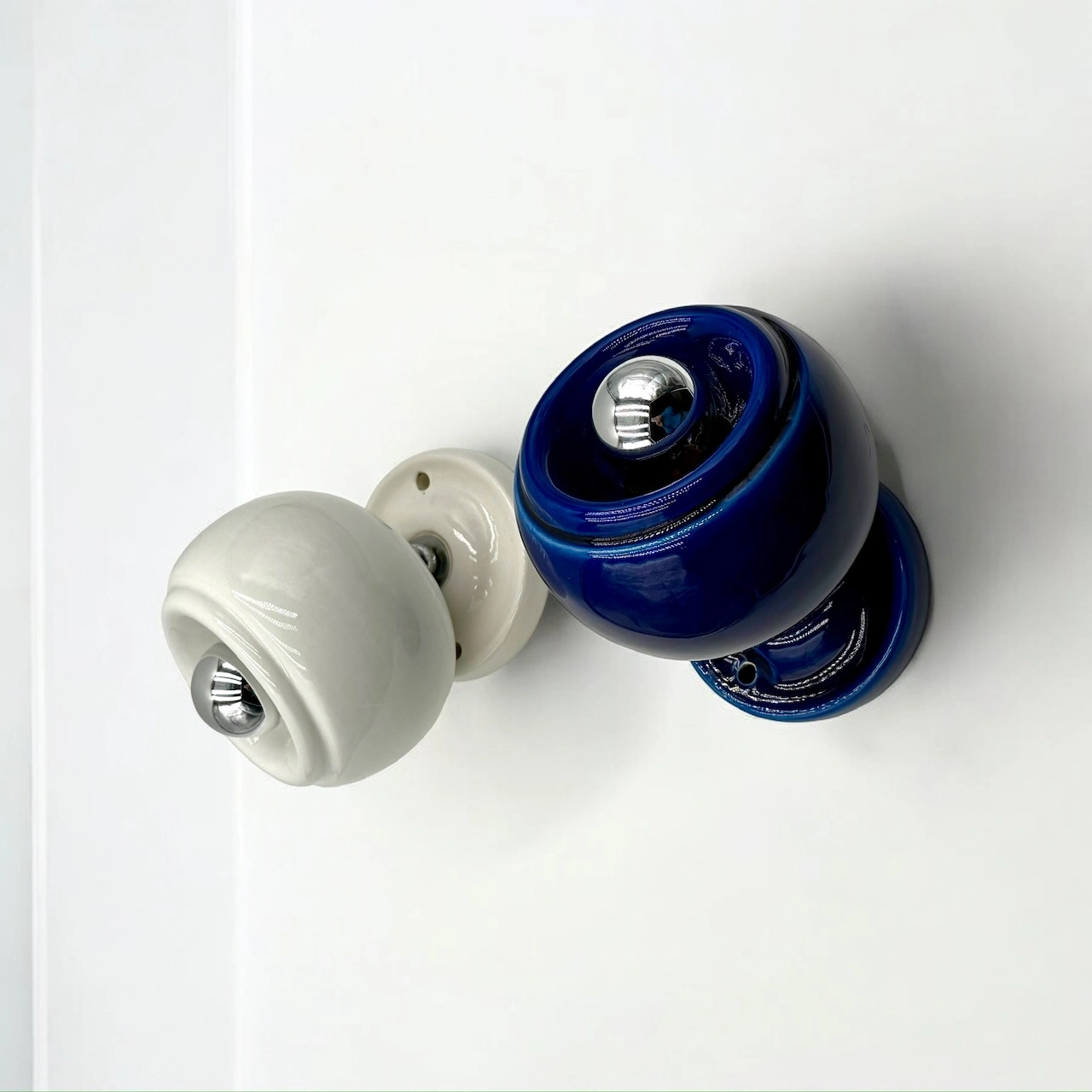 Originally designed as wall-mounted fixtures, their versatile structure allows them to be used as table lamps, offering multiple styling options. A practical metal joint enables precise light direction adjustment, combining functionality with design appeal. Fitted with mirrored E14 bulbs, they produce a stunning eyeball effect, a hallmark of the Space Age era.