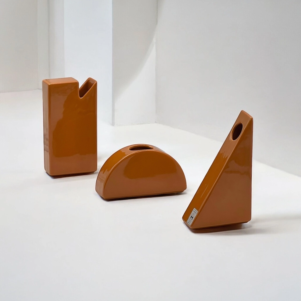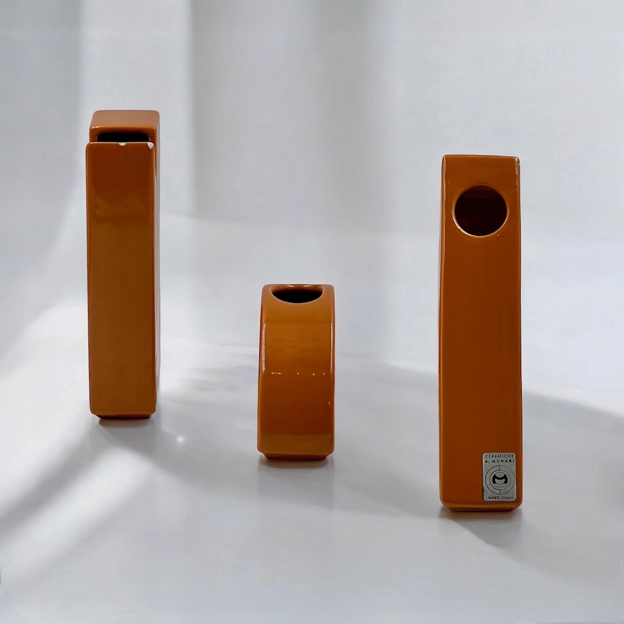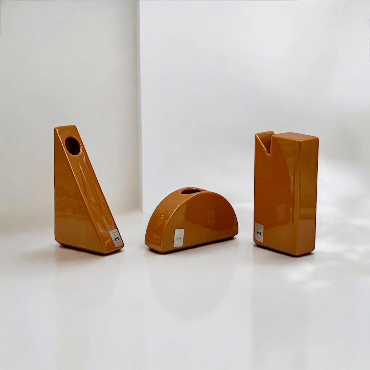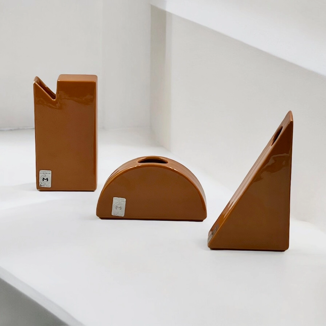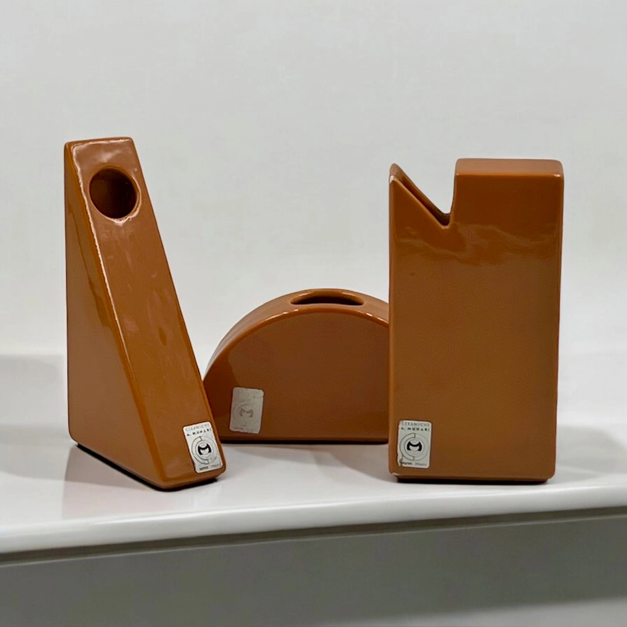 item. ceramic vasesdesigner. antonio munarimaker. ceramiche munariperiod. 1970scountry. Italymaterial. ceramiccolor. dark orangedimensions (cm). rectangle 19x10x4.5 cm, triangle 19.5×11.5×5 cm, hemisphere 17x9x4.5 cm.condition. very good vintage conditions. the rectangular vase bears a few minor chips (see pictures).art. no. 1520