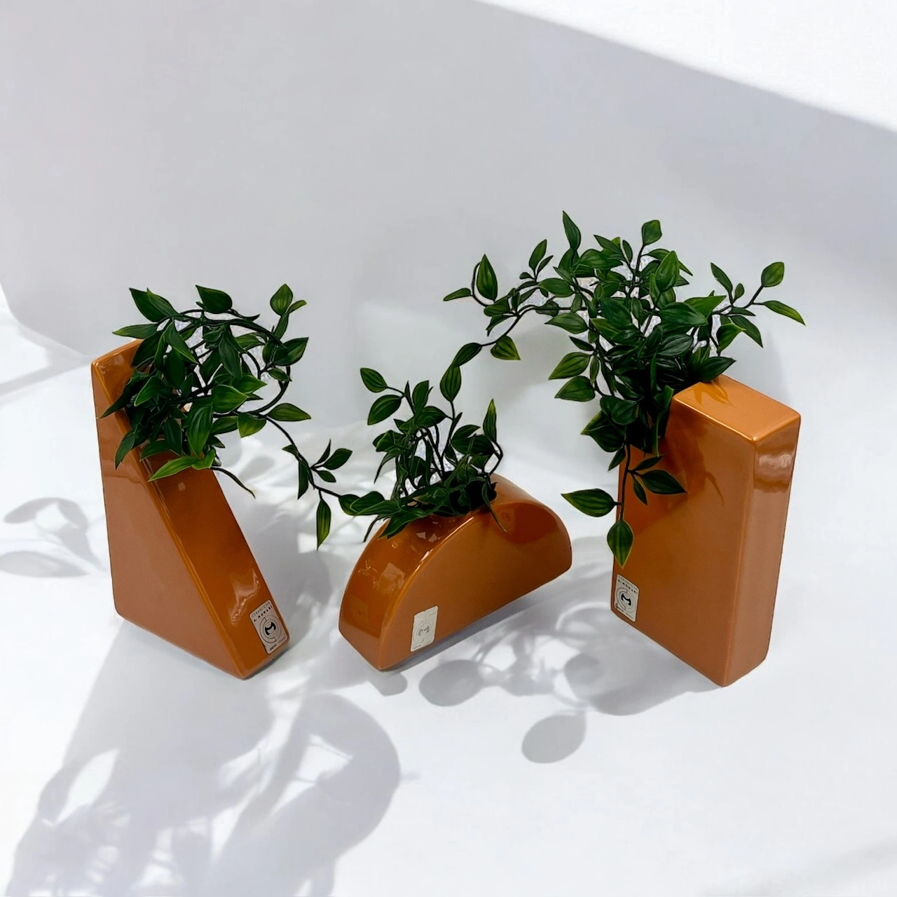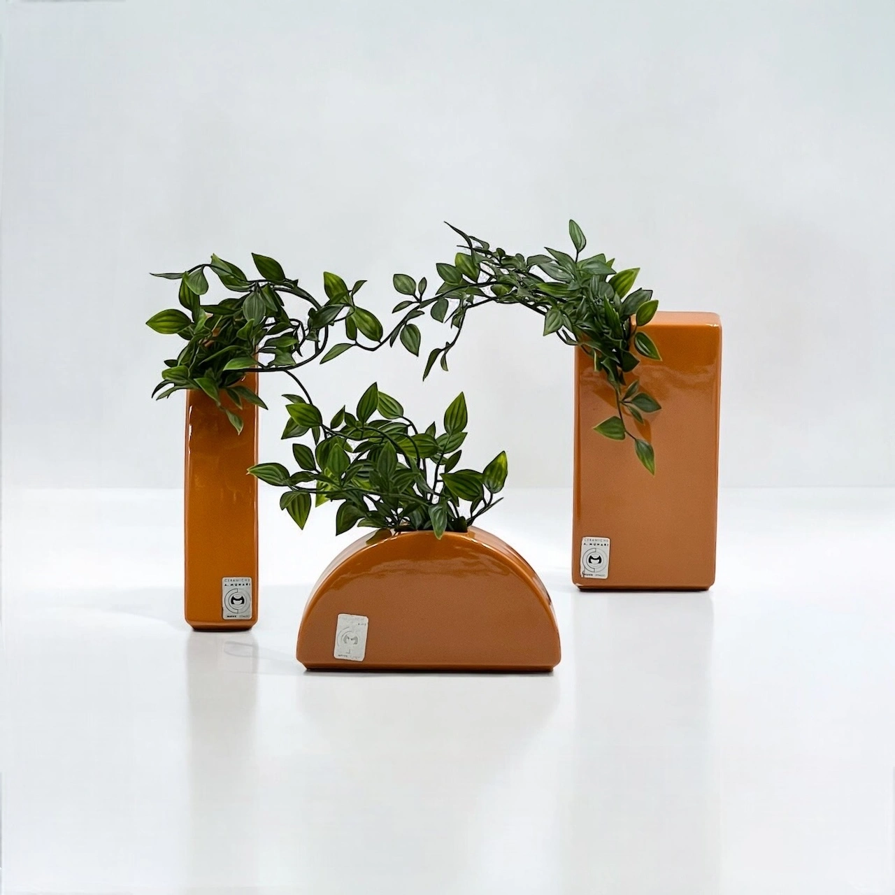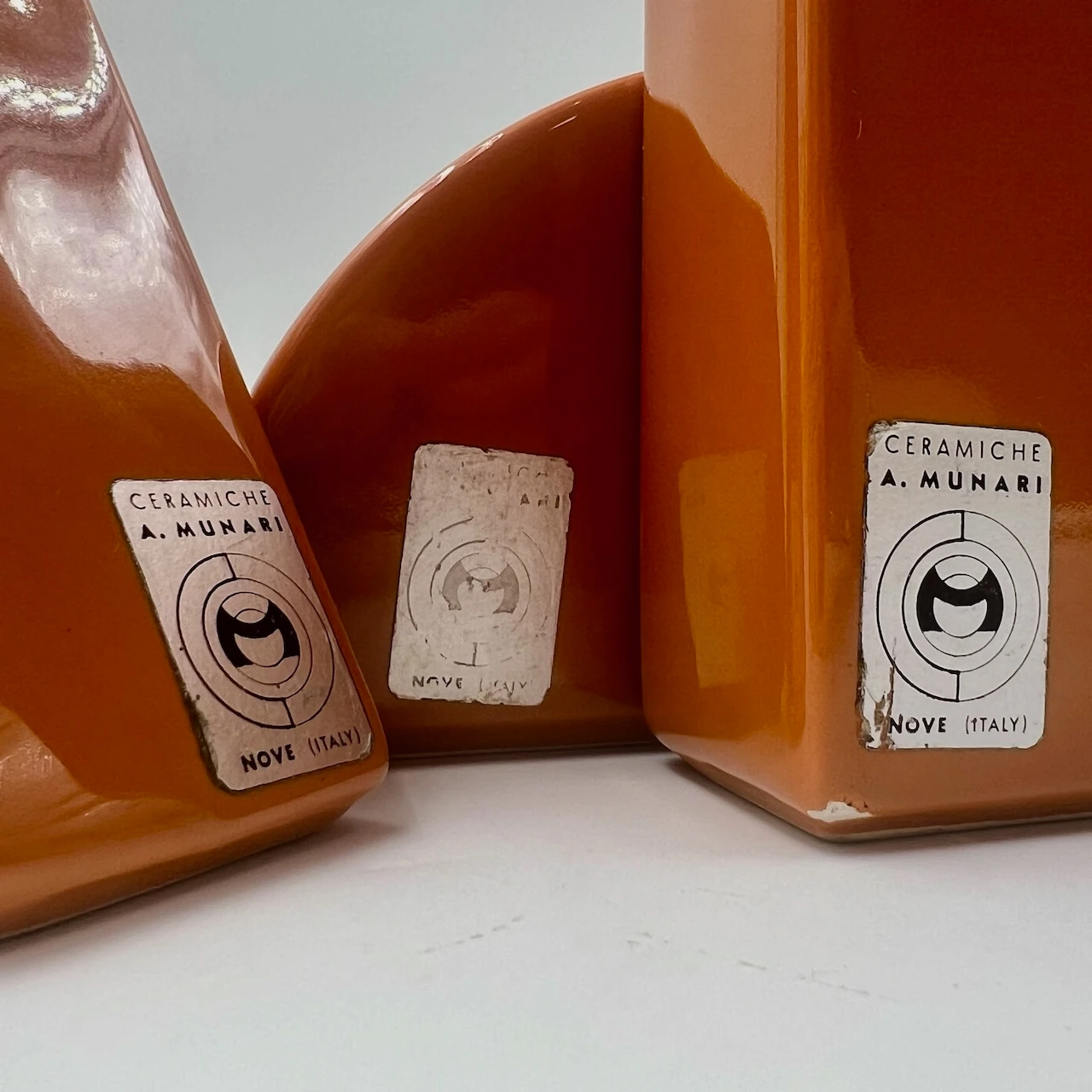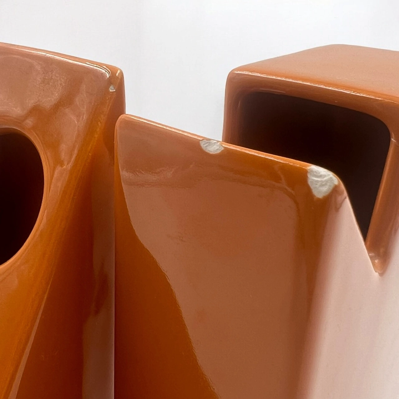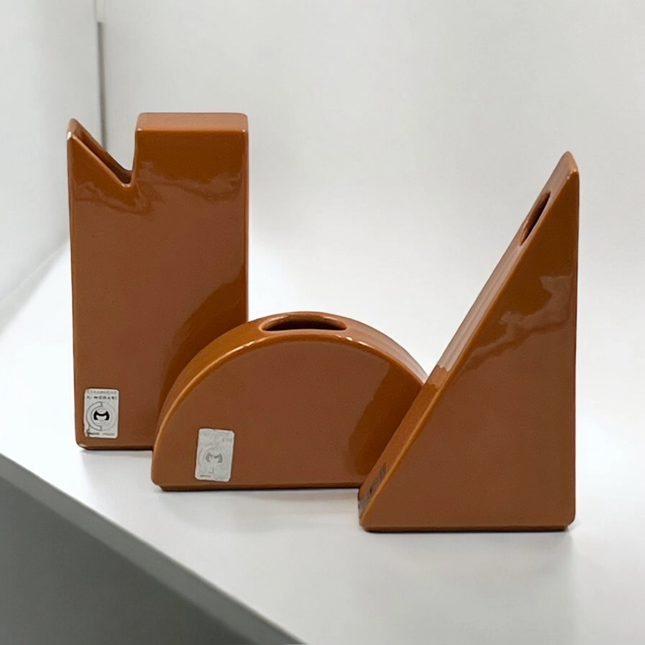 item. ceramic vasesdesigner. antonio munarimaker. ceramiche munariperiod. 1970scountry. Italymaterial. ceramiccolor. dark orangedimensions (cm). rectangle 19x10x4.5 cm, triangle 19.5×11.5×5 cm, hemisphere 17x9x4.5 cm.condition. very good vintage conditions. the rectangular vase bears a few minor chips (see pictures).art. no. 1520