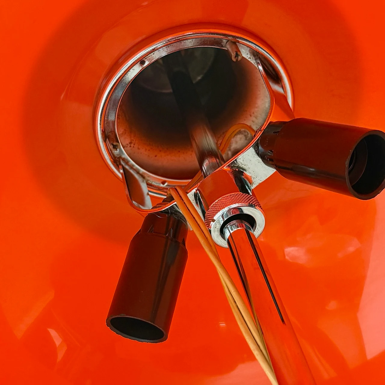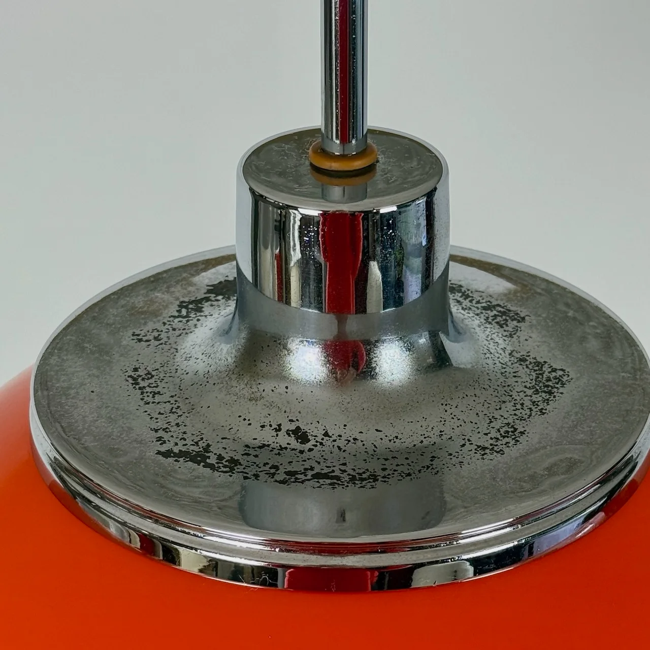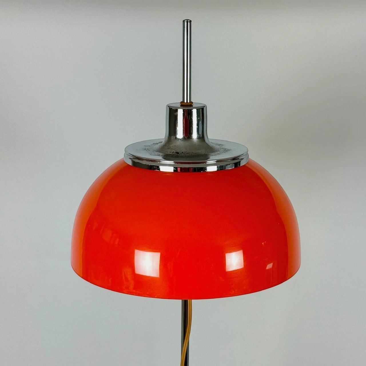 condition. excellent vintage conditions. the orange-colored shade has traces of oxidation on the upper chrome lid. All components are original, including the internal screws and Lucite cable clamp ring and the bakelite lamp holders.
