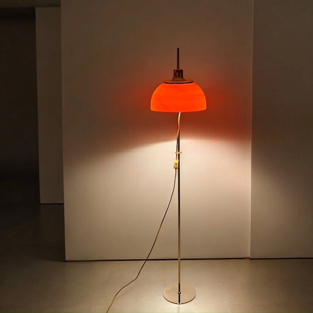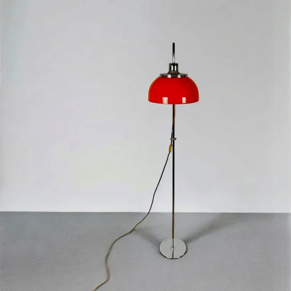 Discover the 70s floor lamp Harvey Guzzini Faro. Mid-century modern design with a chrome base and iconic orange acrylic mushroom shade.