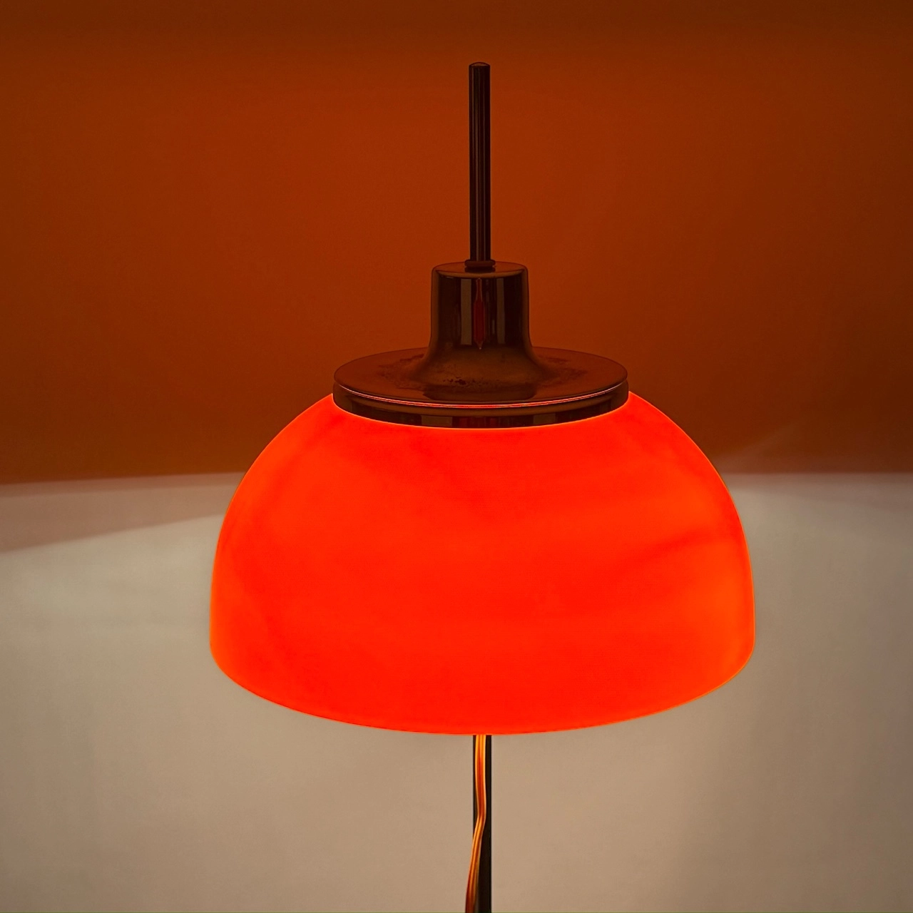The lamp features a slender chrome rod rising from a sturdy chromed iron base, which houses a cast iron counterweight. Its striking orange acrylic mushroom lampshade adds a vibrant pop of color, diffusing a warm and inviting glow. A chrome lid atop the shade completes the sleek, futuristic design.
