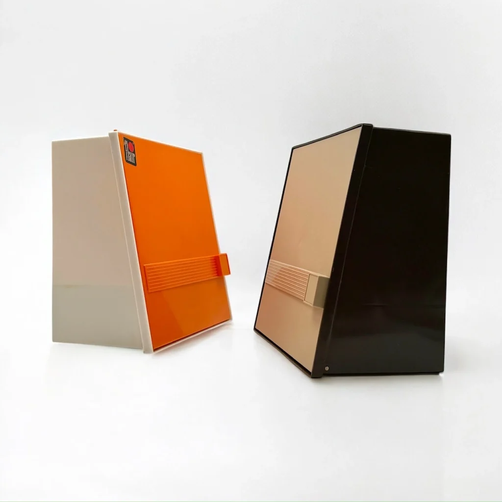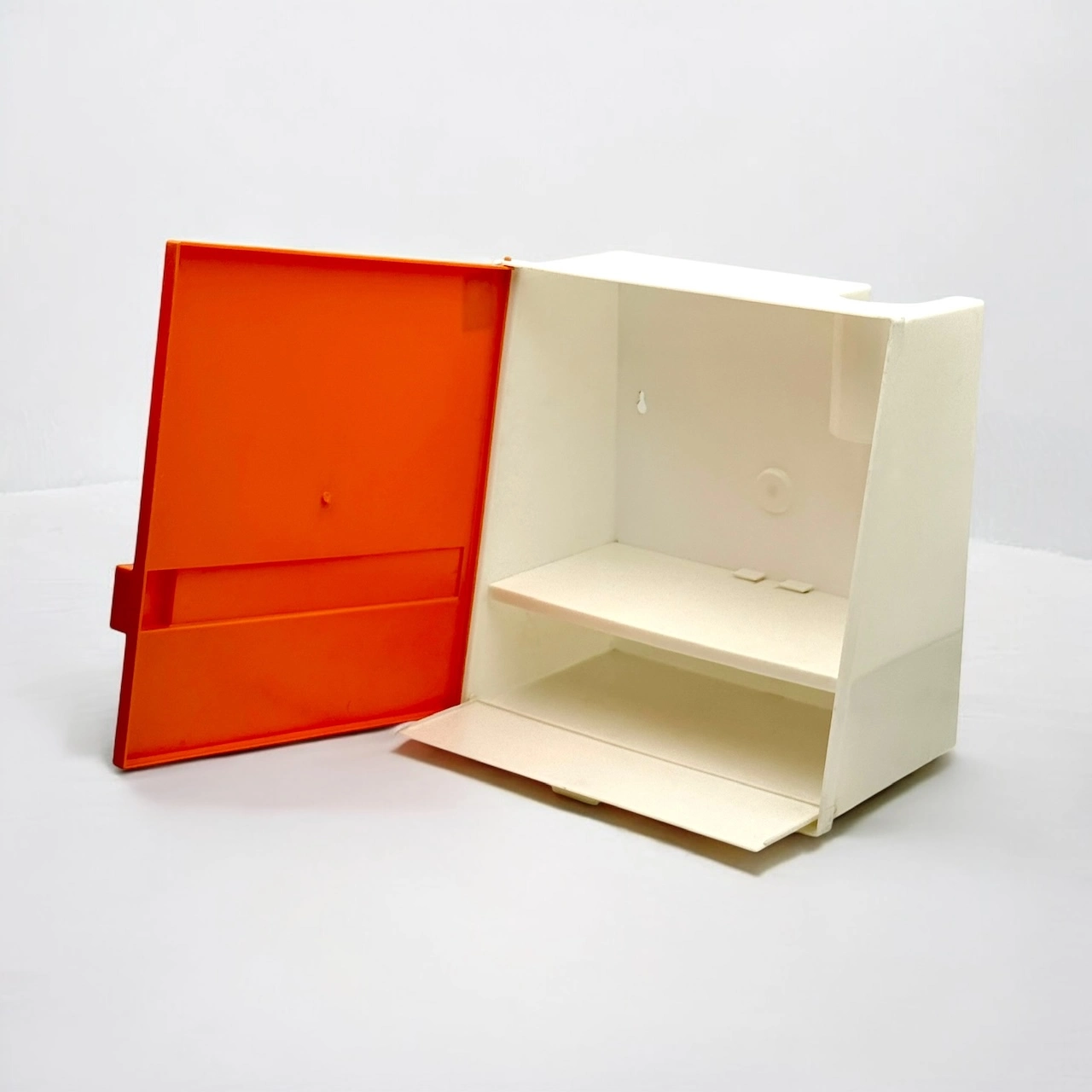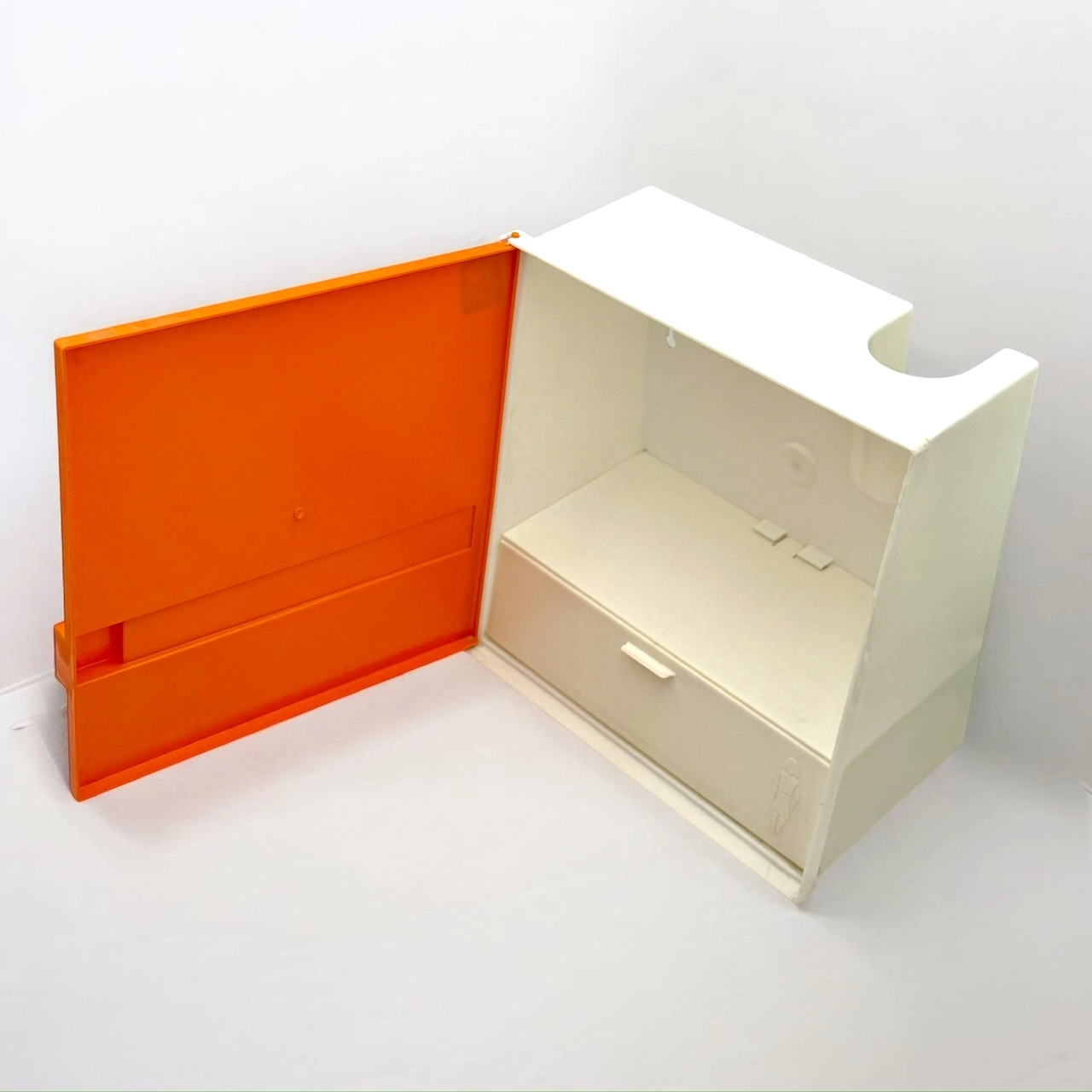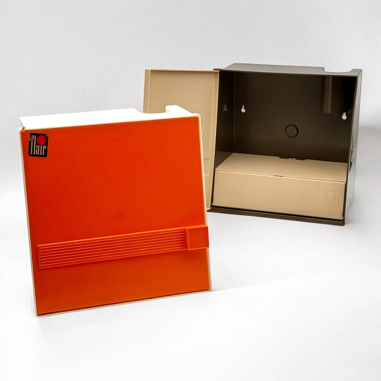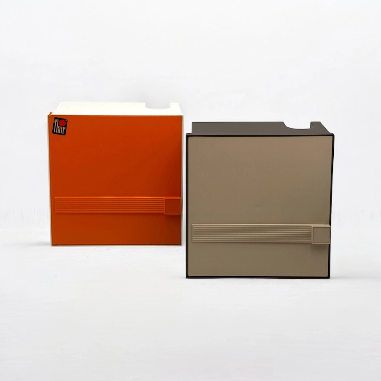 Step back into the vibrant world of retro interiors with this rare pair of original 70s medicine cabinets by Flair France. Designed in bold, contrasting tones—orange and white, brown and beige—these wall-mounted plastic units capture the playful geometry and space-age spirit of 1970s design.
