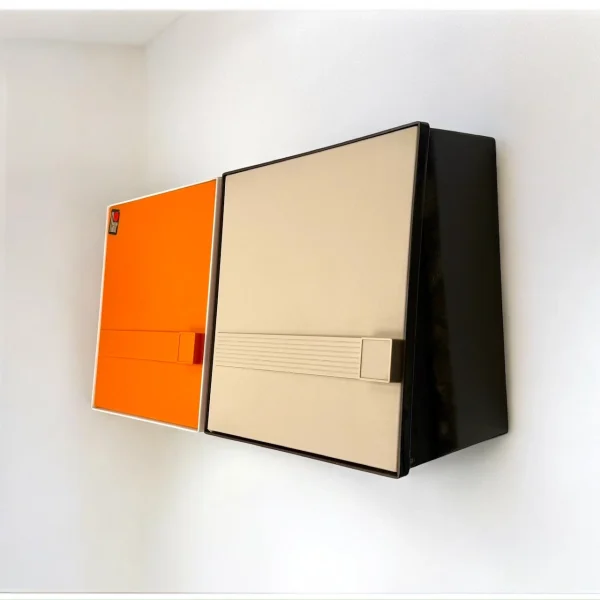 item. wall cabinetsmaker. flairperiod. 1970scountry. francematerial. plasticcolor. orange, white, beige, browndimensions (cm). 32 x 32 x 18 Dcondition. complete and in excellent vintage condition. minor surface marks. a small chip in the recess of the orange cabinet door, barely visible and does not affect functionality. brand label present on the orange cabinet.art. # 1718