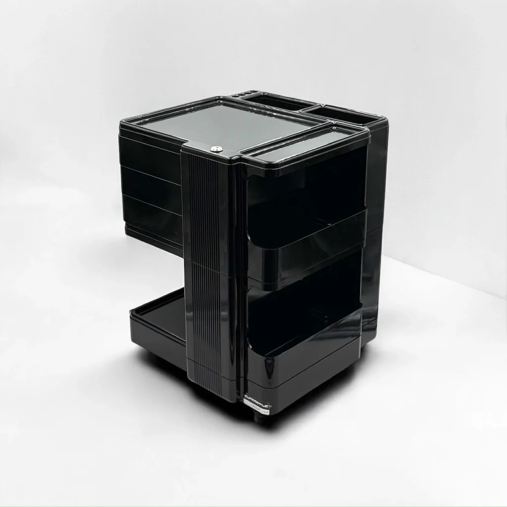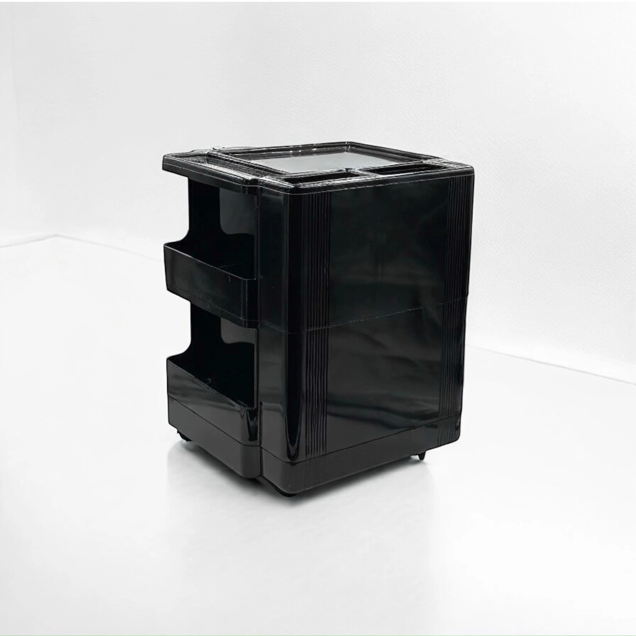 Amazing 70s organiser trolley Superstile by Neolt in glossy black. Compact, sophisticated and functional. A design-savvy solution for stylish organisation – with a vintage industrial vibe.