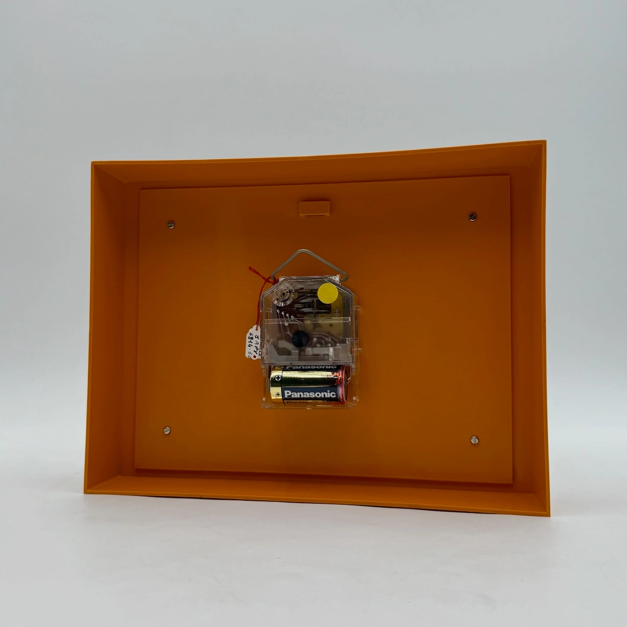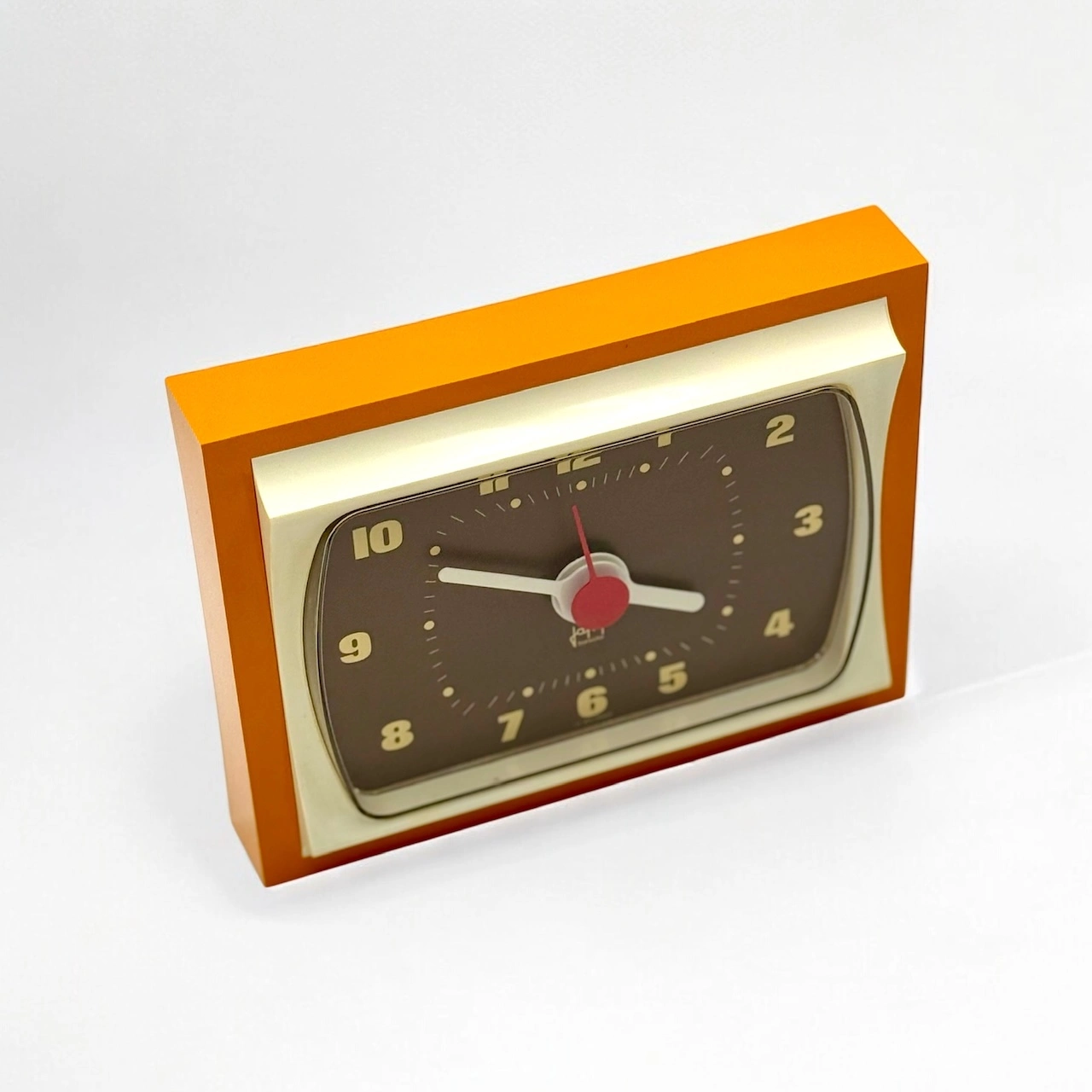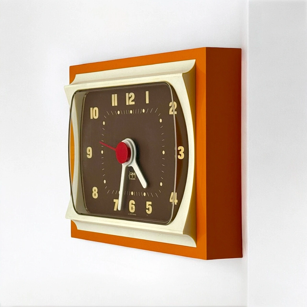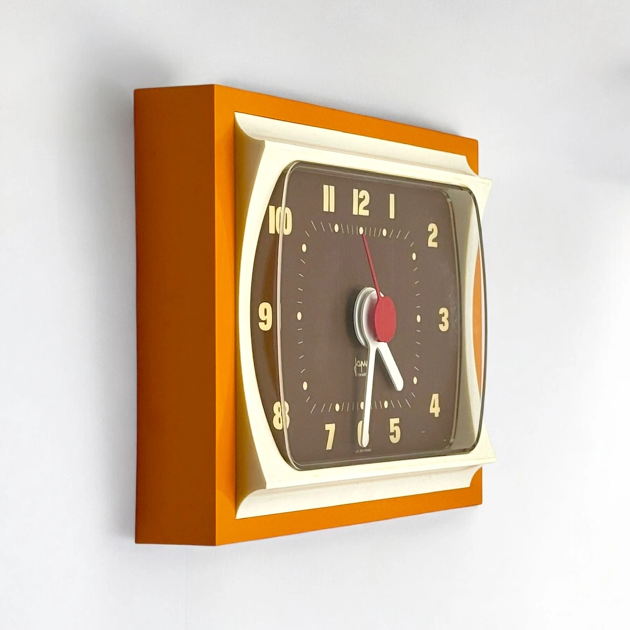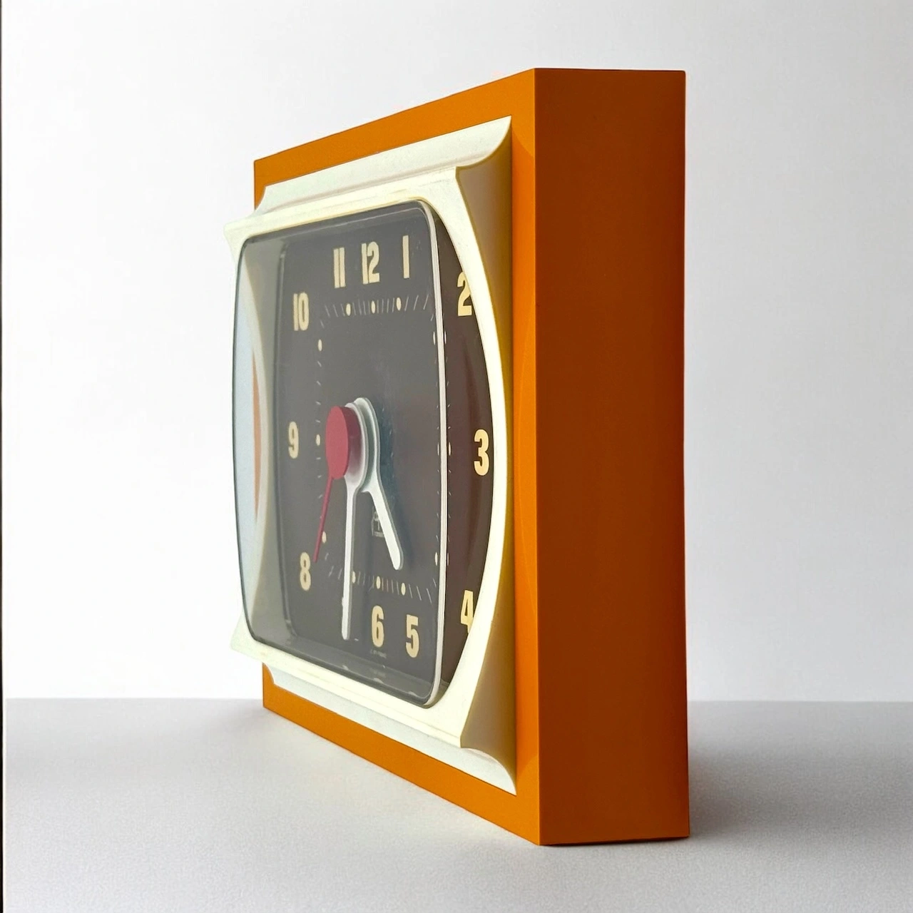 This striking 70s space age clock by Japy France perfectly blends retro futurism with bold visual flair. Featuring a large rectangular frame softened by curvaceous edges, it sports a vivid and warm color palette of mustard, brown and cream tones —an iconic combo straight from the golden age of design.
