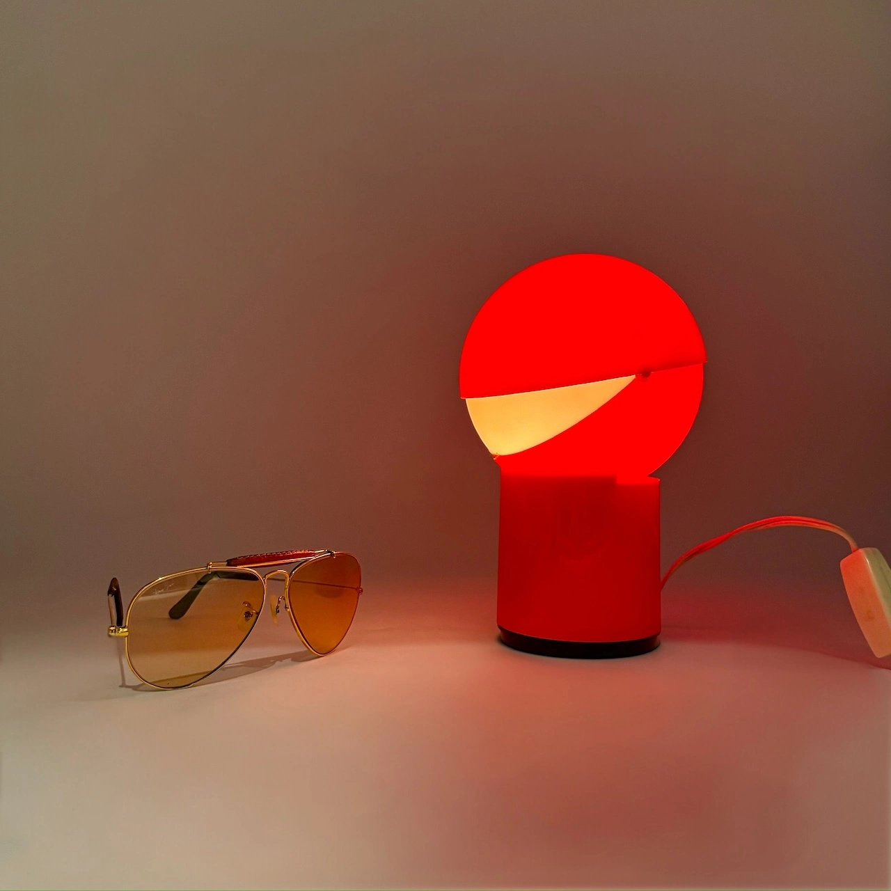 Its sculptural form reflects the era’s fascination with geometric, otherworldly silhouettes. Viewed from a different angle, the rounded shade even hints at the early visual language of Pac-Man—playful, iconic, and ahead of its time.