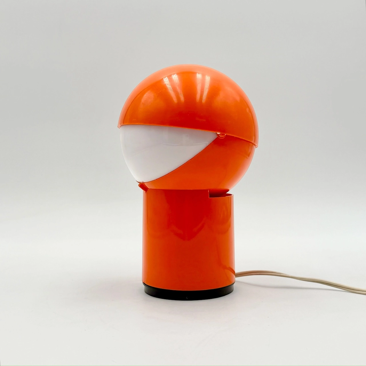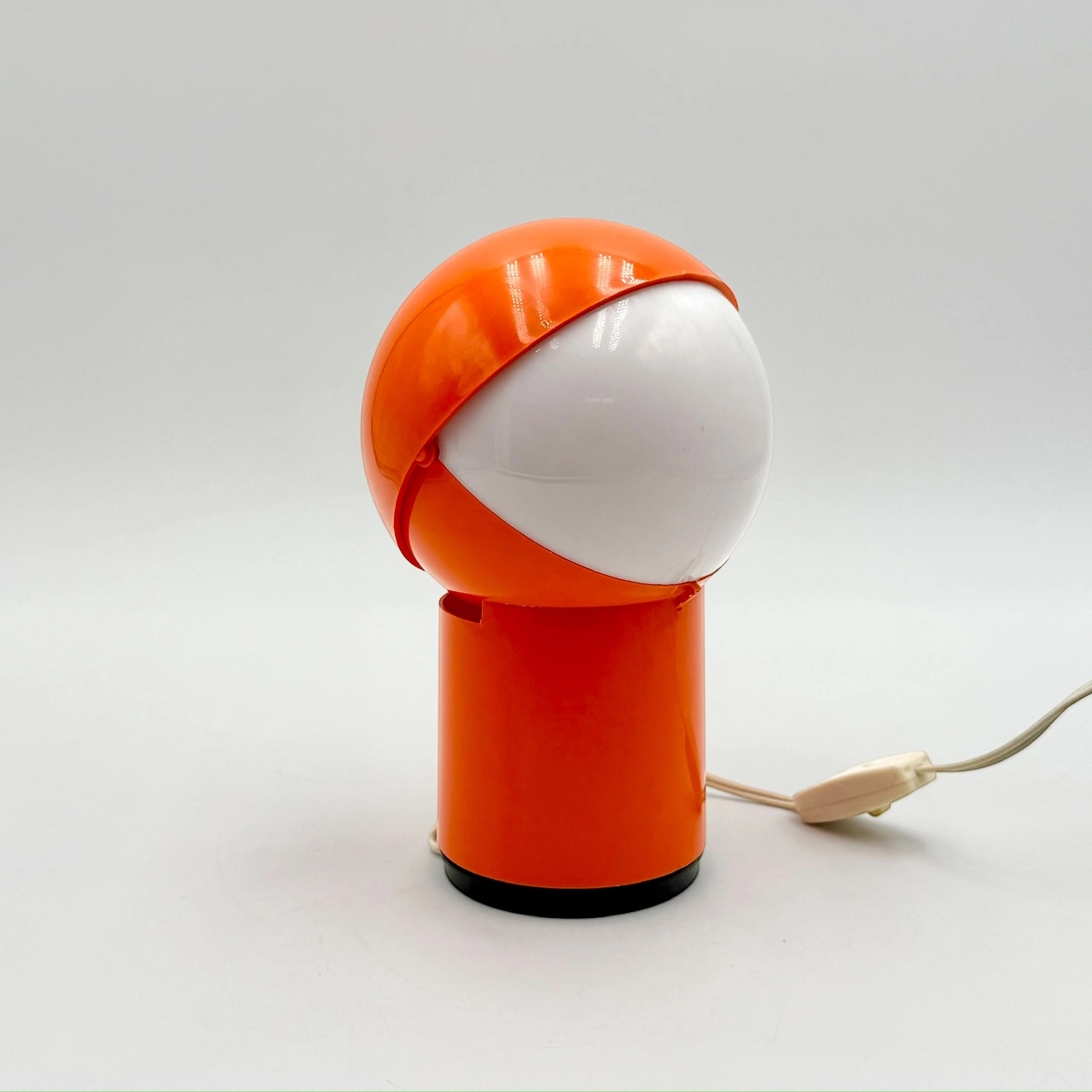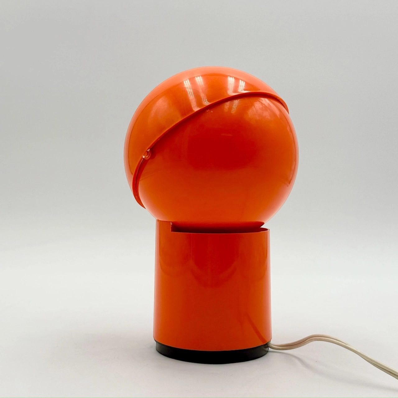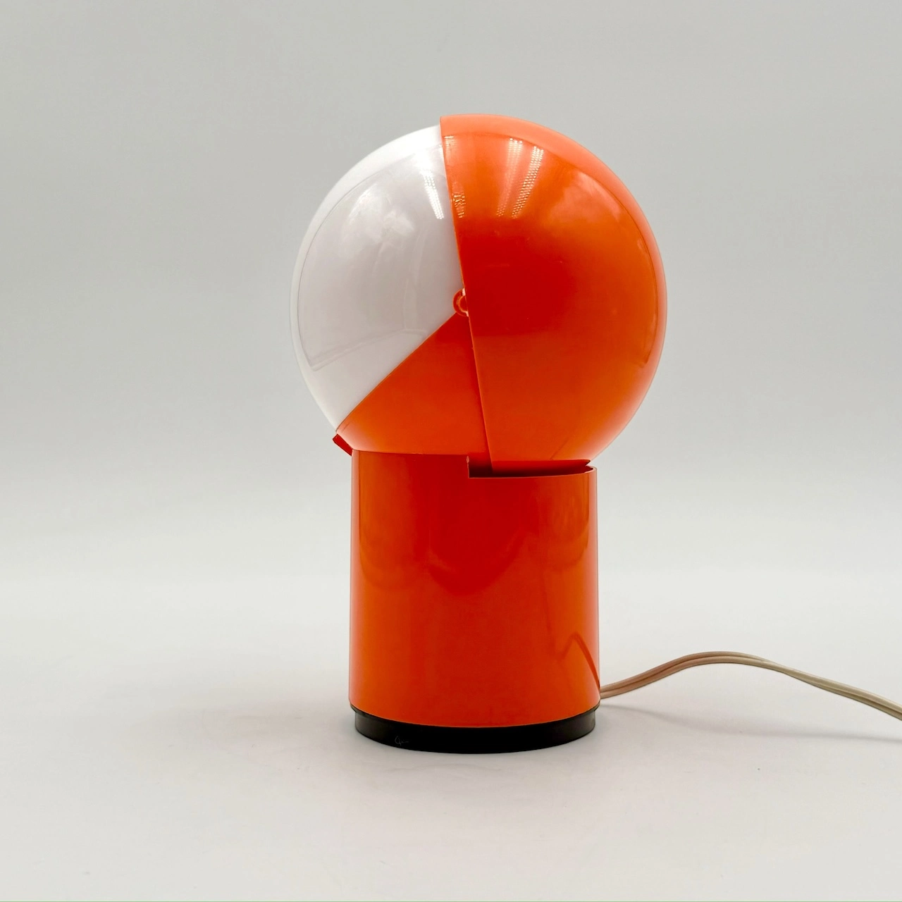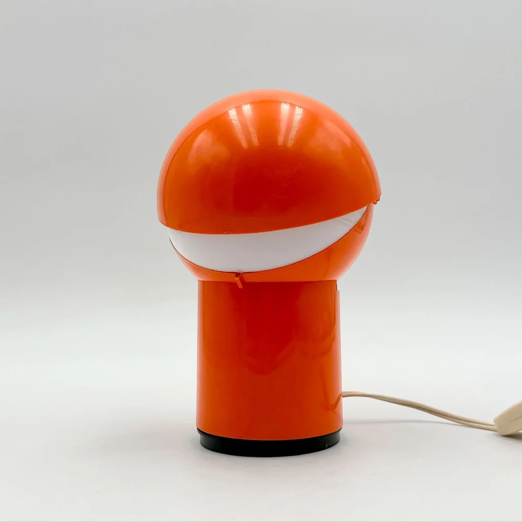 The lamp features an adjustable lampshade that allows for directed or ambient light diffusion, echoing the clever functionality of models like the celebrated ‘Eclisse’ lamp. The glossy orange finish amplifies its retro character, bringing a vibrant Space Age energy to any vintage or modernist interior.