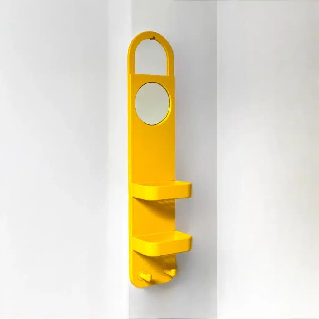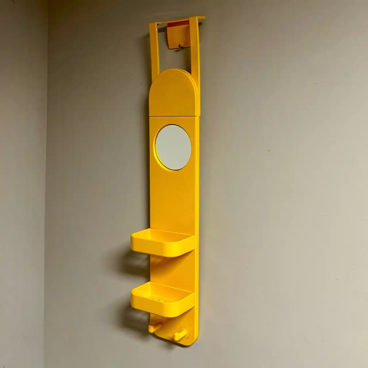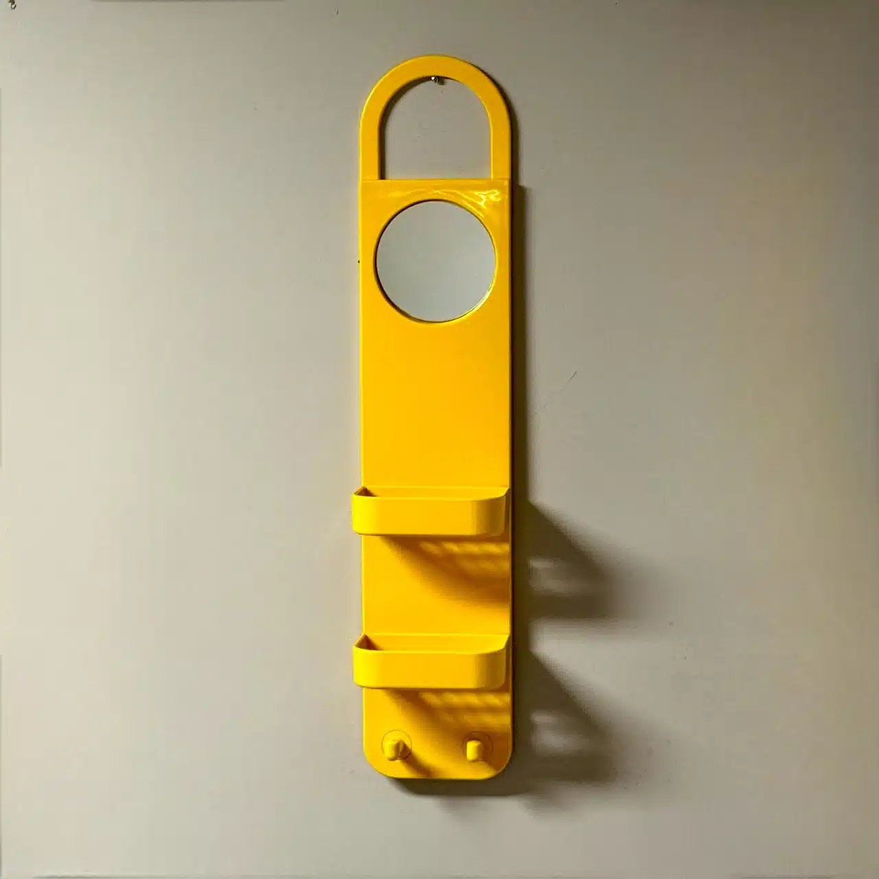 Rare Wall Organizer with Mirror by Makio Hasuike for Gedy. A Space Age-inspired piece from the 70s with a radiant yellow hue, perfect to give a retro futuristic touch to your bathroom.