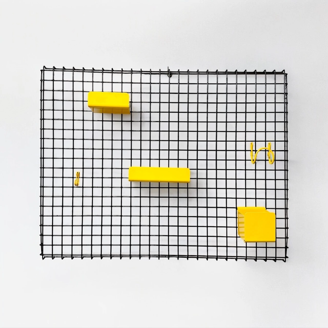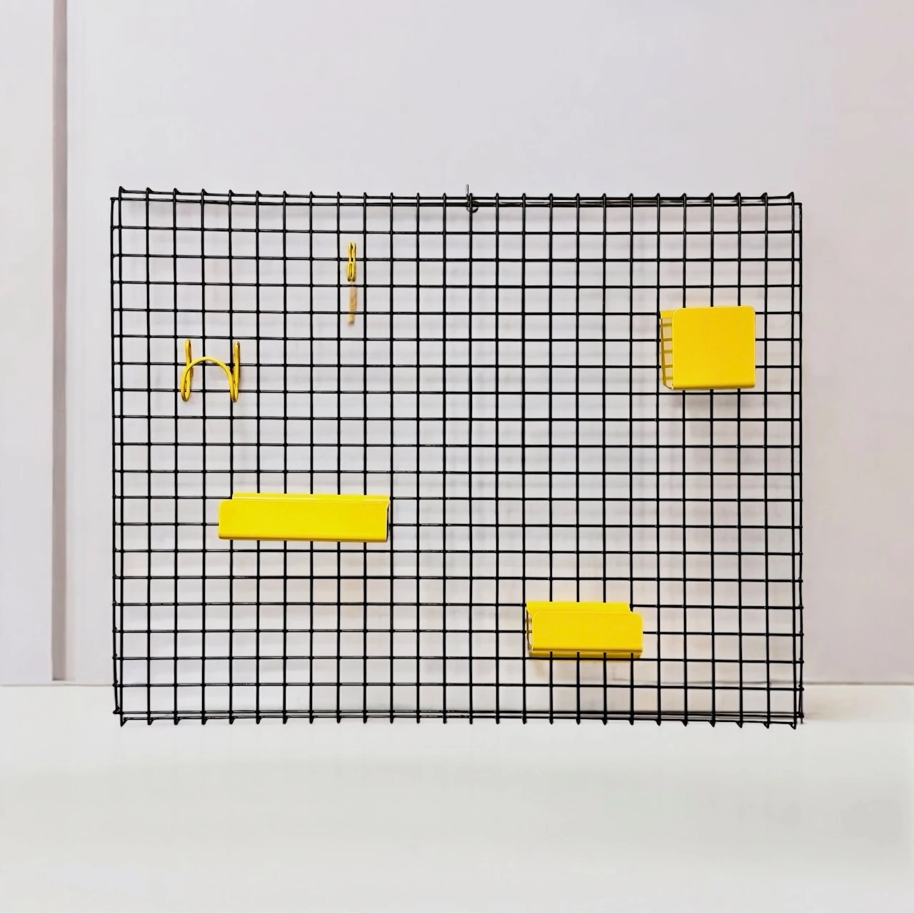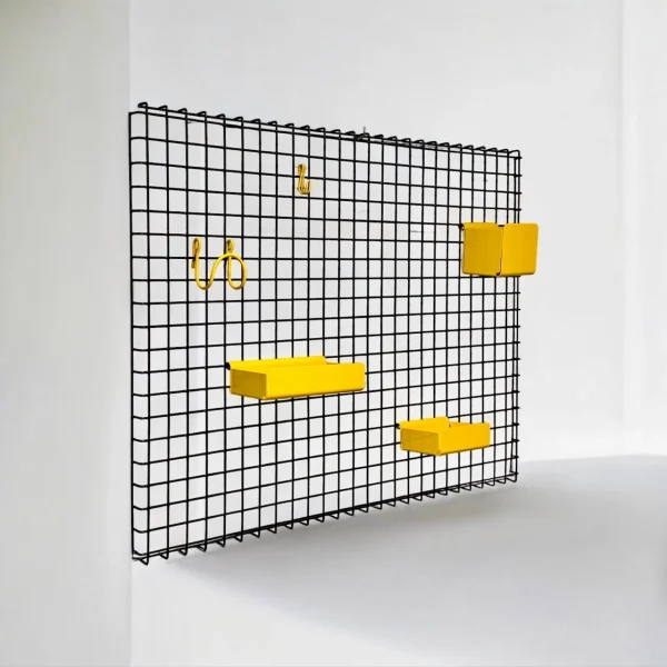 Add a bold retro touch to your space with the Binetta wall shelf, designed in the 1970s by Boccato, Gigante and Zambusi for Seccose. Made in Italy, this statement piece features a striking 90×70 cm black metal grid with five modular yellow metal accessories: three differently sized trays and two hooks. The wall frame can be hanged horizontally or vertically.