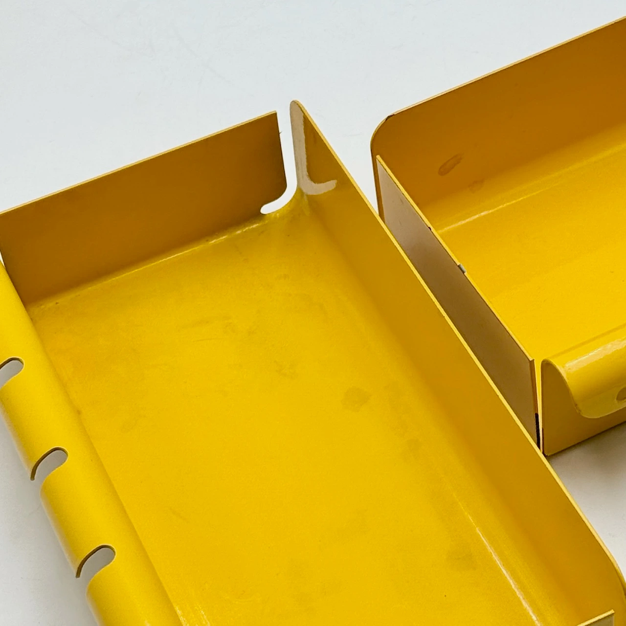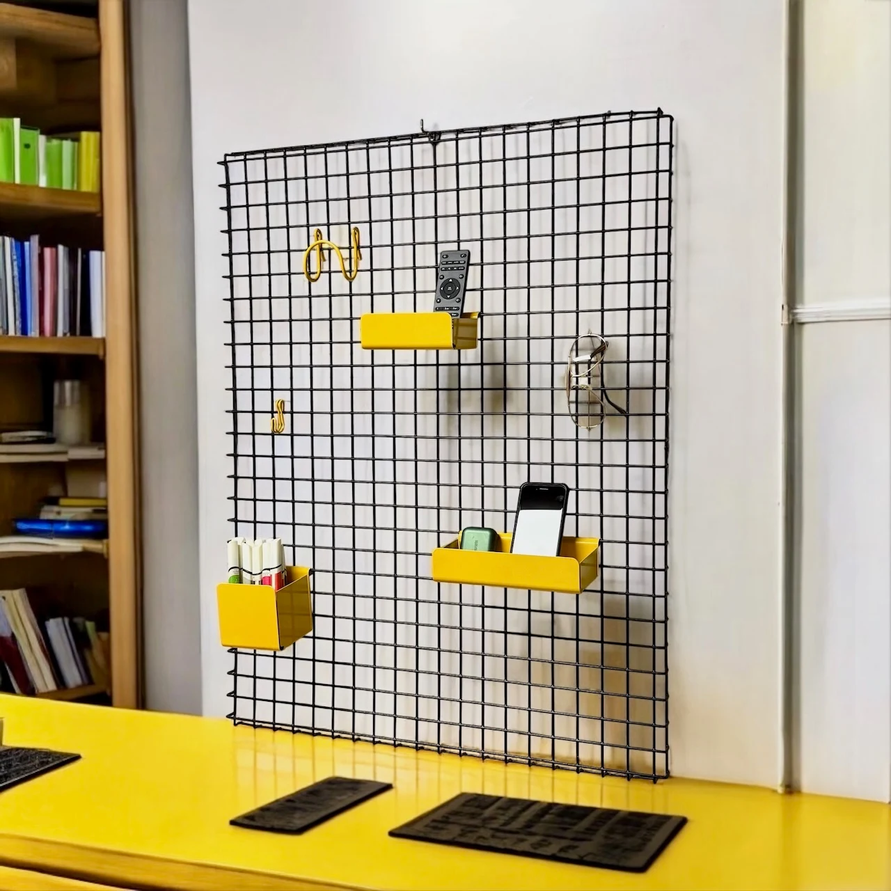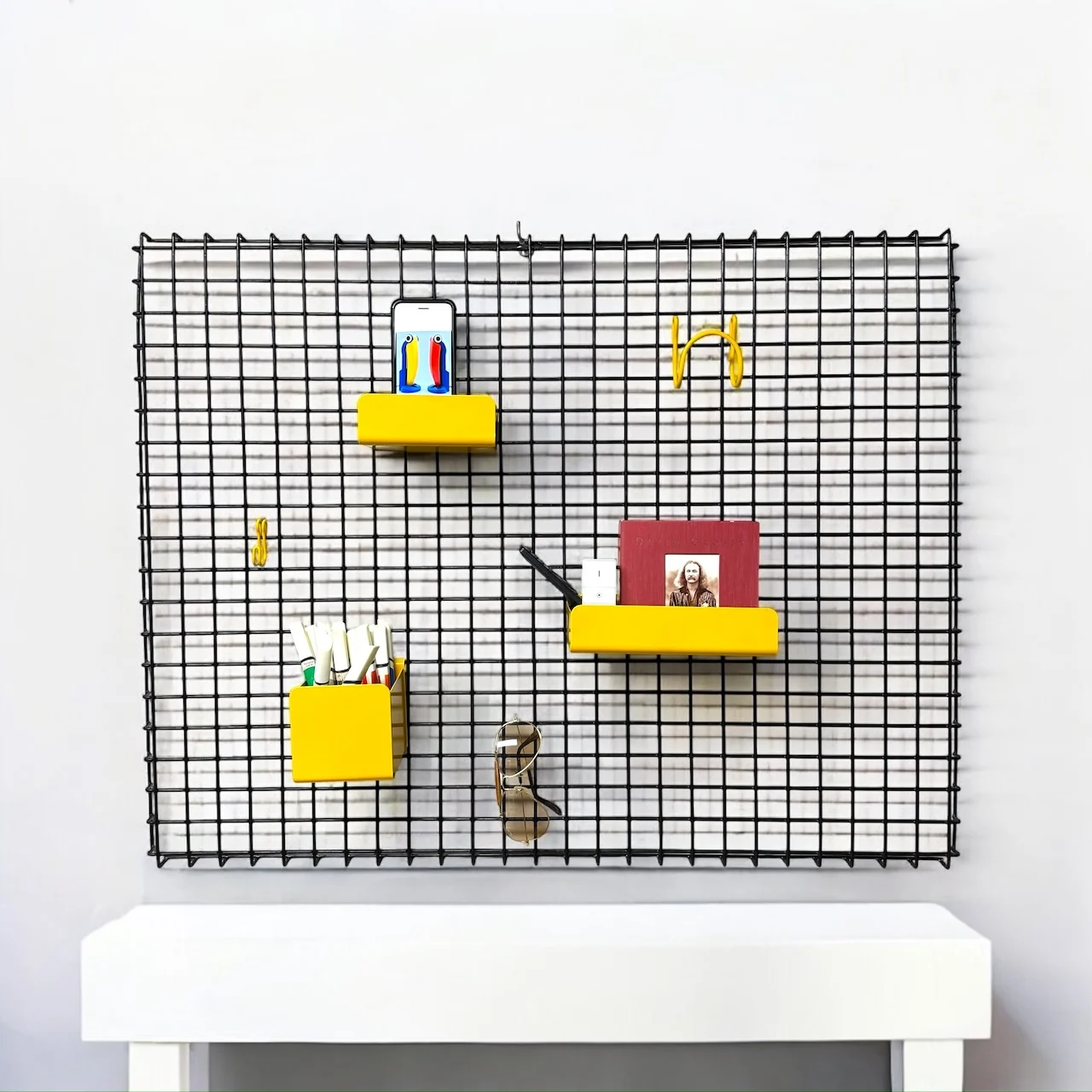 Add a bold retro touch to your space with the Binetta wall shelf, designed in the 1970s by Boccato, Gigante and Zambusi for Seccose. Made in Italy, this statement piece features a striking 90×70 cm black metal grid with five modular yellow metal accessories: three differently sized trays and two hooks. The wall frame can be hanged horizontally or vertically.
