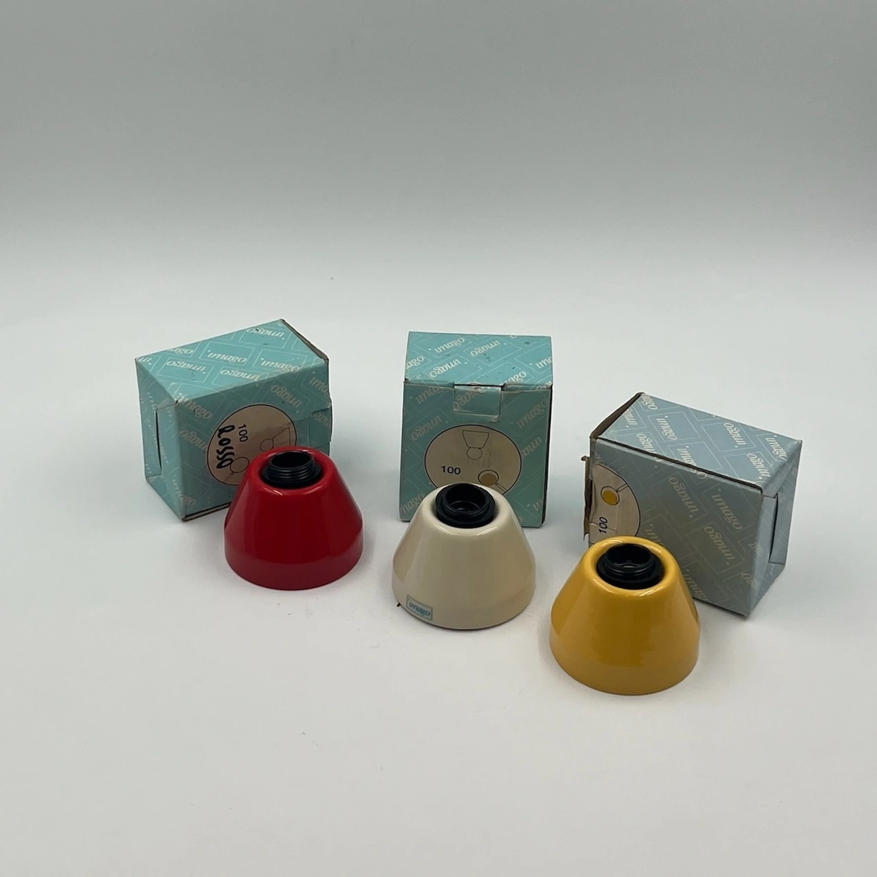 Beautiful and rare set of minimalistic design lamps designed and manufactured by Imago Italy in the 80s. Made of ceramic with vibrant hues. New Old Stock.