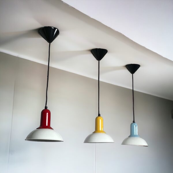 item. hanging lampsmaker. Imagoperiod. 1980scountry. Italymaterial. ceramic, plasticcolor. white, red, yellow, light blue, dimensions (cm). 20 x 20 x 20.5 H. total length with cable 110 cm.conditions. excellent. new old stock.art. no. 1379