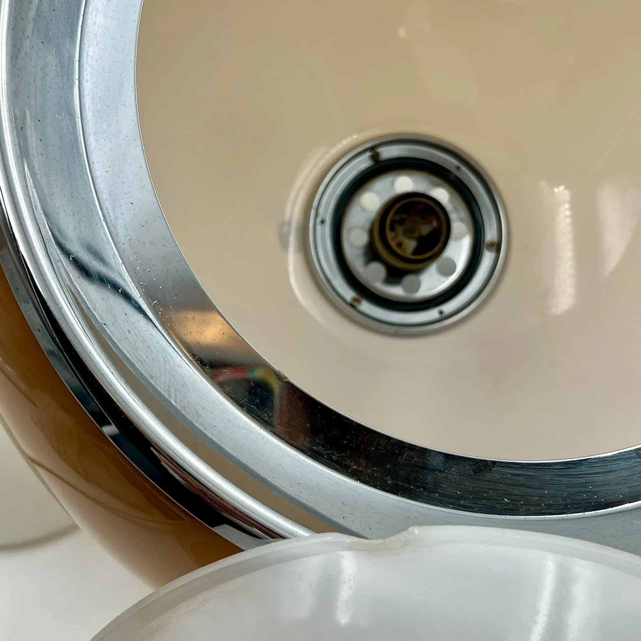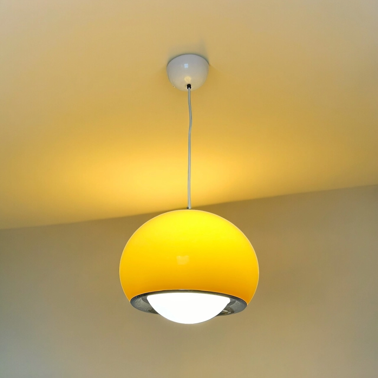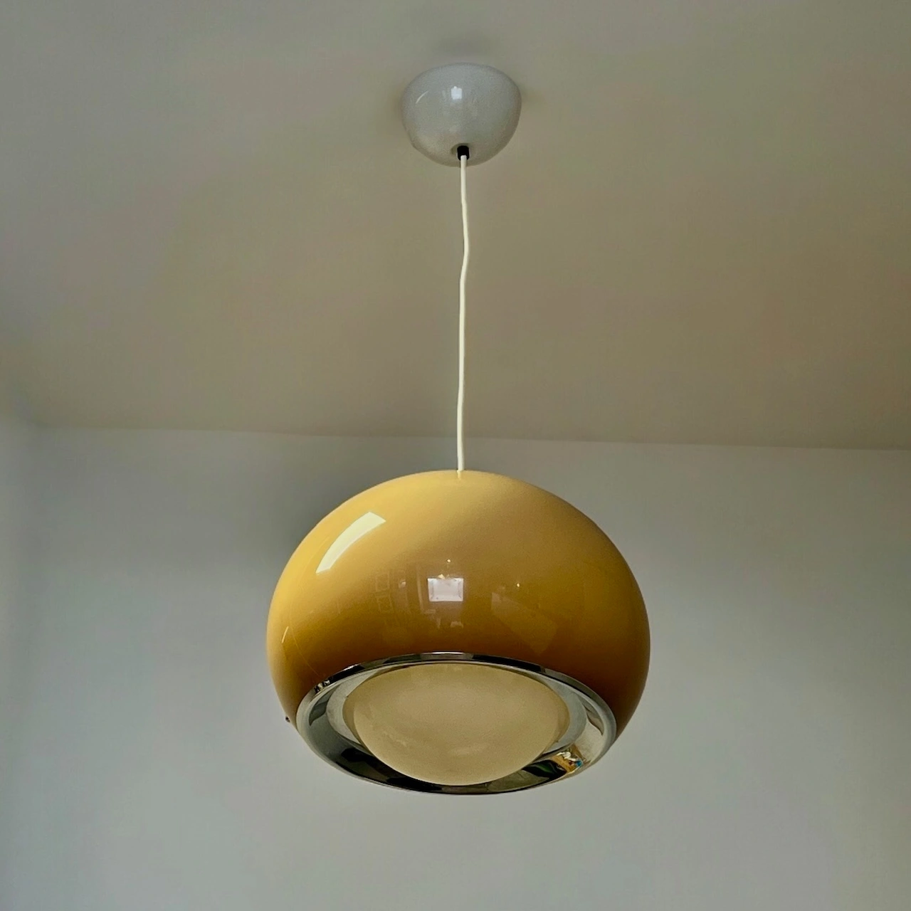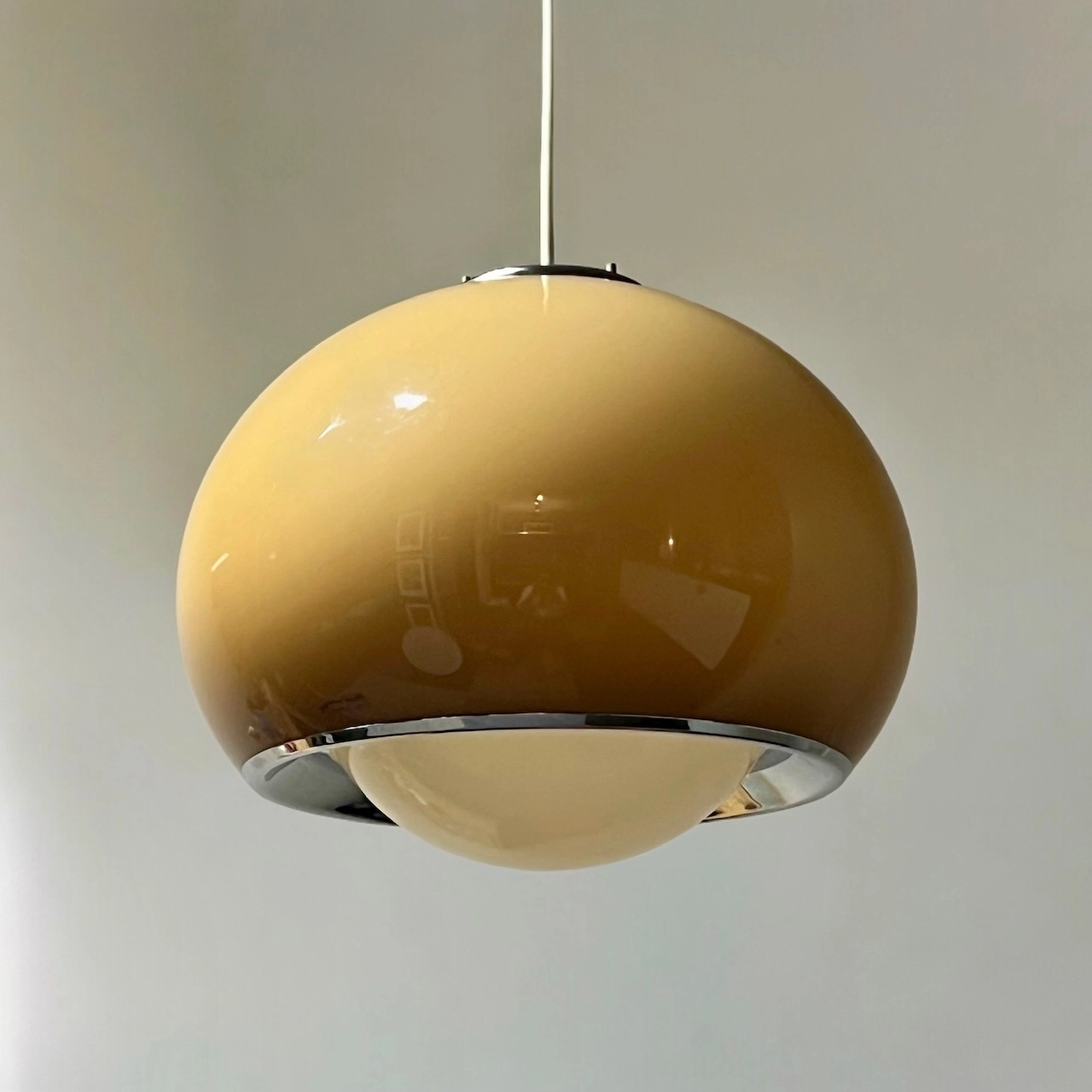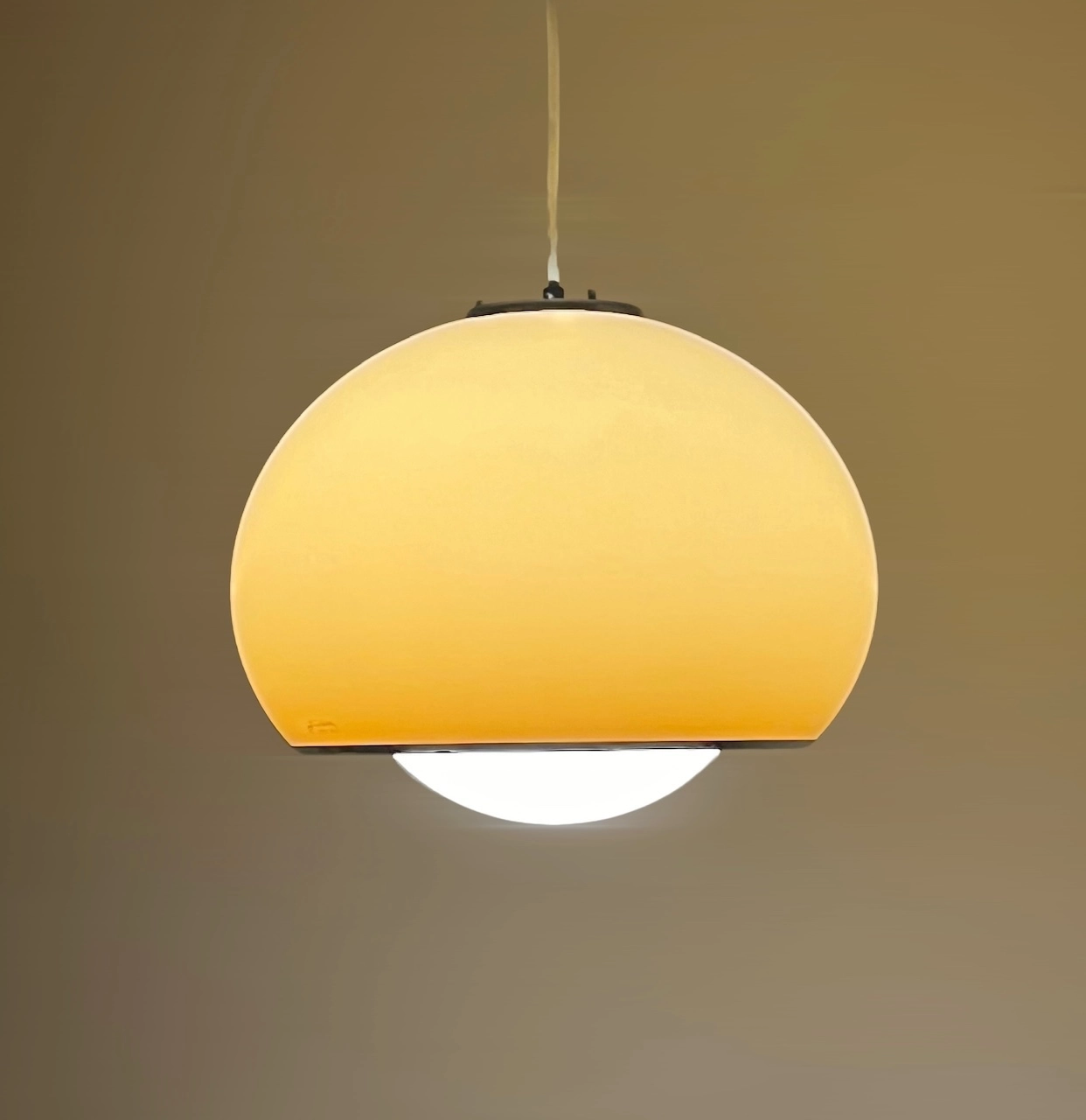 item. hanging lampdesigner. Studio 6G – Harvey Guzzinis internal design teammaker. Harvey Guzzinimodel. BUD 3029period. 1960s/70scountry. Italymaterial. gradient brown acrylic globe, white on the inside, chrome lamp socket holder, chromed metal ring, white acrylic half-round diffusercolor. gradient brown, white, chromed silverdimensions (cm). 35 x 35 x 31. cord length: 200 cm.condition. excellent vintage conditions. intact and clean, with light traces of oxidation on the lower ring and a small imperfection on the corner of the white acrylic semi-circular diffuser, not visible when in use
