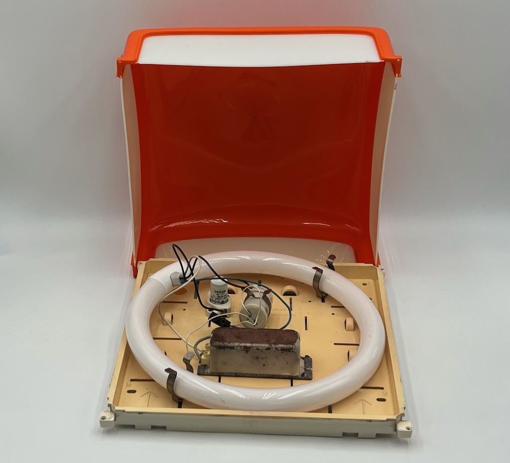 Made of innovative opaline cellulose acetate with the iconic orange and white combination, these lamps have the original 32 cm fluorescent tube system in working order.