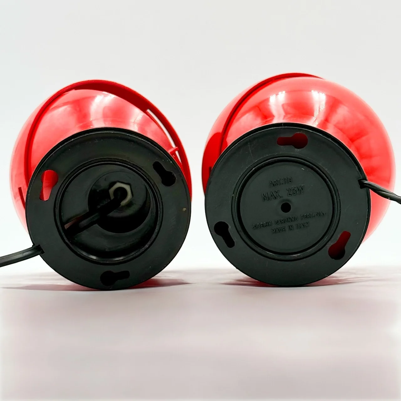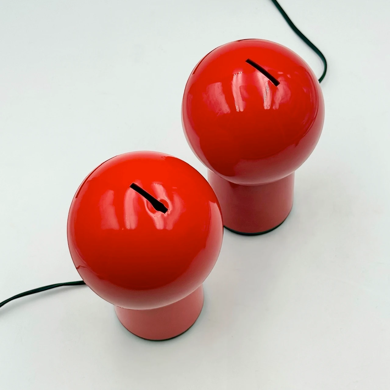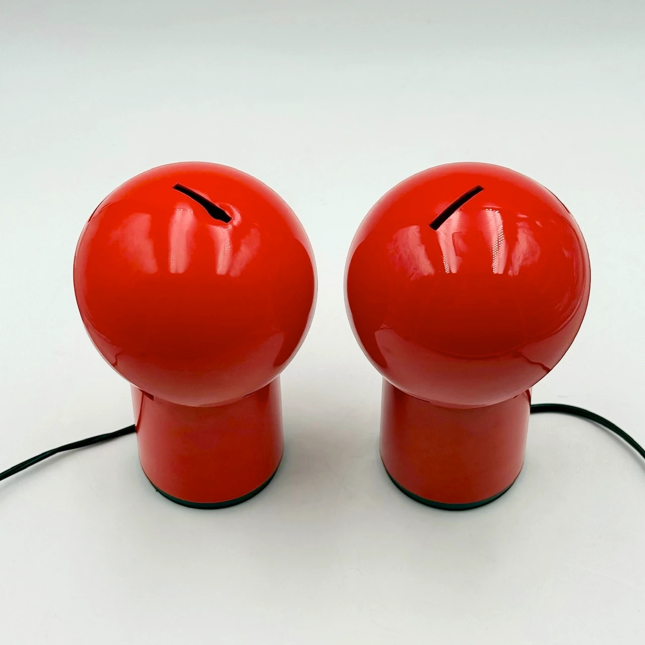 • Condition: excellent vintage condition with minimal signs of age. One lamp shows a very slight deformation of the upper shell caused by previous use of an excessively hot bulb near the vertical opening. Original wiring, plugs and switches are present but differ between the two lamps. In one lamp, the lower central cover has been removed, without affecting functionality.