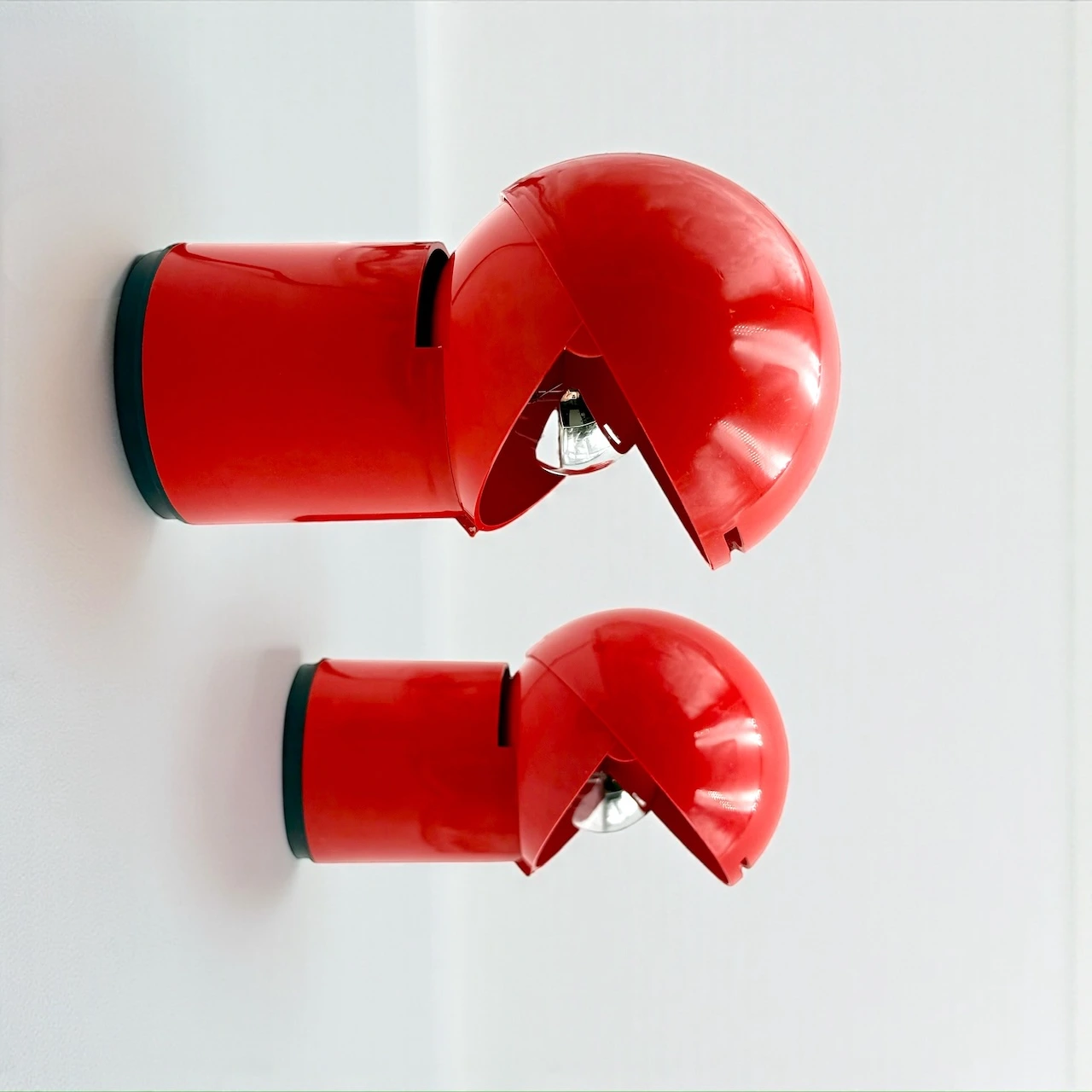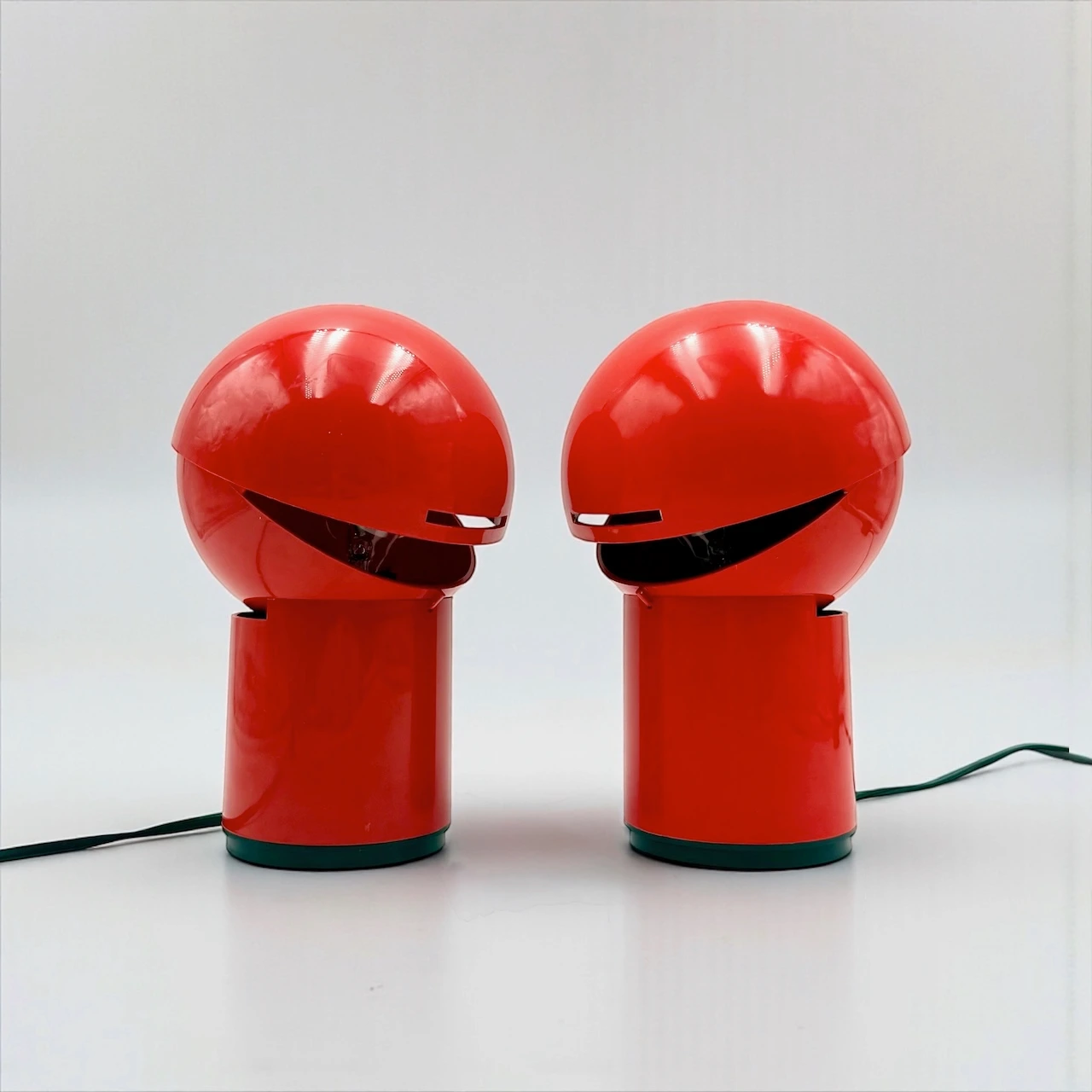 This pair of Asteroidi space age lamps represents one of the most recognizable expressions of Italian futuristic lighting from the 1970s. Produced in Italy by Siberin Caronno, the Asteroidi model is celebrated for its bold, pacman like silhouette and vibrant red plastic body, instantly evoking the experimental spirit of the space age era.