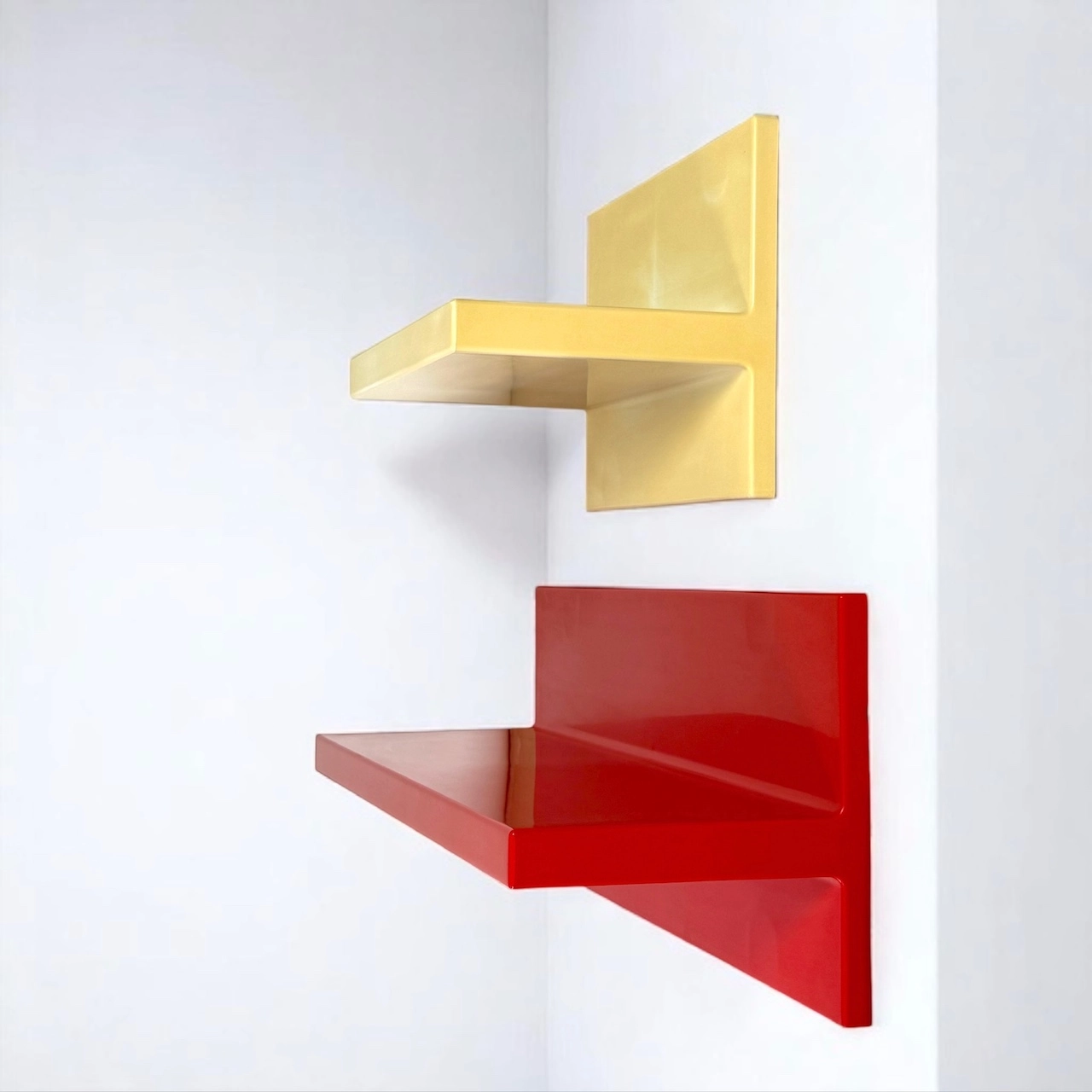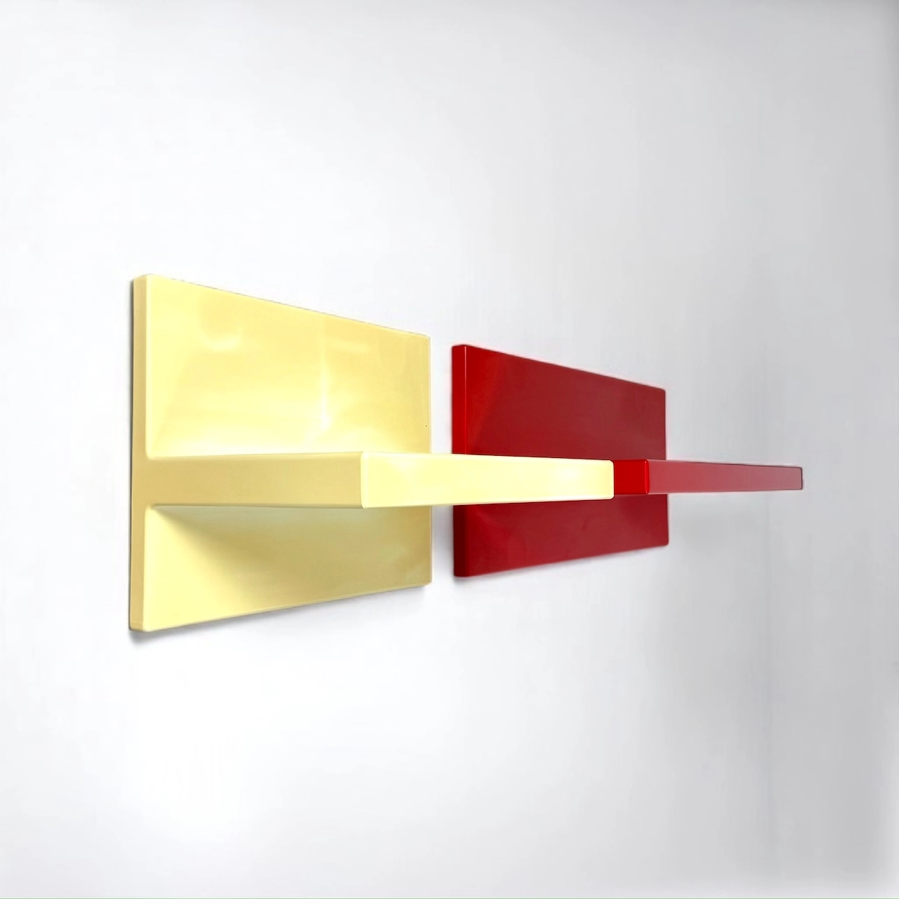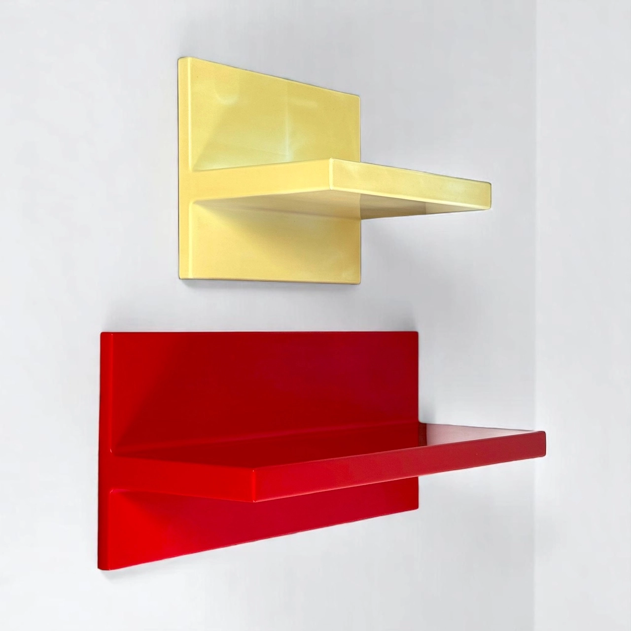 Made in glossy thermoformed plastic, these iconic wall-mounted units showcase bold, geometric lines in two vivid tones: brilliant red and aged white. Both shelves are structurally sound and visually impactful, offering a rare chance to own an authentic piece of Kartell’s radical design era.