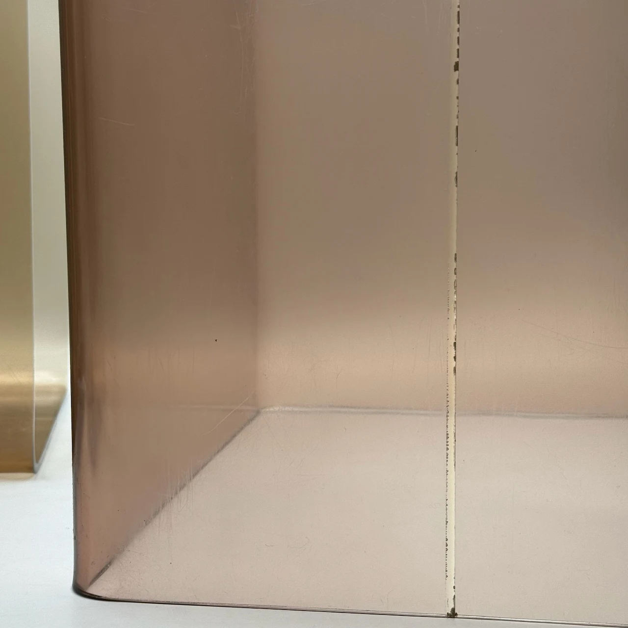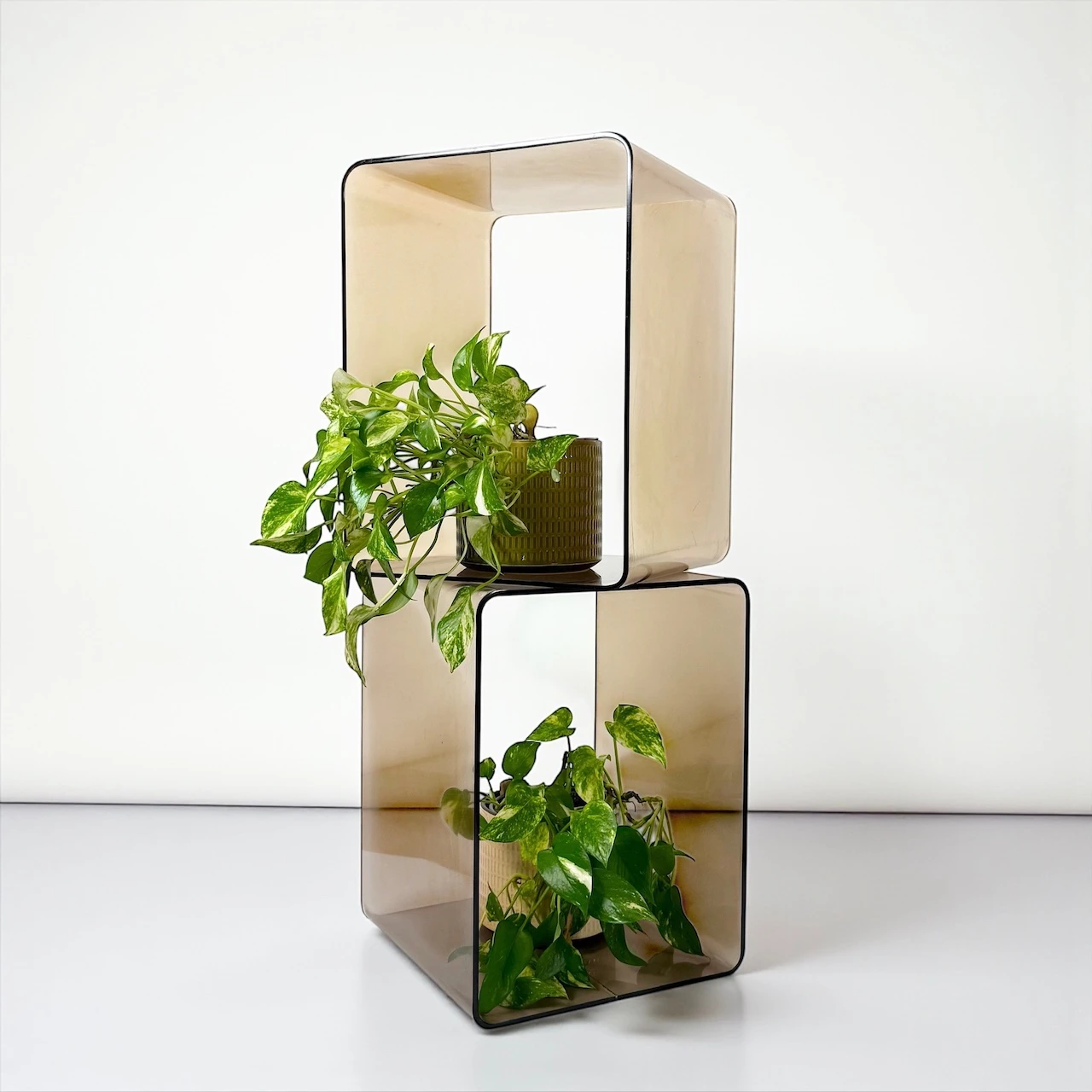 Each stand measures 40 by 30 by 30.5 centimetres. They are perfect for use directly on the floor as modular display units, plant holders or record stands. The thick molded plexiglass catches and diffuses light beautifully, creating reflections that add depth without visual weight.
