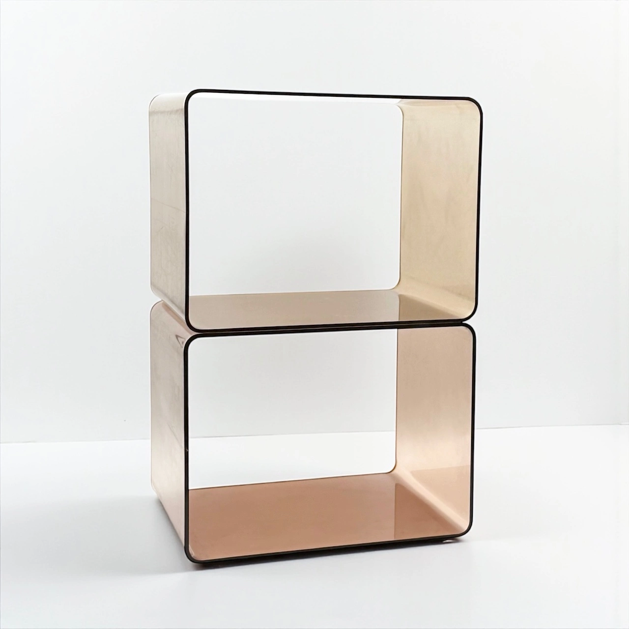 For a smaller version of this design, discover our vintage plexiglass modular cubes. Both sets share the same 1970s French production and distinctive warm tone, making them perfect companions for collectors or interiors that celebrate transparent form and playful geometry.
