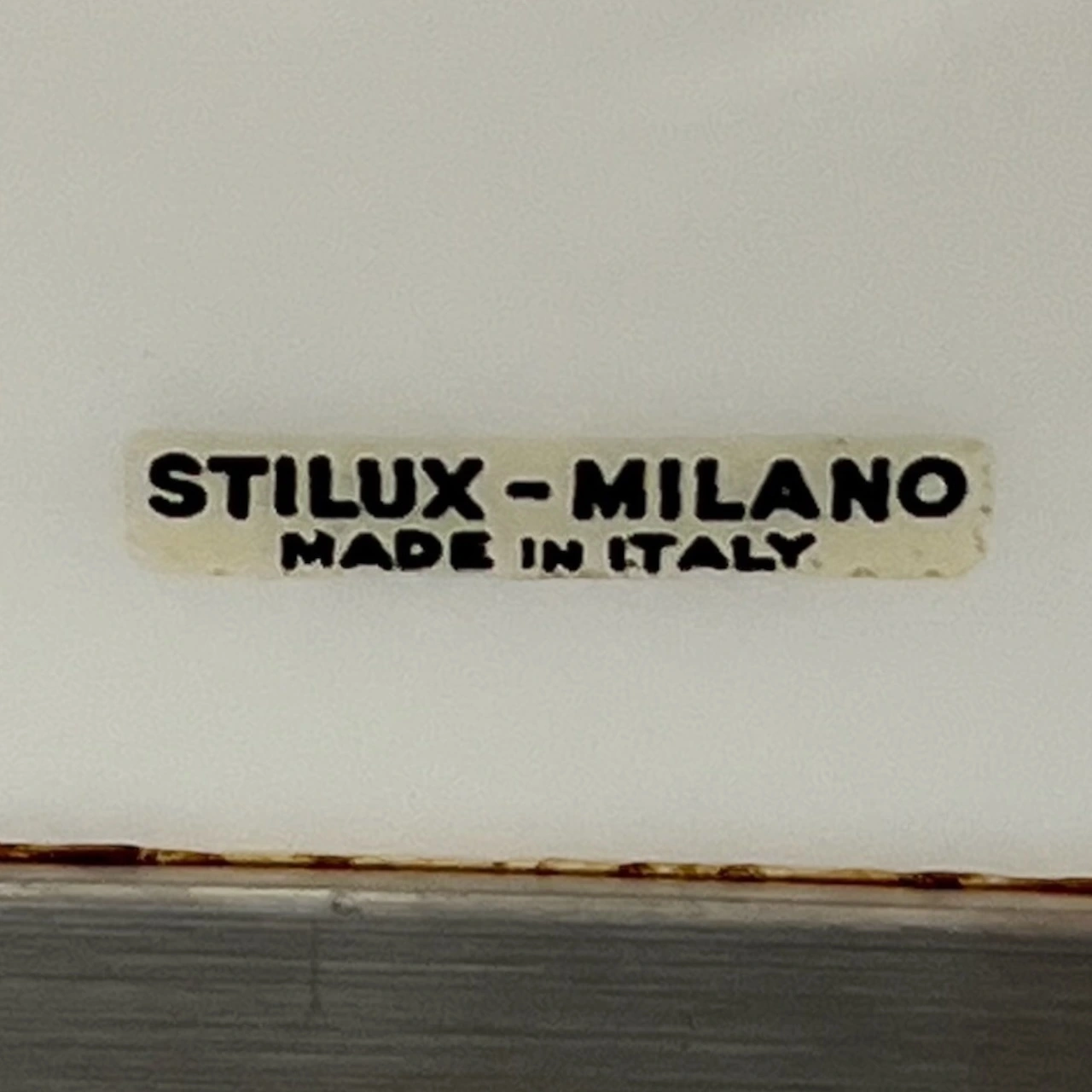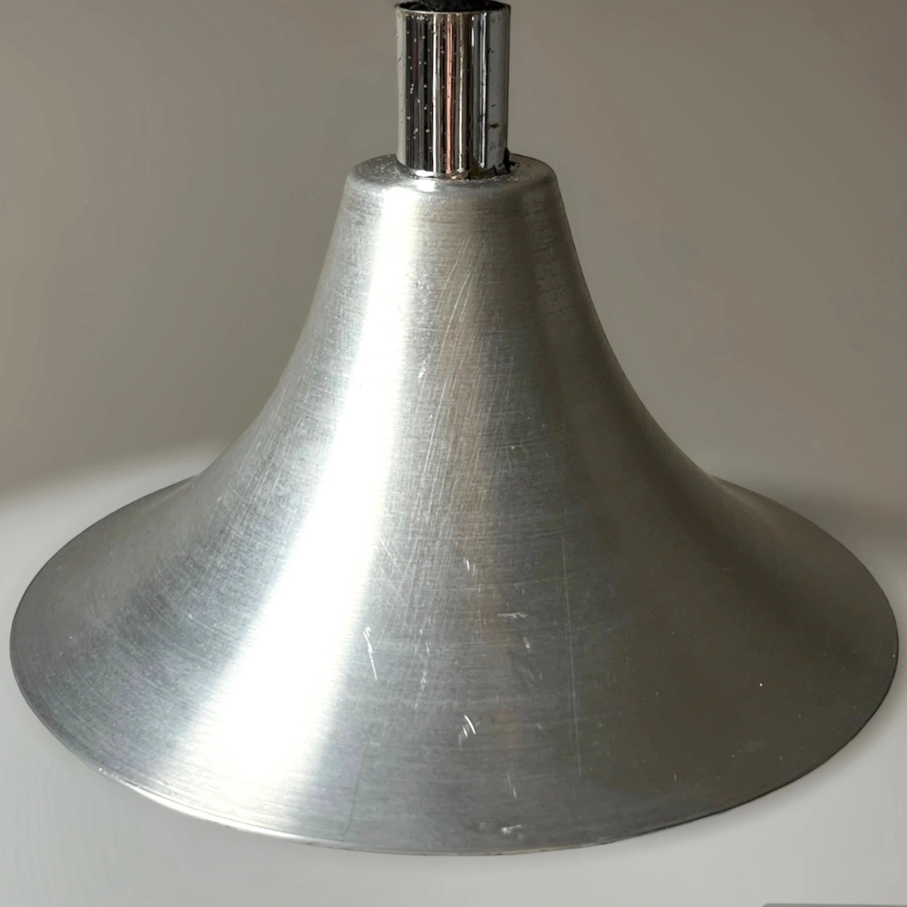 Iconic 70s space age lamp made by Stilux Milano. This lamp is made of a conic silver metal top, that supports a big, curved white polymethacrylate lampshade.