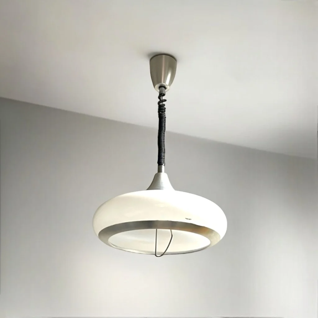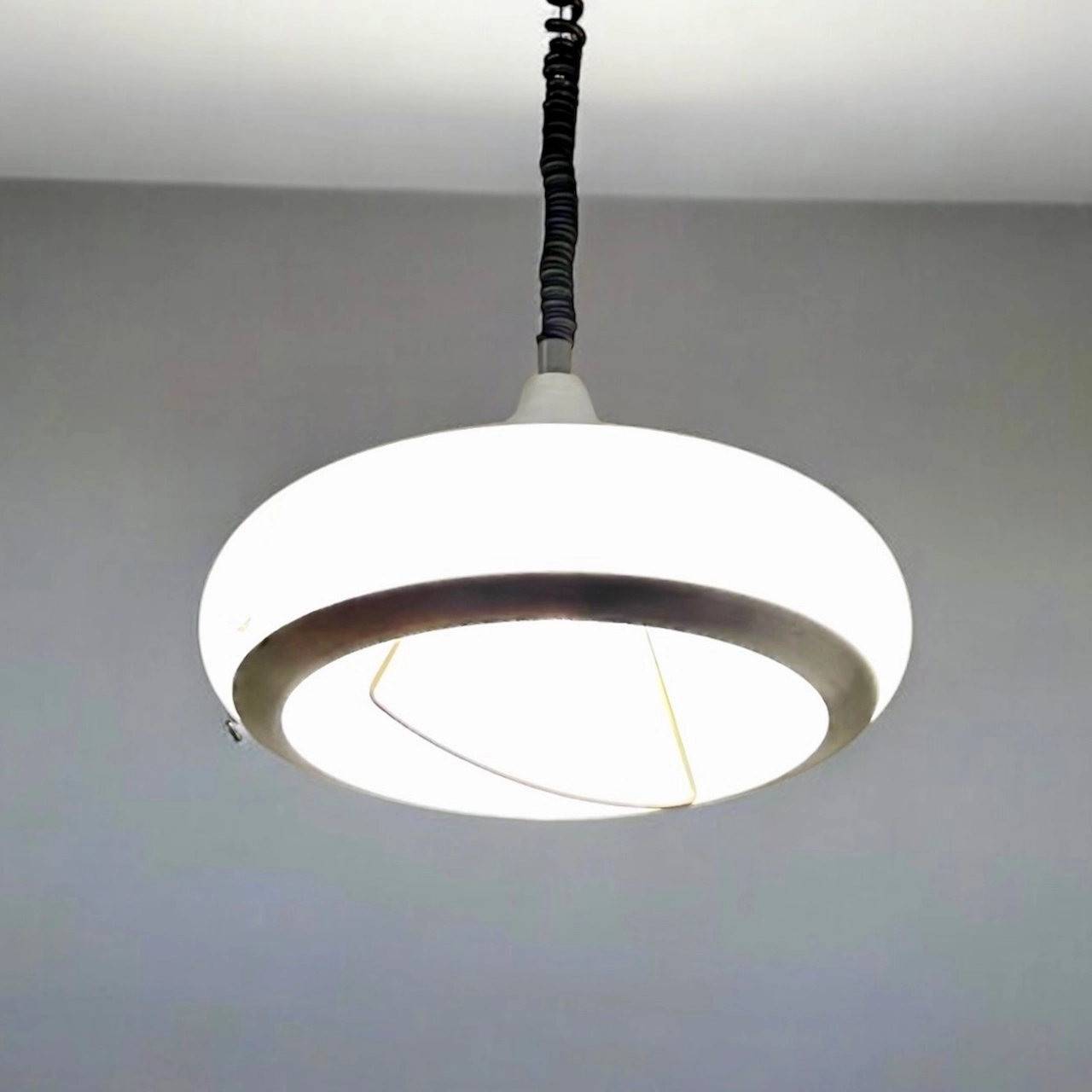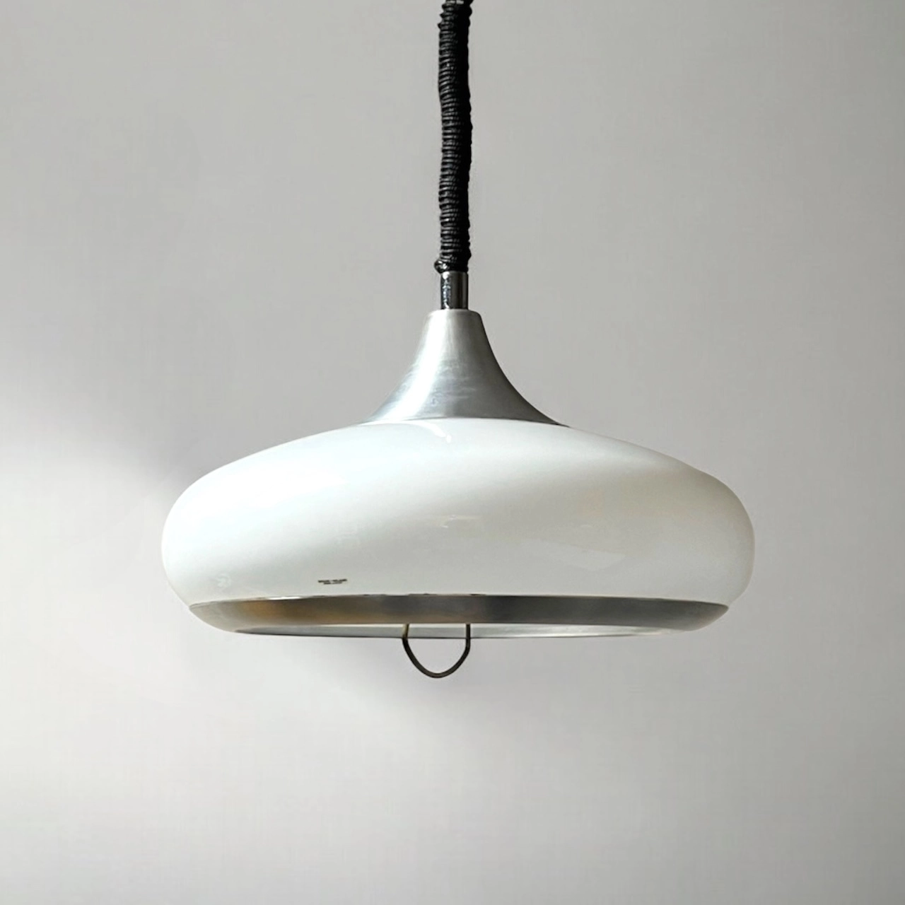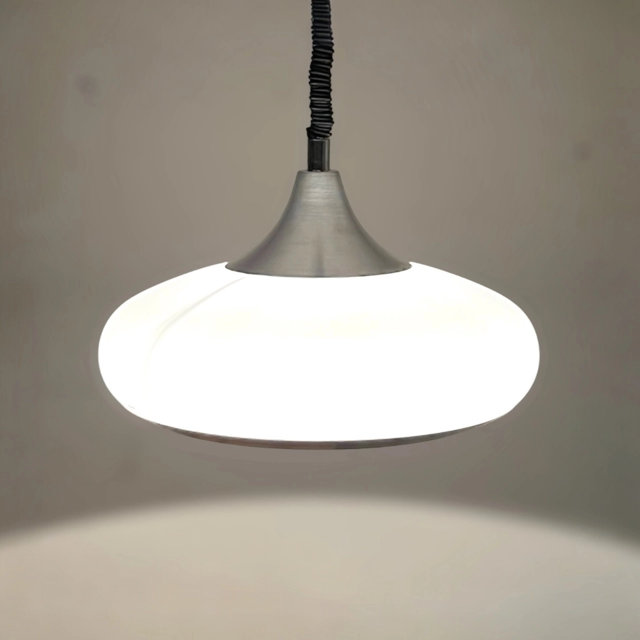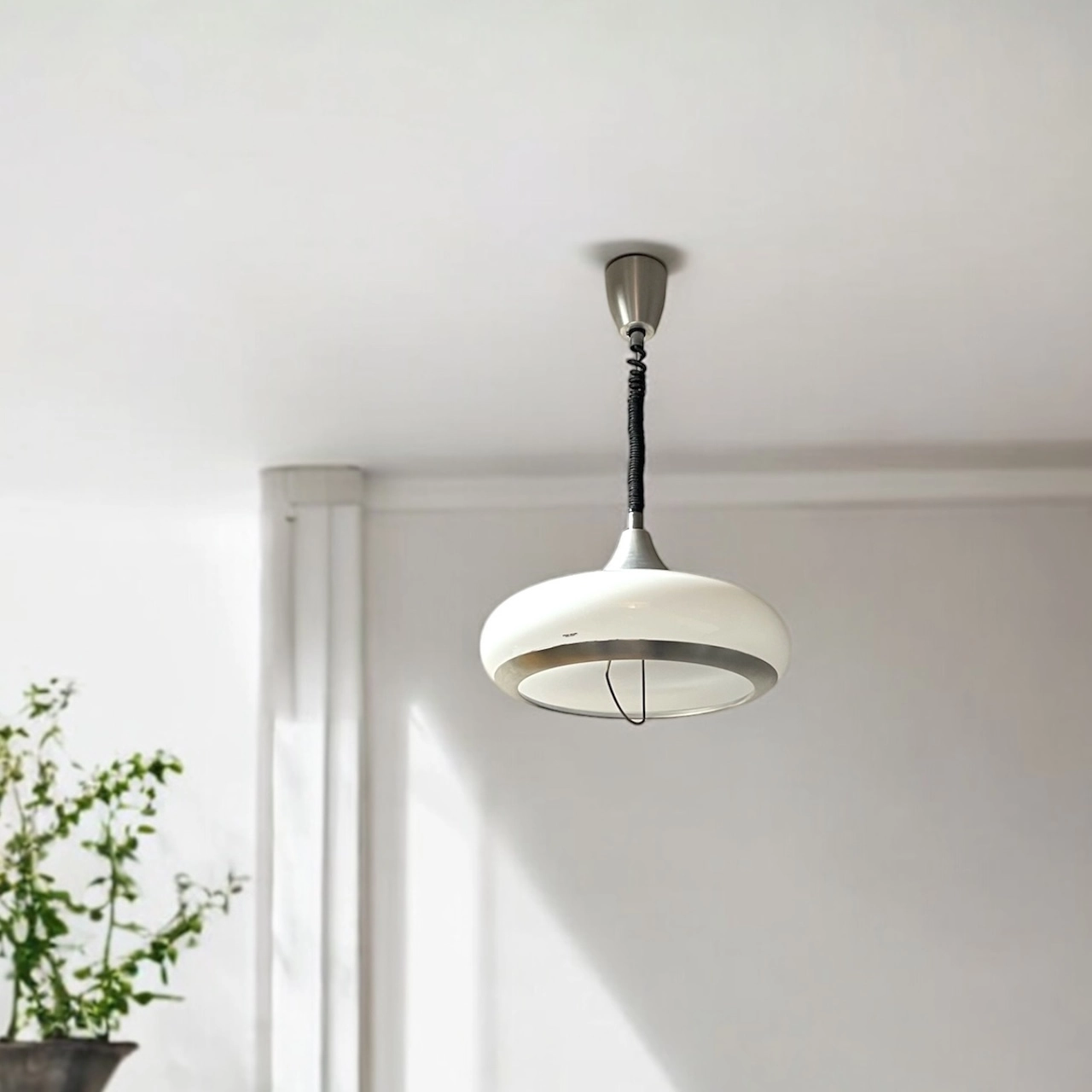 Iconic 70s space age pendant lamp by Stilux Milano, made of a conic silver metal top that supports a translucent white polymethacrylate lampshade. Amazing visual impact!