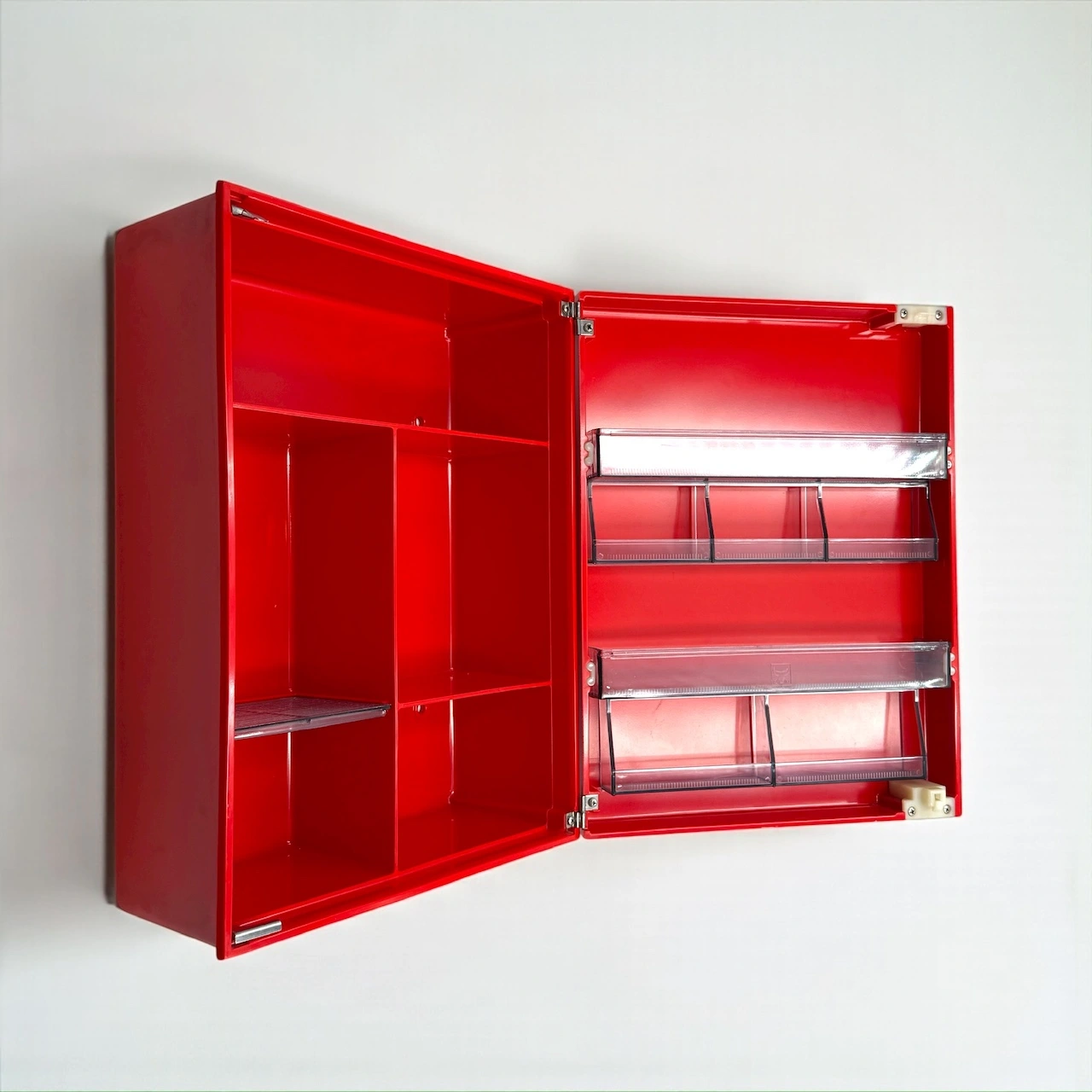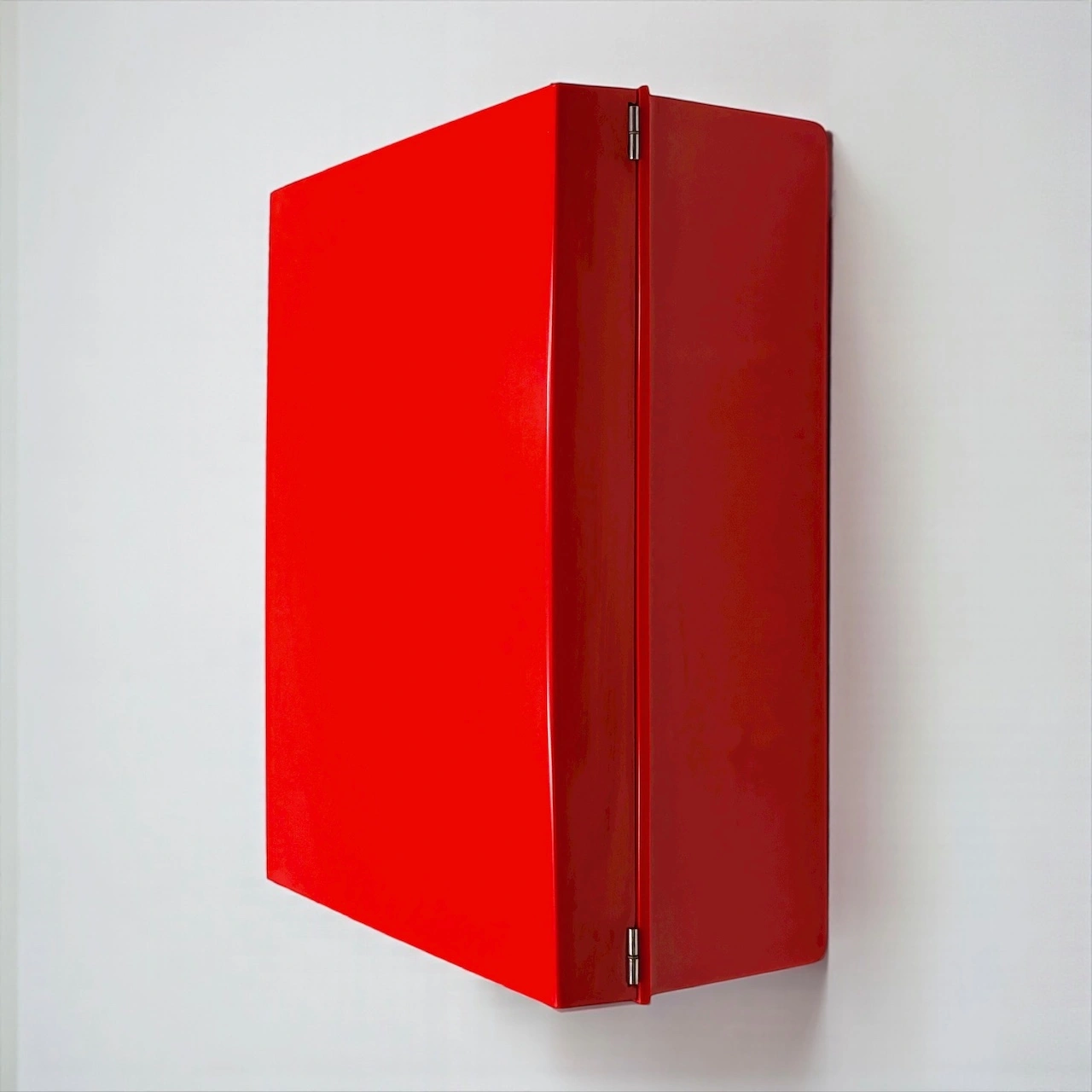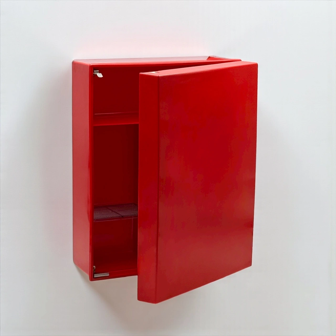 This red bakelite wall cabinet was made in the 1970s by Carrara and Matta, leaders in Italian plastic design. The “Frejus” model shows their love for clear shapes and bright color. It captures the playful Space Age style of that decade, when design became modern, light, and fun.