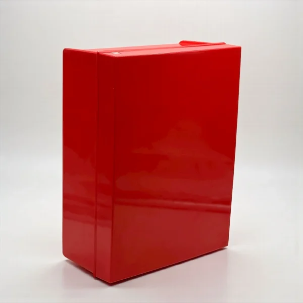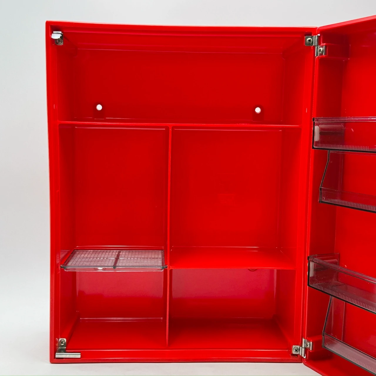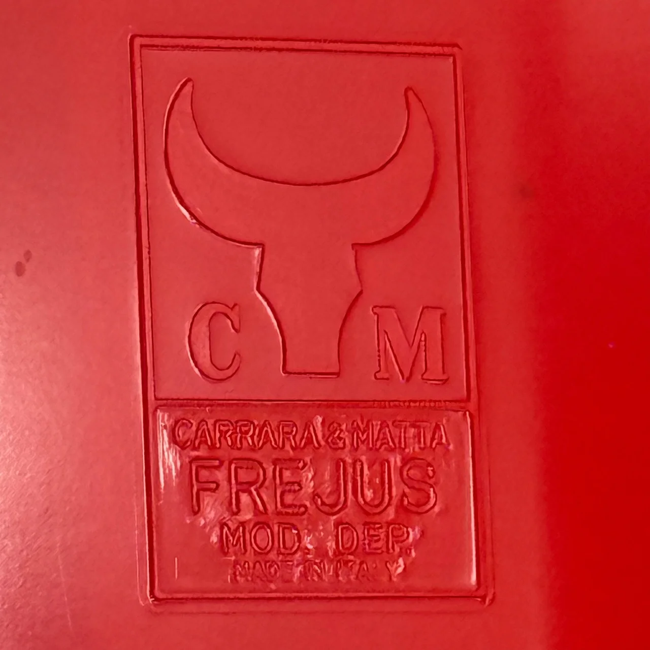 This red bakelite wall cabinet was made in the 1970s by Carrara and Matta, leaders in Italian plastic design. The “Frejus” model shows their love for clear shapes and bright color. It captures the playful Space Age style of that decade, when design became modern, light, and fun.