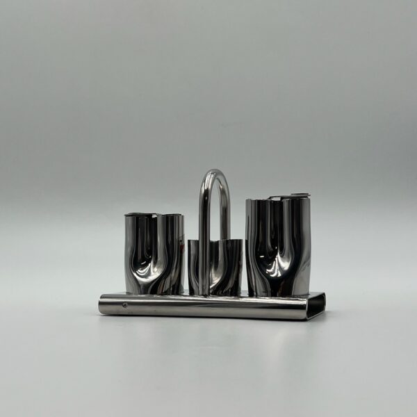 Rare and refined 70s stainless steel menage / condiment set made by Stella in Italy. Perfectly preserved, with shining chrome finish.