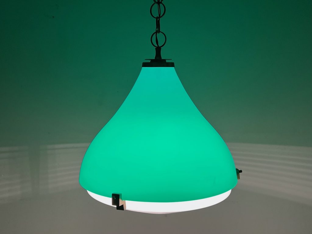 A beautiful and large green pendant lamp made in the 1960s with a big emerald green plastic lampshade and brass and metal details. Thanks to its large size, this lamp is a perfect complement of big rooms and lofts. The visual effect is amazing, also when the lamp is switched off. Moreover, this lamp provides a charming and distinctive lighting thanks to its green lampshade and white diffuser.