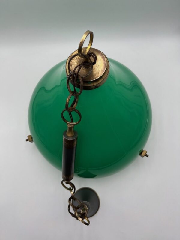 A beautiful, majestic 60s hanging lamp with a big emerald green lampshade and brass / metal details.