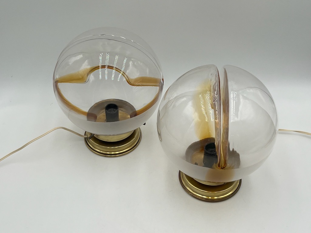 Lovely pair of Murano glass 60s artisanal lamps attributable to Antica Vetreria Mazzega. Beautiful glass lampshade and brass base.