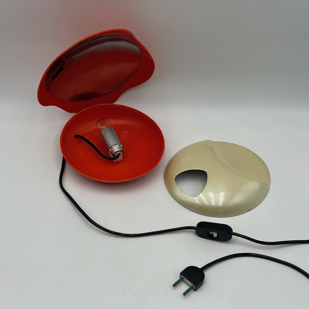 item. table lampmodel. oyster / ostricamaker. Gamma 3 period. 1970scountry. Italymaterial. plasticcolor. orange, whitedimensions (cm). 23 x 22 x 7condition. excellent conditions. minor and hardly visible signs of time.art. no. 1064