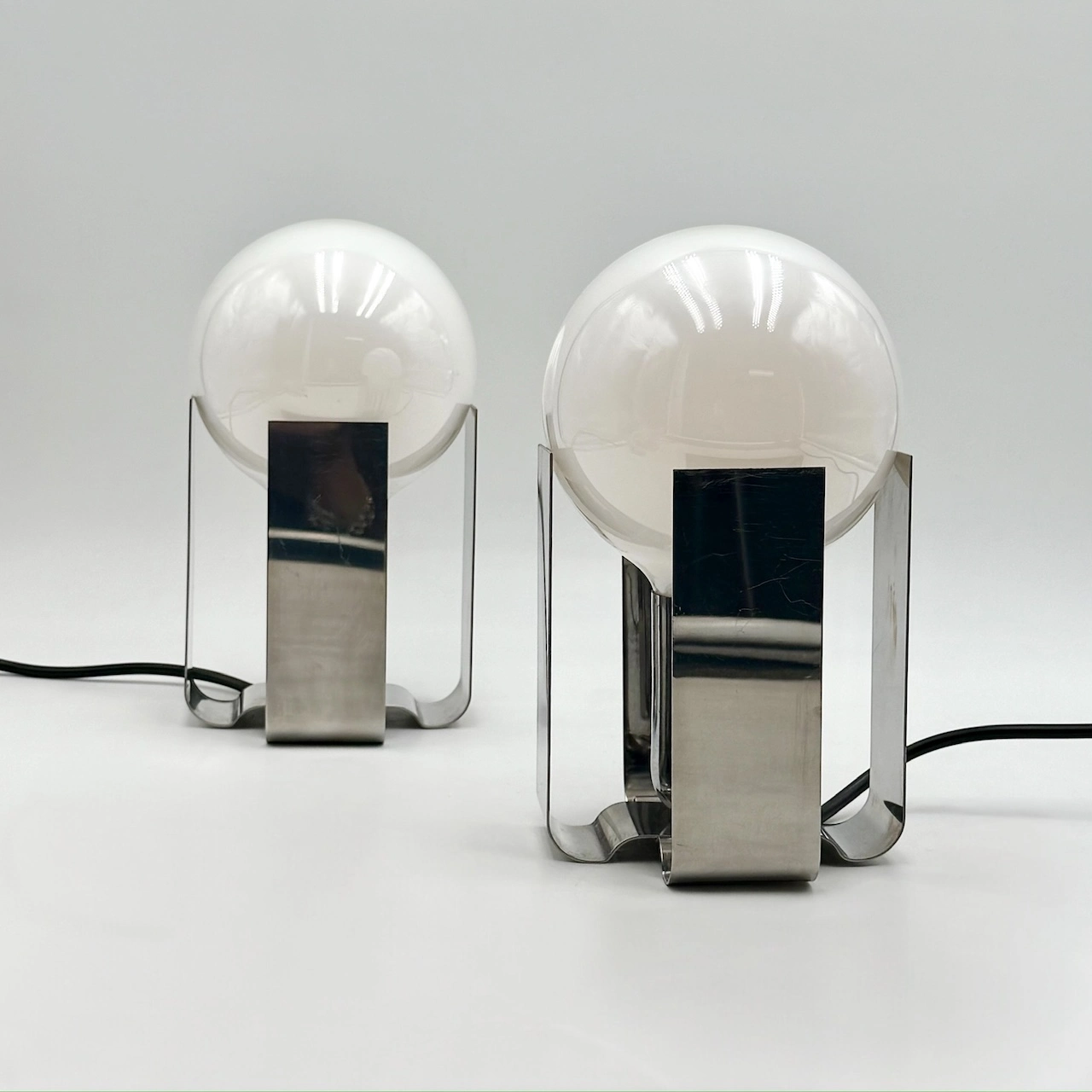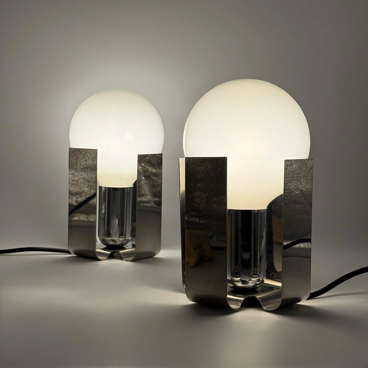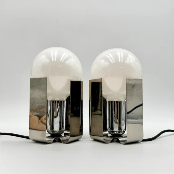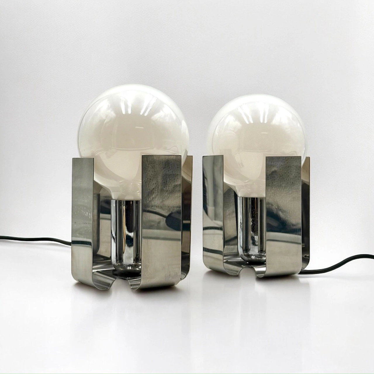 Crafted from bent sheets of chromed stainless steel, each lamp elegantly cradles a large opaline bulb, creating a bold yet refined visual presence. The polished surfaces reflect light beautifully, while the sculptural form channels the futuristic flair typical of early 70s Italian design.