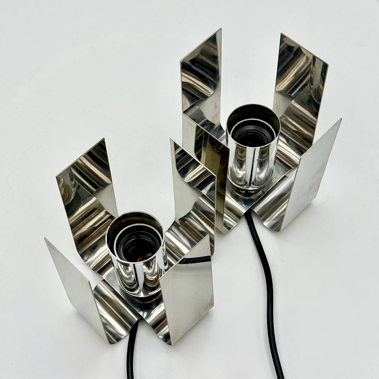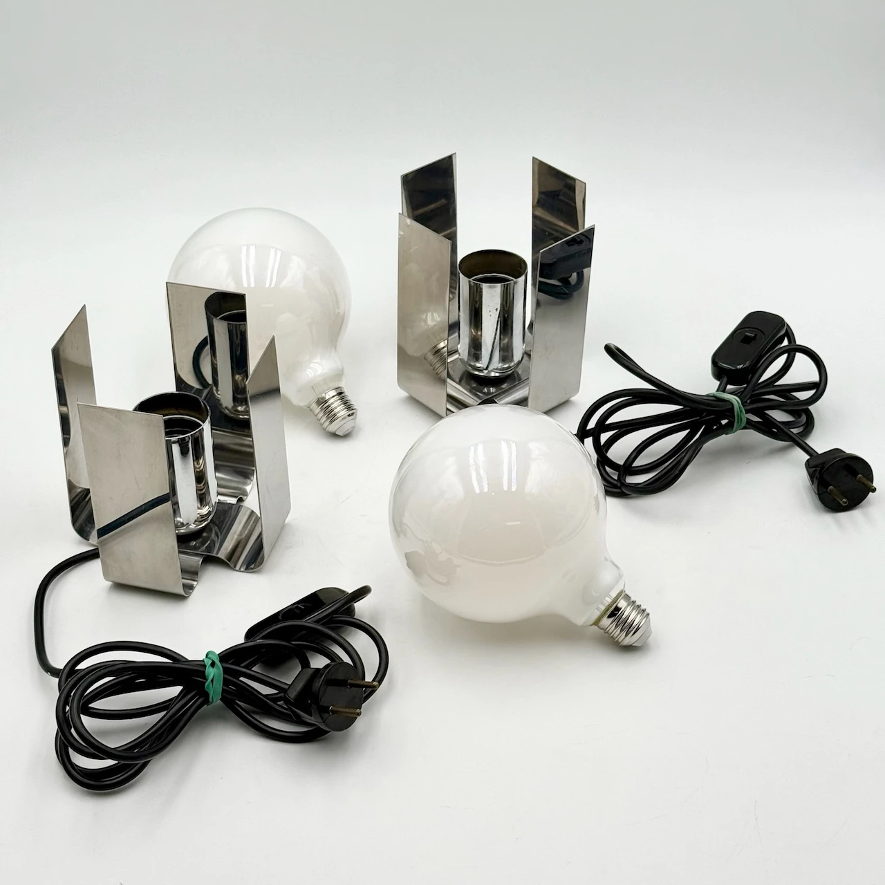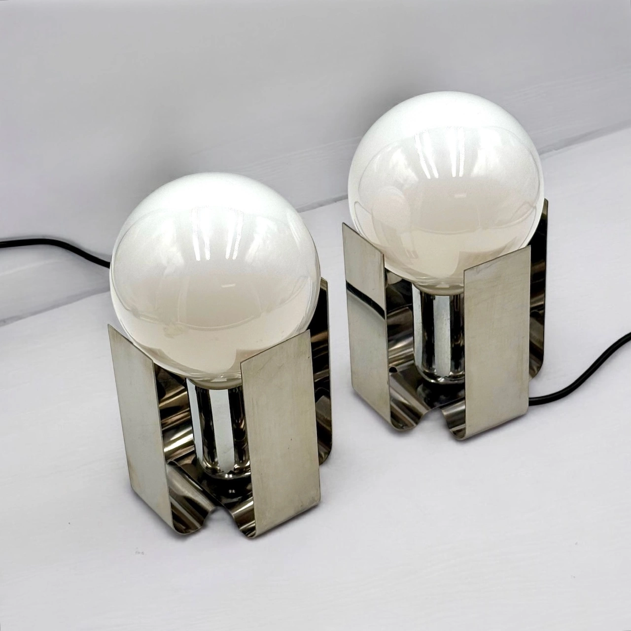 Crafted from bent sheets of chromed stainless steel, each lamp elegantly cradles a large opaline bulb, creating a bold yet refined visual presence. The polished surfaces reflect light beautifully, while the sculptural form channels the futuristic flair typical of early 70s Italian design.