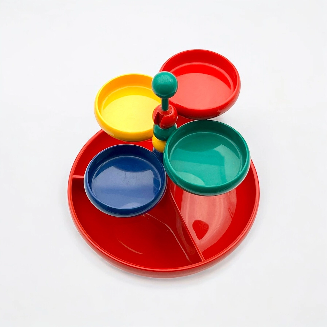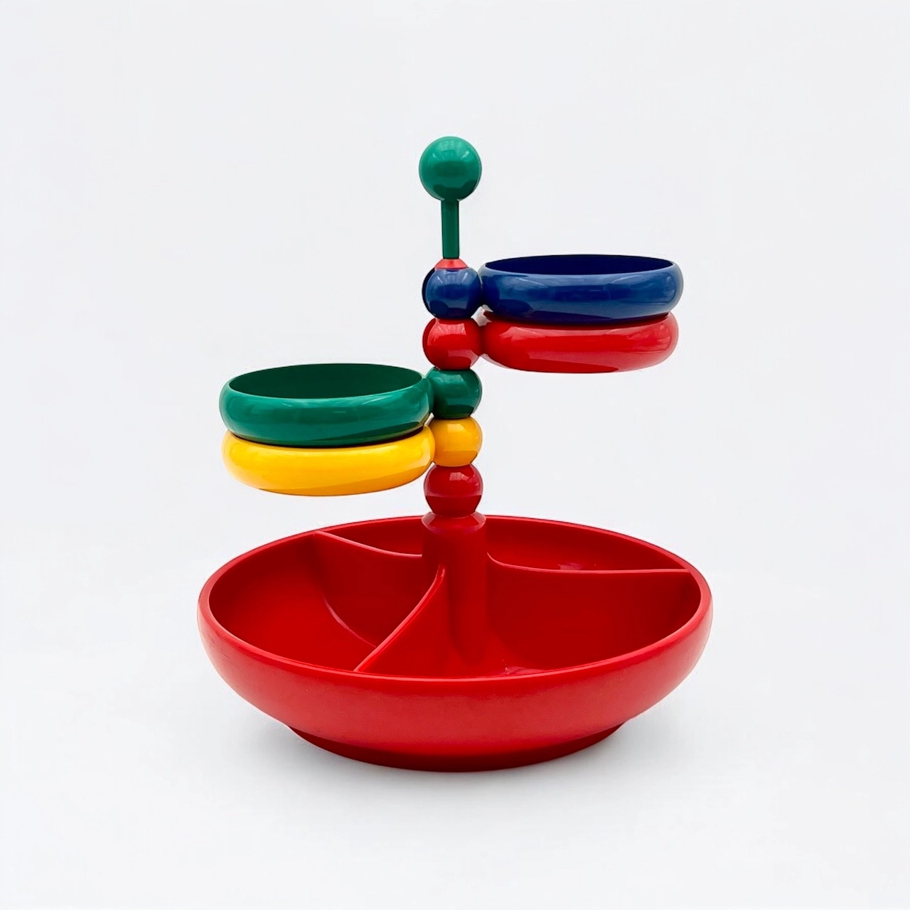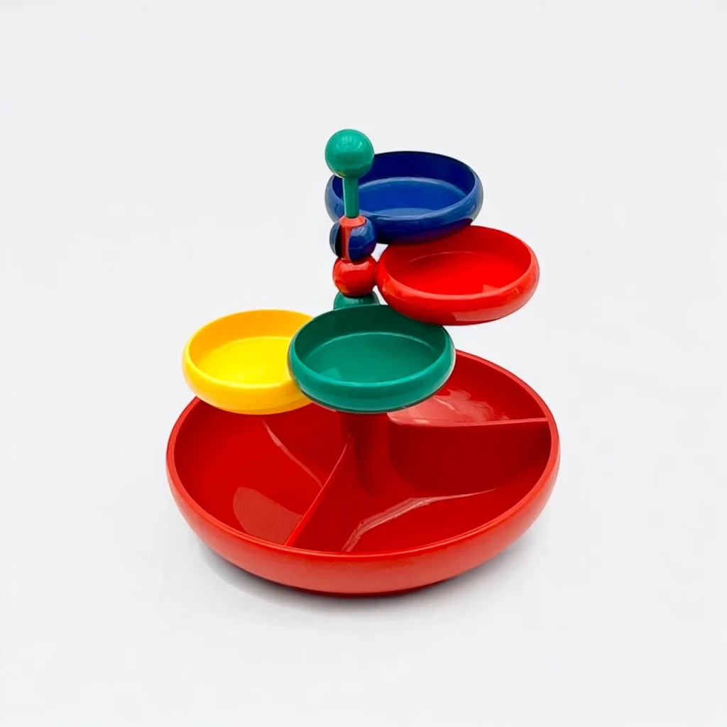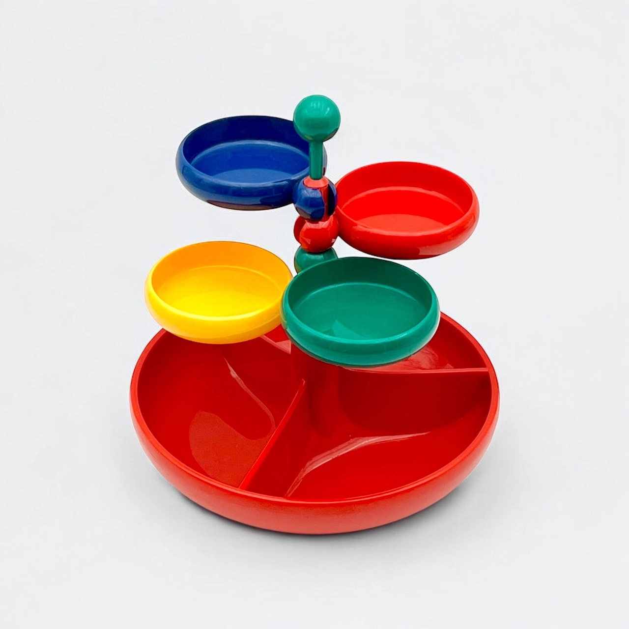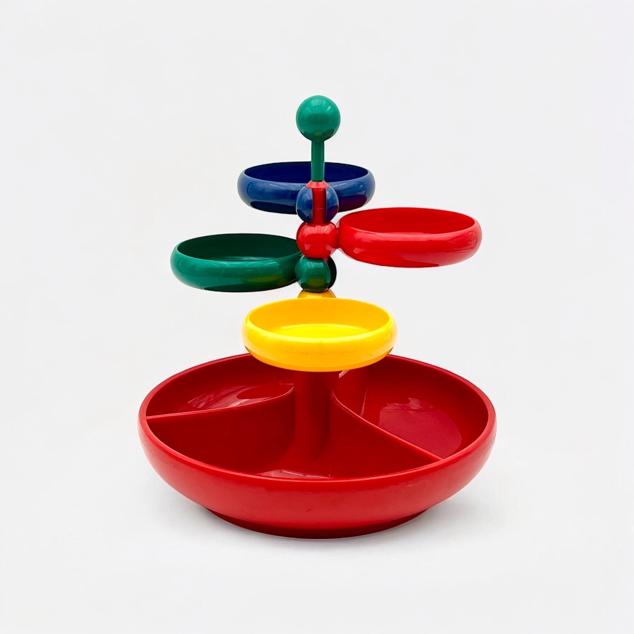 A true space age gem, this sculptural serving piece features curvy, glossy plastic components in striking primary colors—red, yellow, green, and blue. The design includes a large red base divided into sections, topped with four pivoting and removable trays that offer versatility and convenience for serving snacks, antipasti, or small objects.