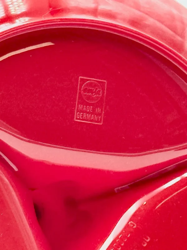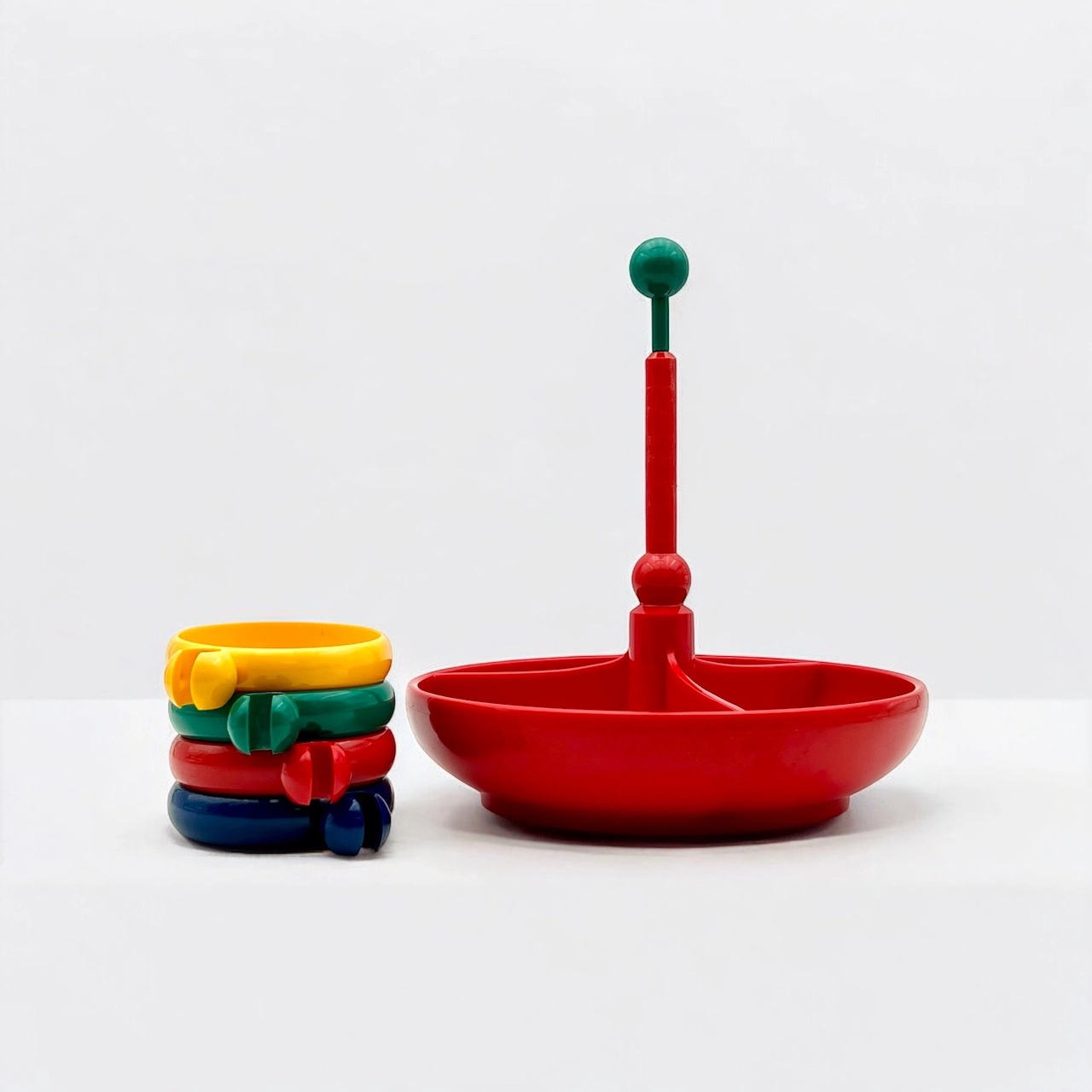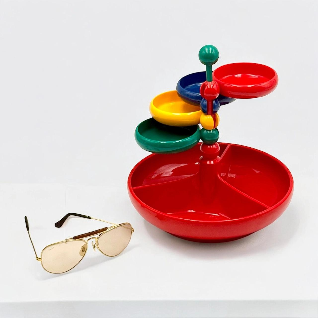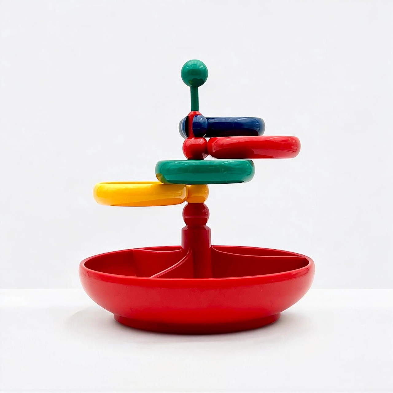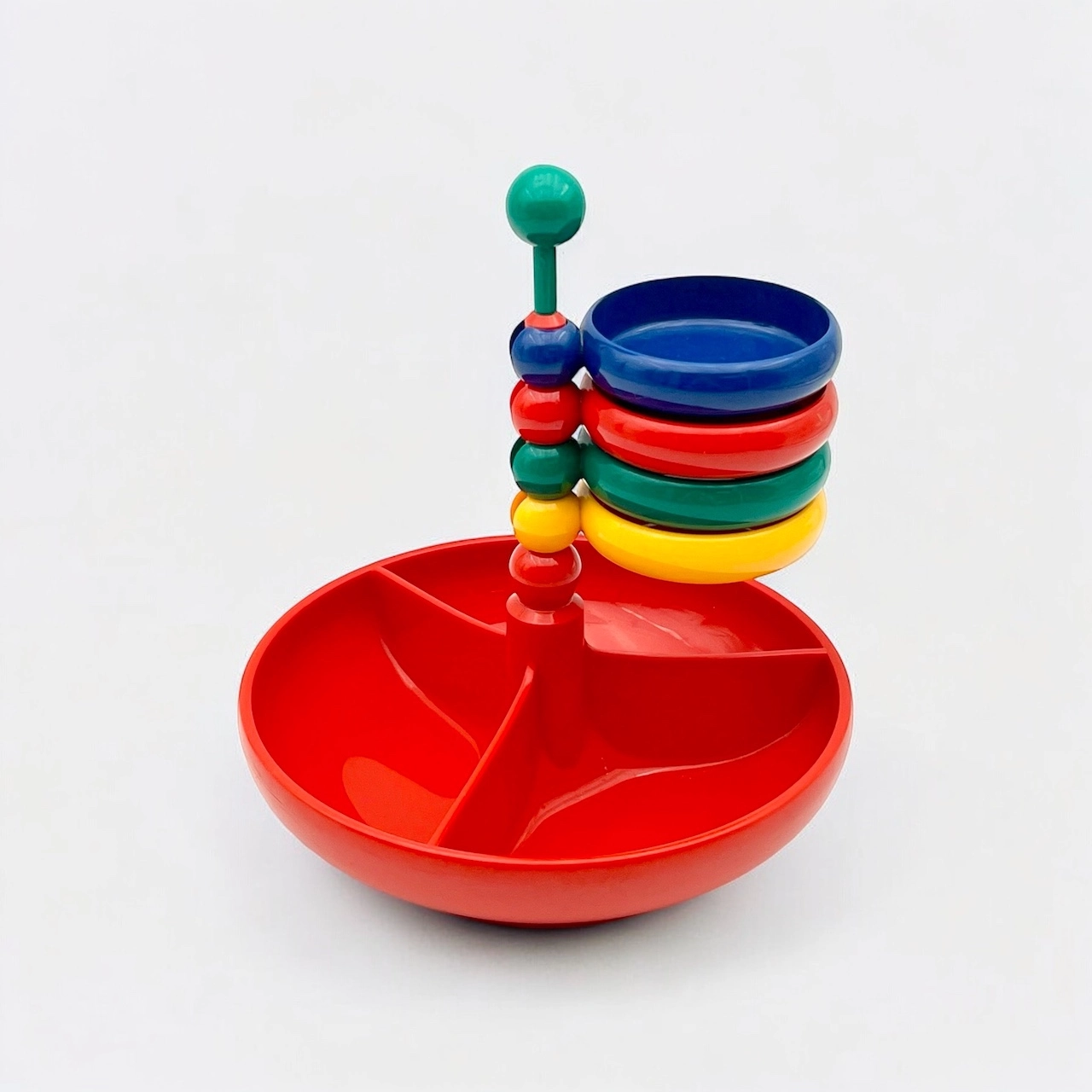 A true space age gem, this sculptural serving piece features curvy, glossy plastic components in striking primary colors—red, yellow, green, and blue. The design includes a large red base divided into sections, topped with four pivoting and removable trays that offer versatility and convenience for serving snacks, antipasti, or small objects.
