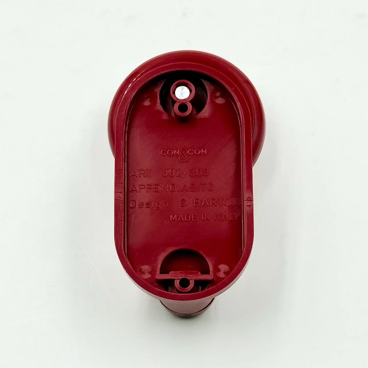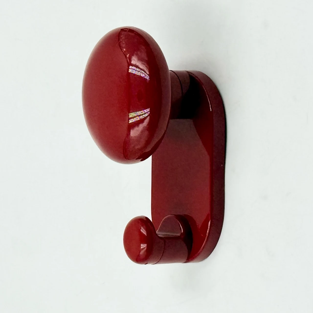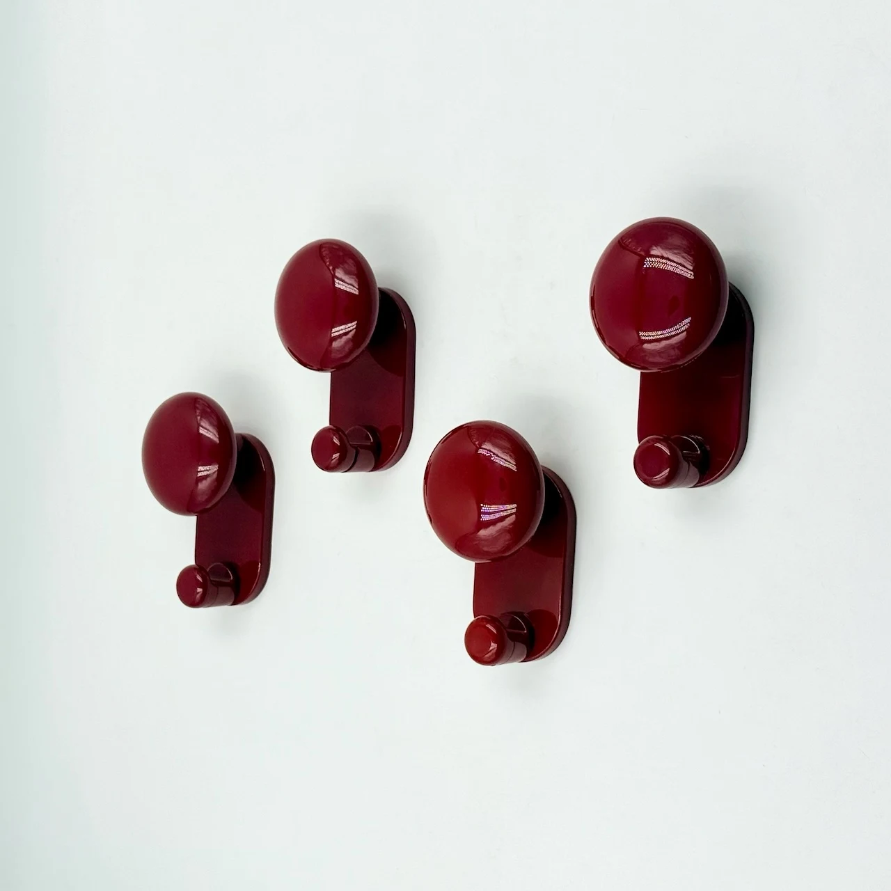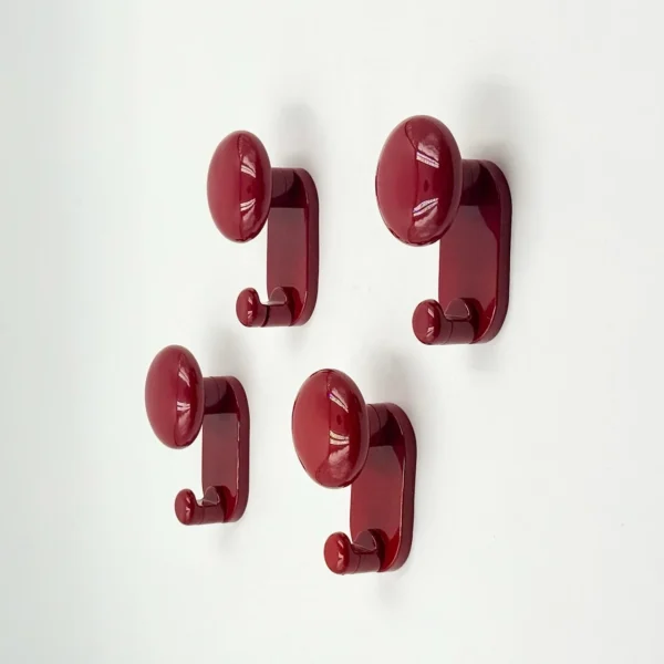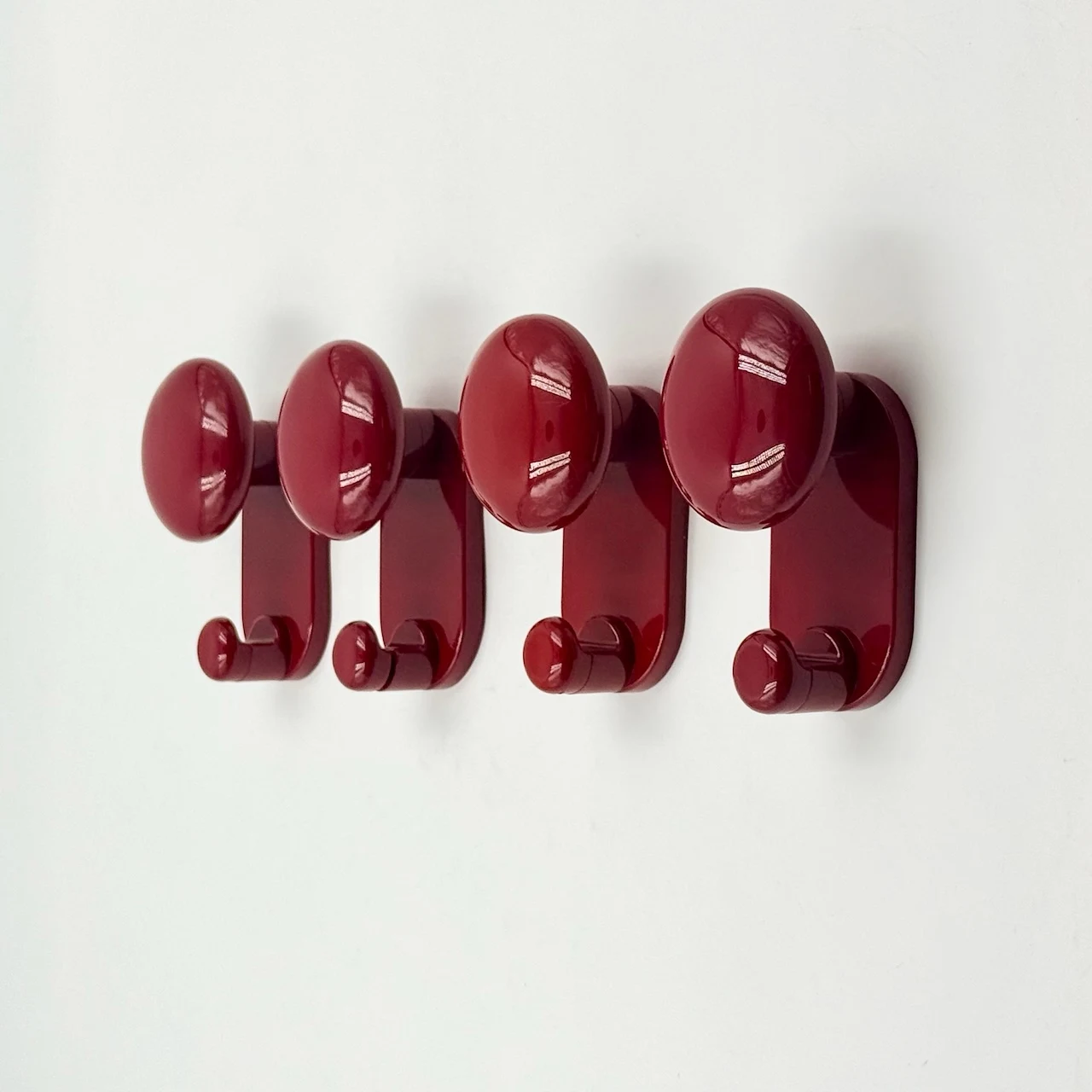 The glossy plastic features a rich deep red tone adding warmth and depth to the composition and transforming a purely functional object into a strong architectural accent. Used together, the four hooks create a rhythmic wall installation — both practical and visually structured.
