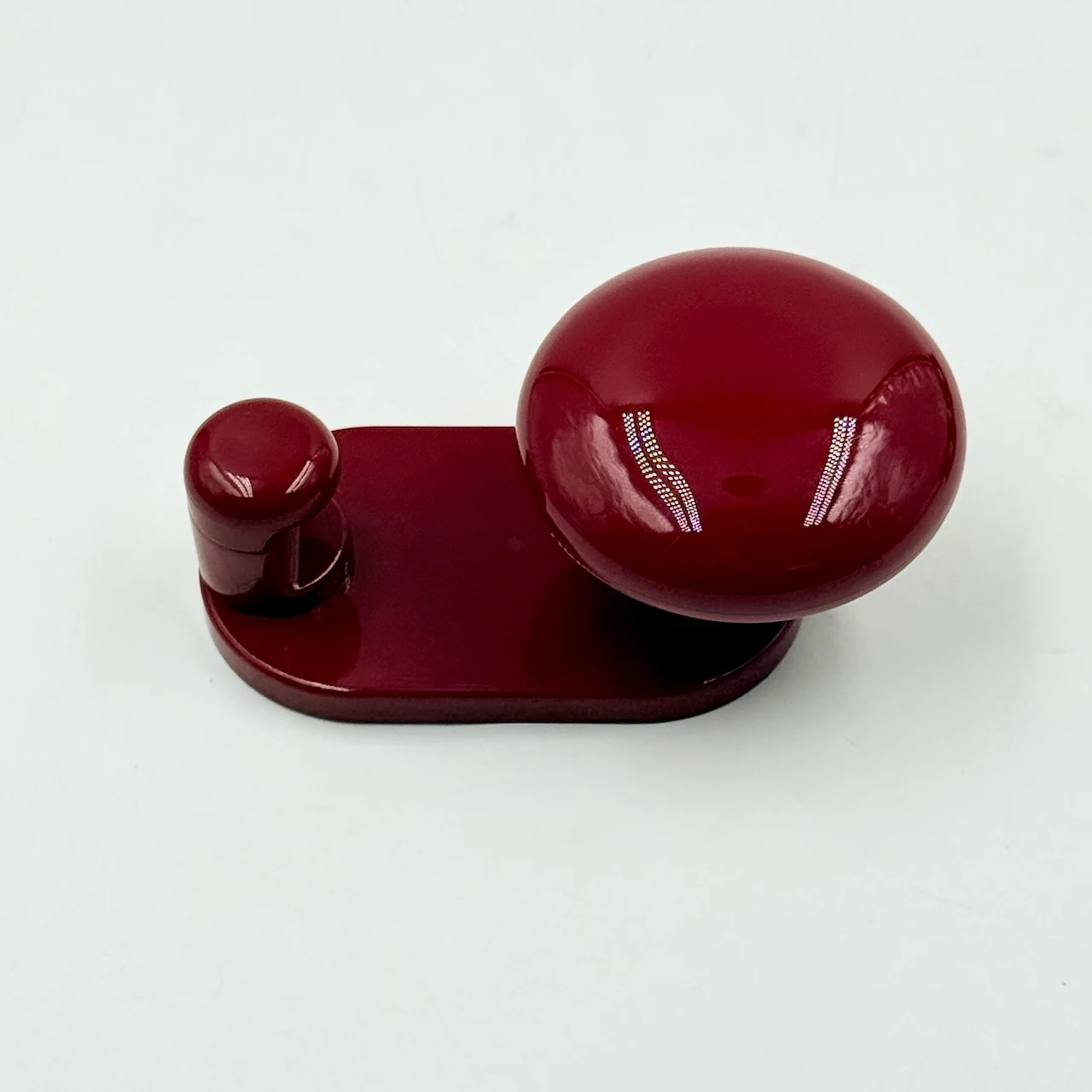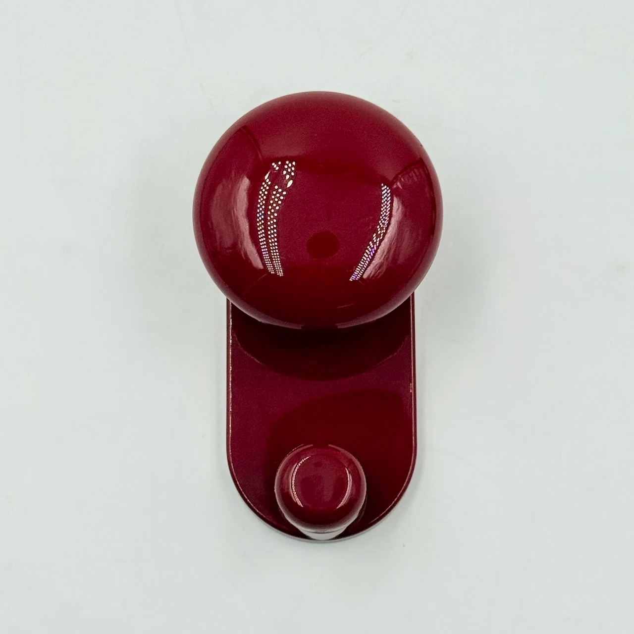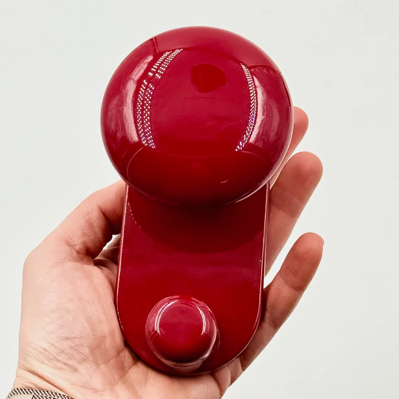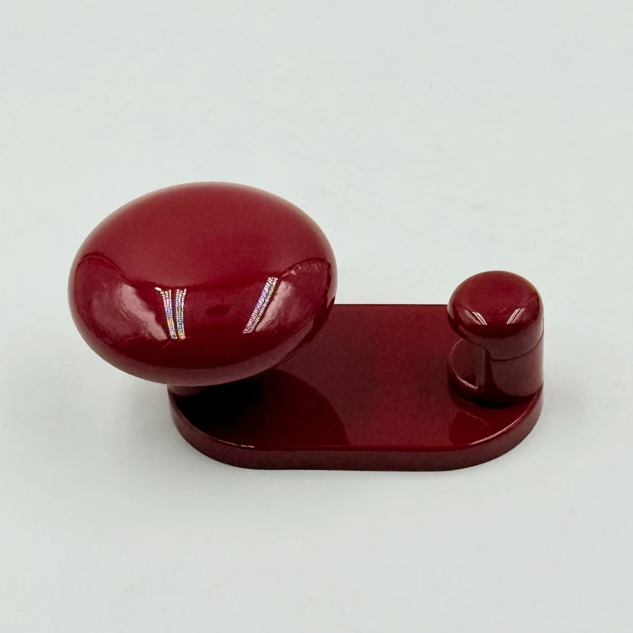 The glossy plastic features a rich deep red tone adding warmth and depth to the composition and transforming a purely functional object into a strong architectural accent. Used together, the four hooks create a rhythmic wall installation — both practical and visually structured.