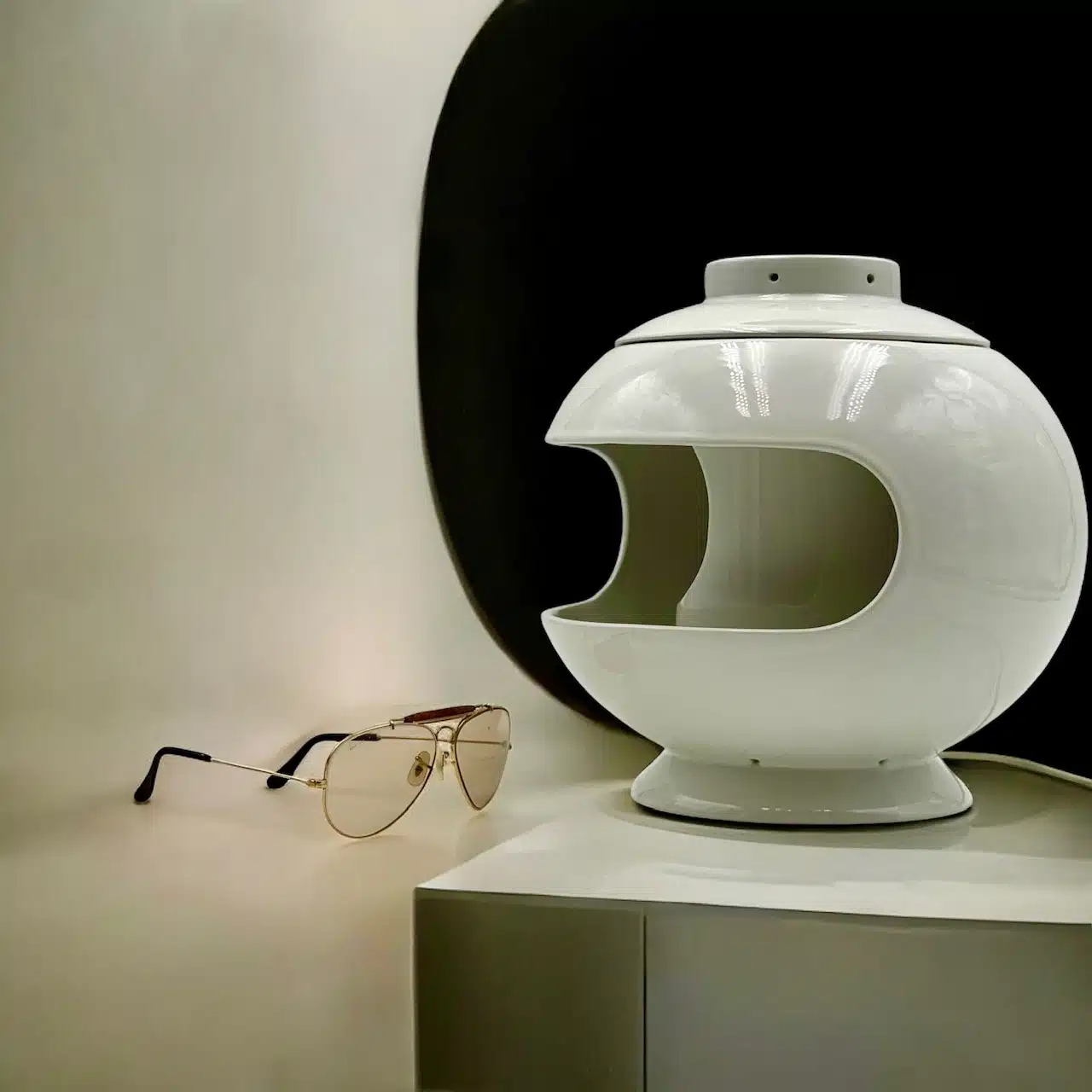 This rare ceramic Space Age lamp, signed SC3 Italy, was produced between the late 1960s and early 1970s and stands out as a bold example of sculptural lighting design. Made entirely of glazed ceramic, the lamp features a spherical body with a large frontal opening and a rotating internal disc that allows the user to modulate the intensity and direction of light—evoking the poetic motion of an eclipse.