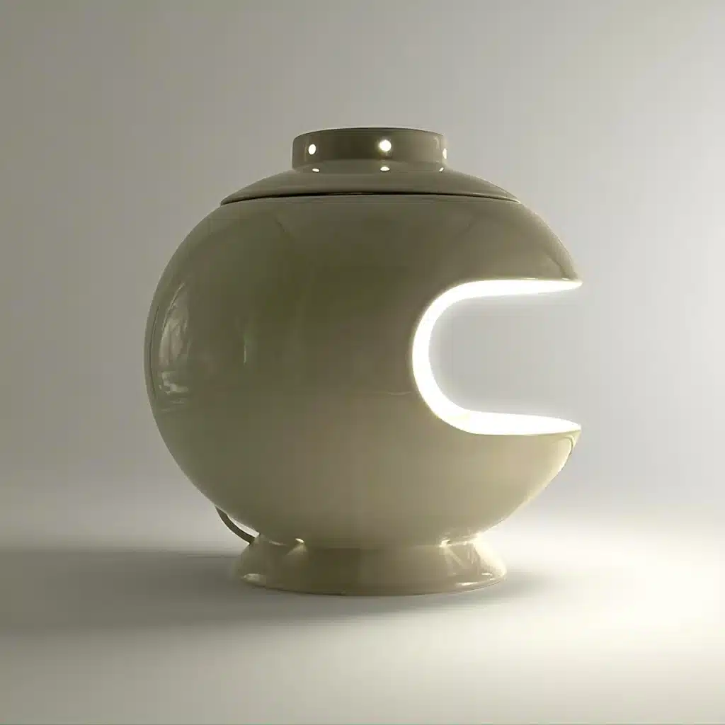 A rare ceramic Space Age lamp signed SC3, Italy. The rotating inner disc modulates light like an eclipse—bold, sculptural, and atmospheric. A stunning example of 1970s Italian design.