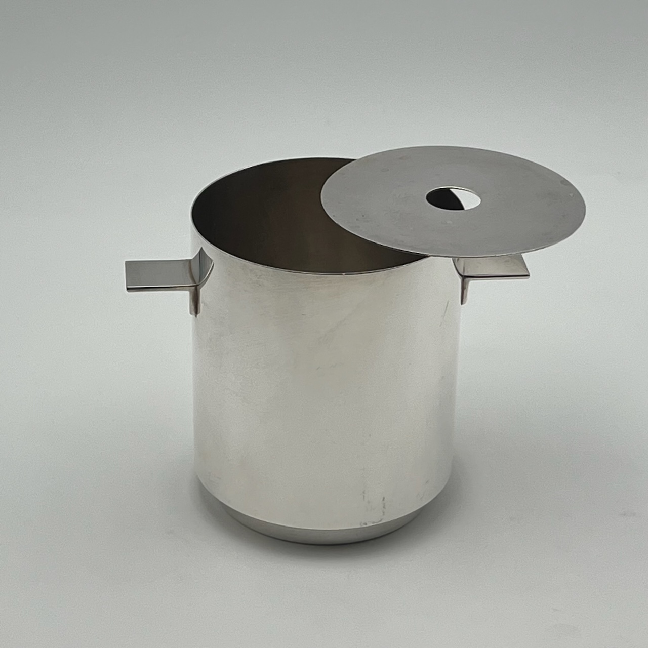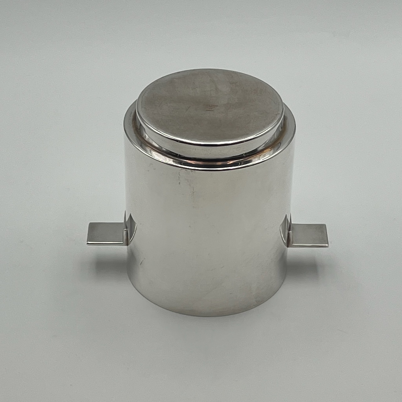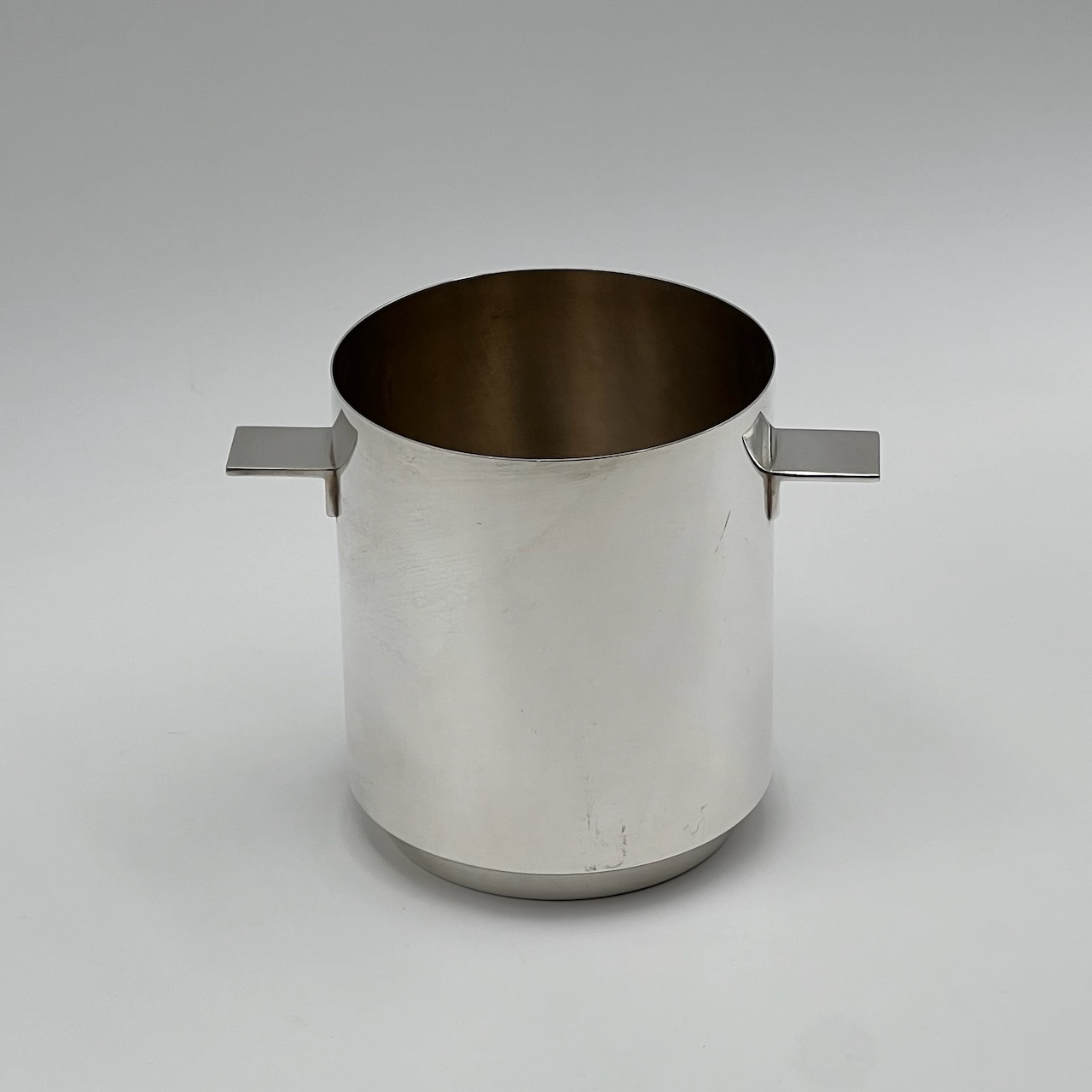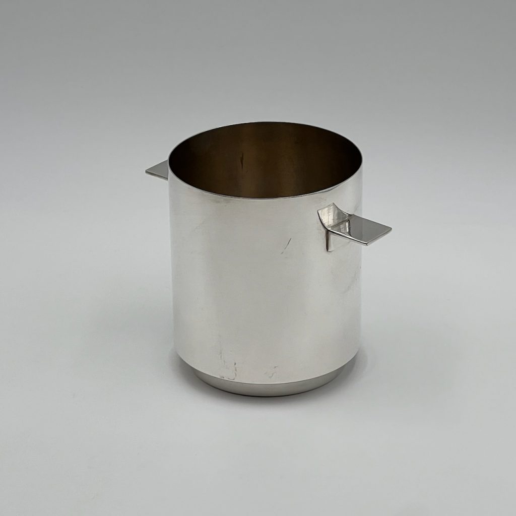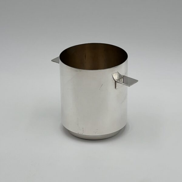 This rare and highly prized silver plated wine cooler or ice bucket has a modernist design in combination with the highly polished surfaces that really draws attention.