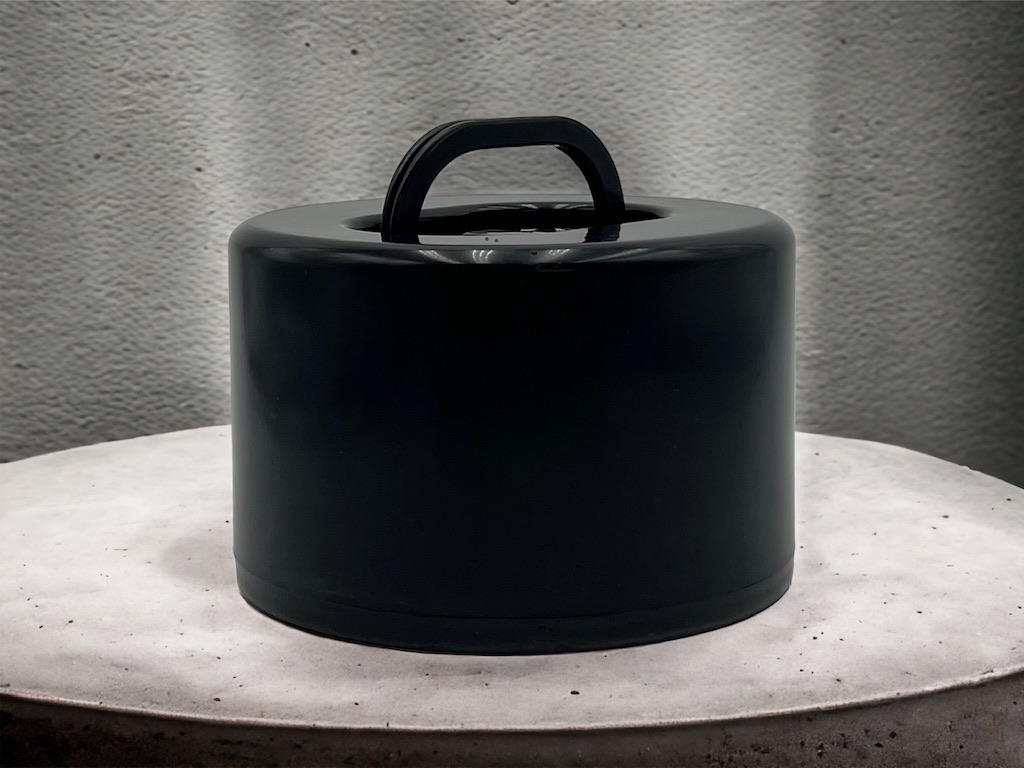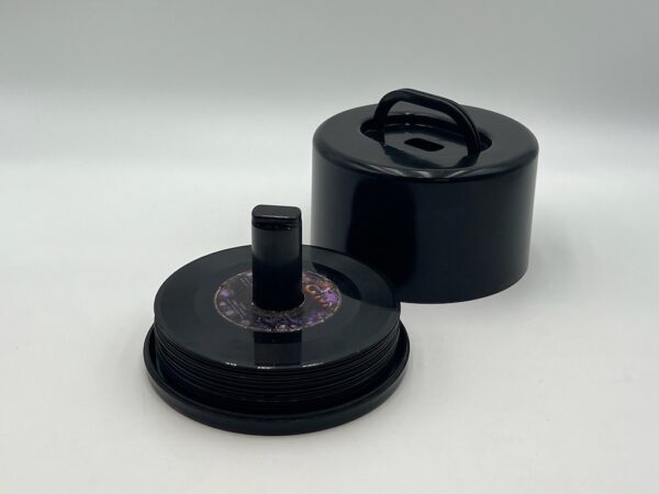 This rare vintage piece is made of high density plastic. The black color is the perfect match for the 45 RPM discs that can be stored in this container. The latch and handles are perfectly working.