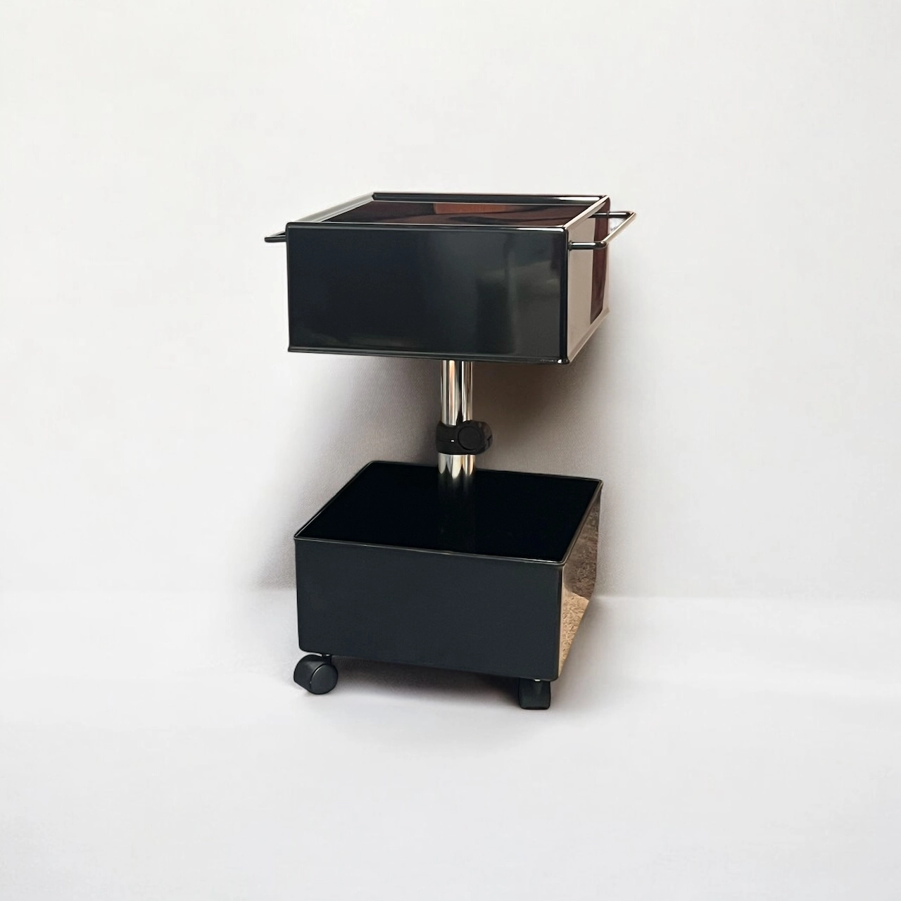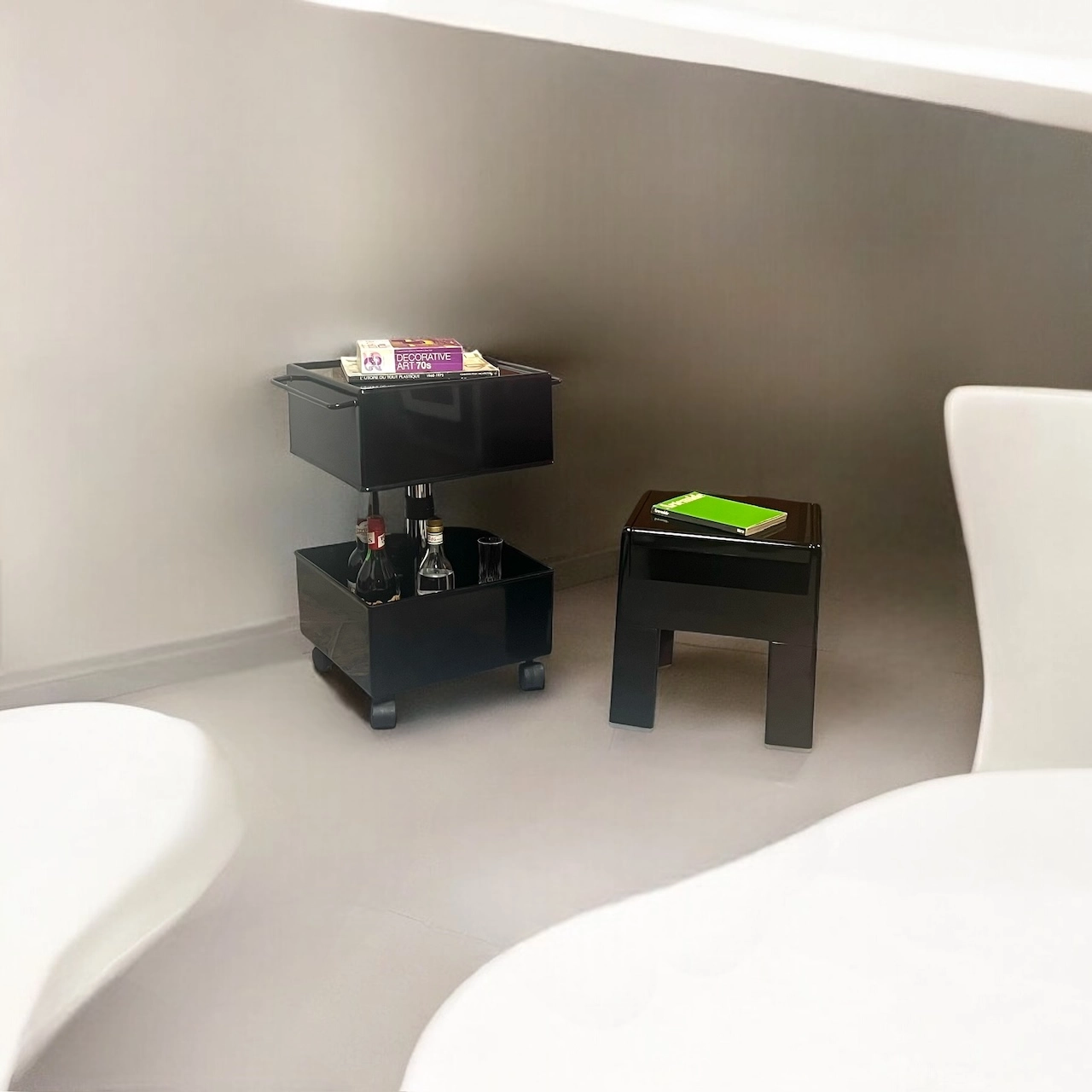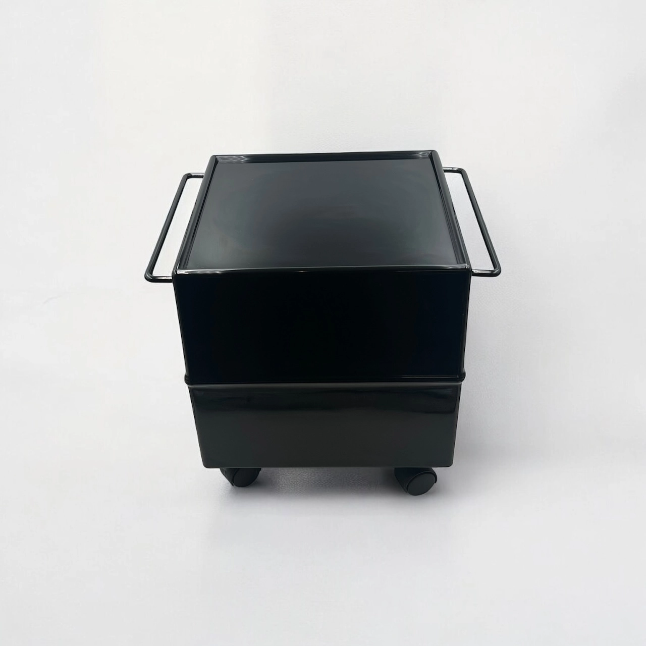 Rare 70s CUBO Mobile Bar / Serving Trolley in glossy black by Studio Magis, a versatile piece of Space Age furniture design that blends style and functionality.