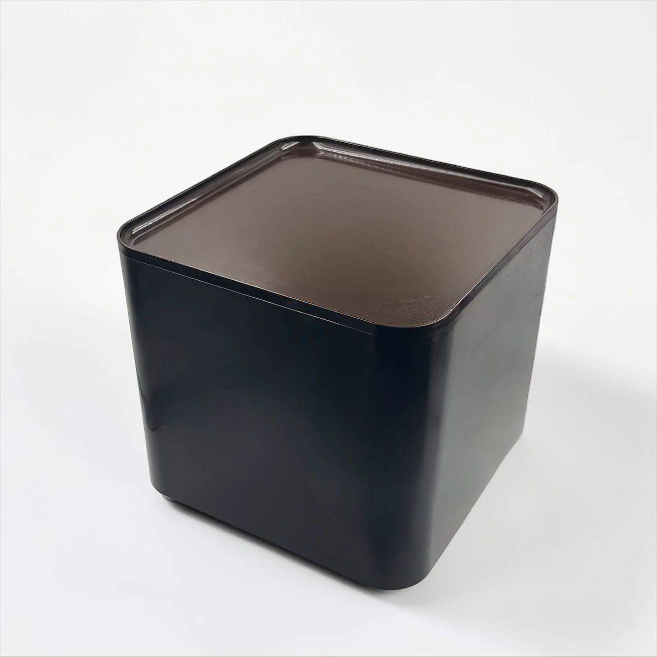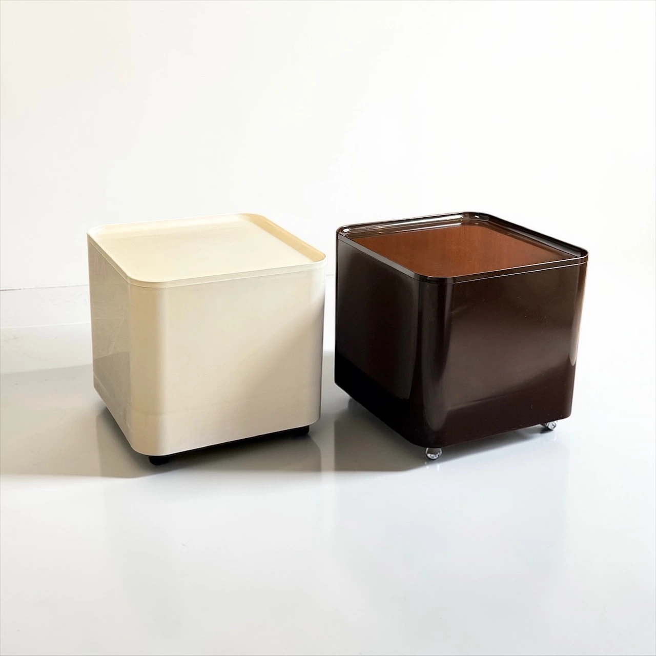 This pair of dime storage cube tables designed by Marcello Siard for Collezioni Longato in the 1970s represents an interesting example of Italian plastic furniture from the Space Age period. Produced in durable Novodur plastic, the objects reflect the experimental approach to materials that characterized much of Italian industrial design during the decade.