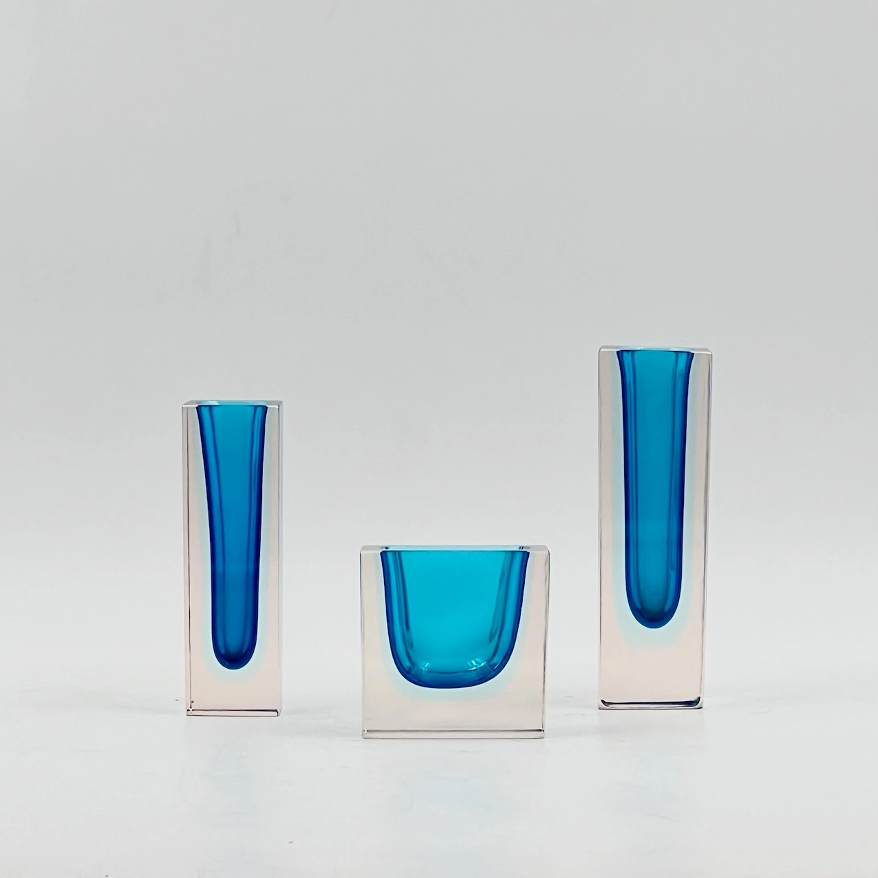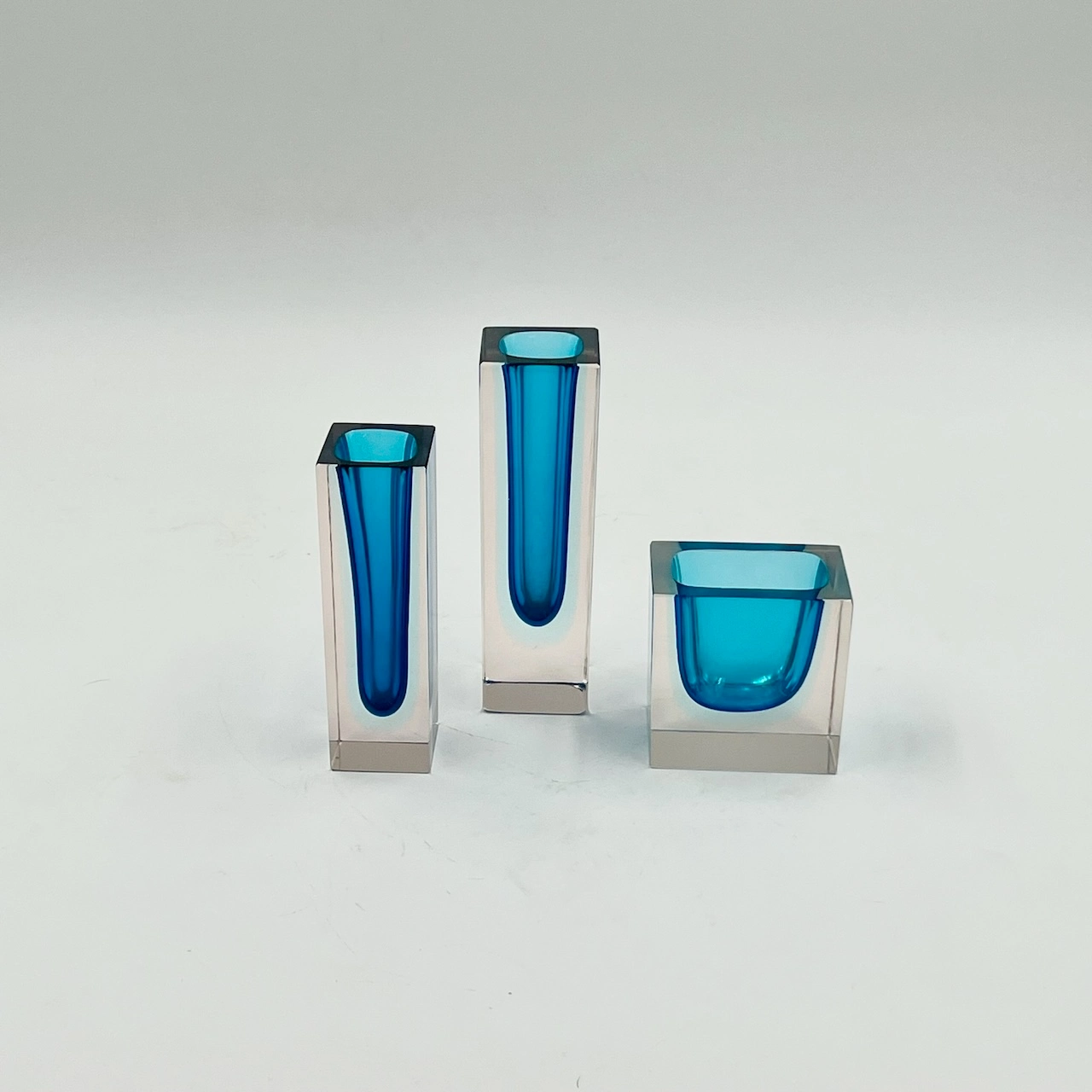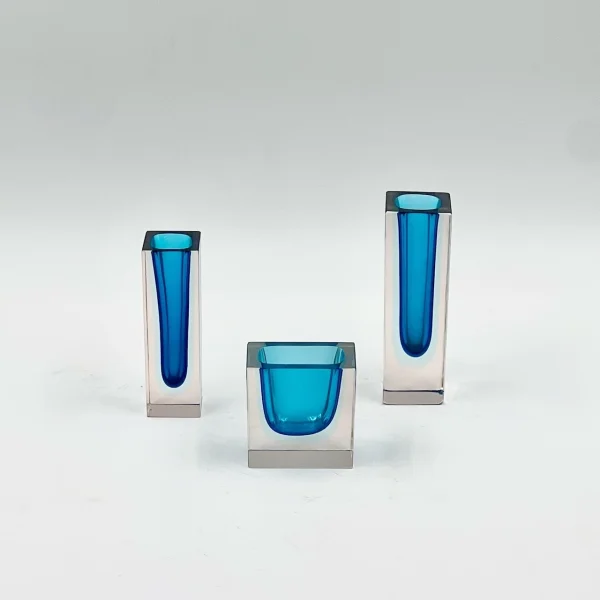 Beautiful trio of Murano Sommerso glass block vases. These vintage 1960s pieces feature stunning blue and pale azure tones, showcasing timeless Murano craftsmanship.